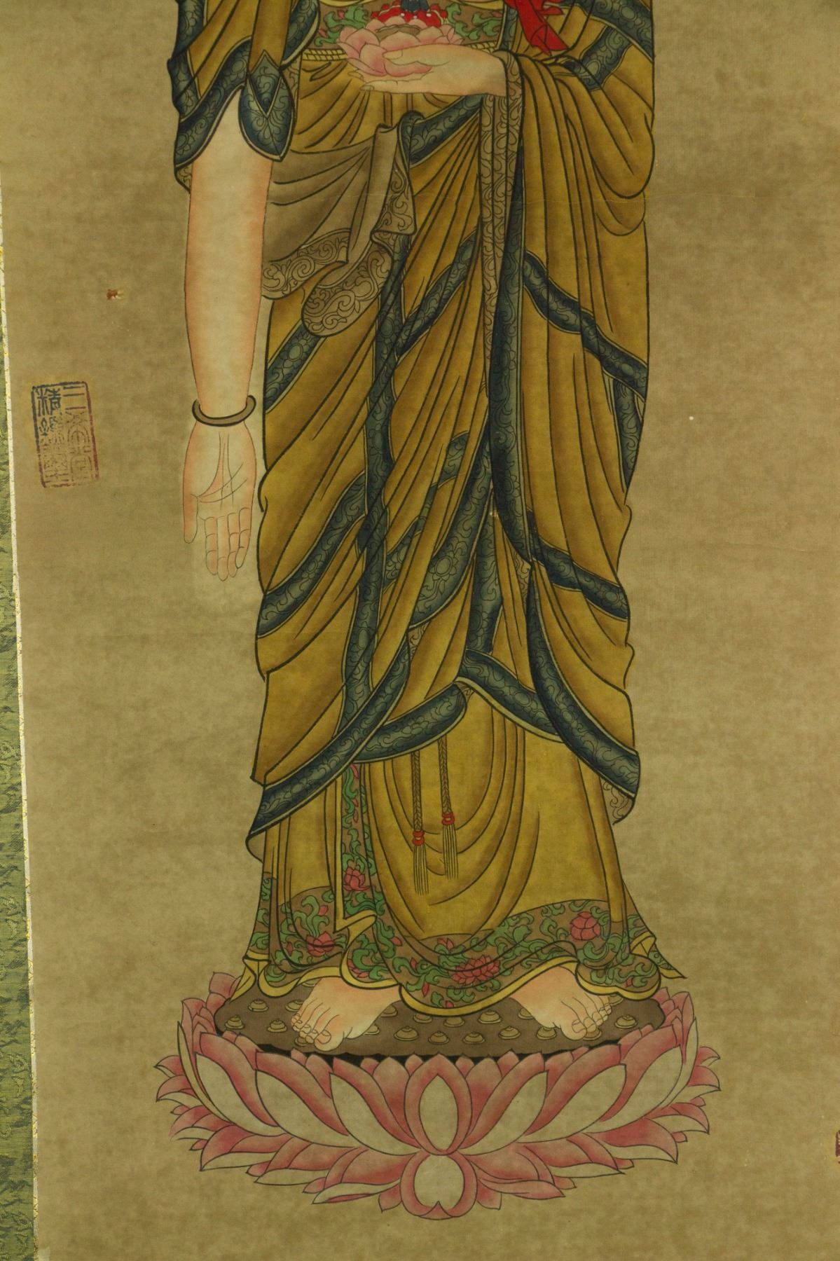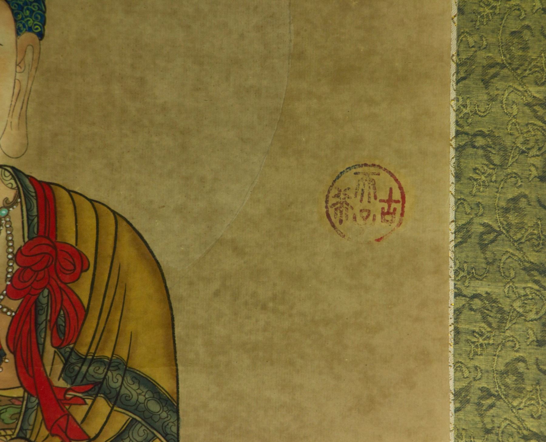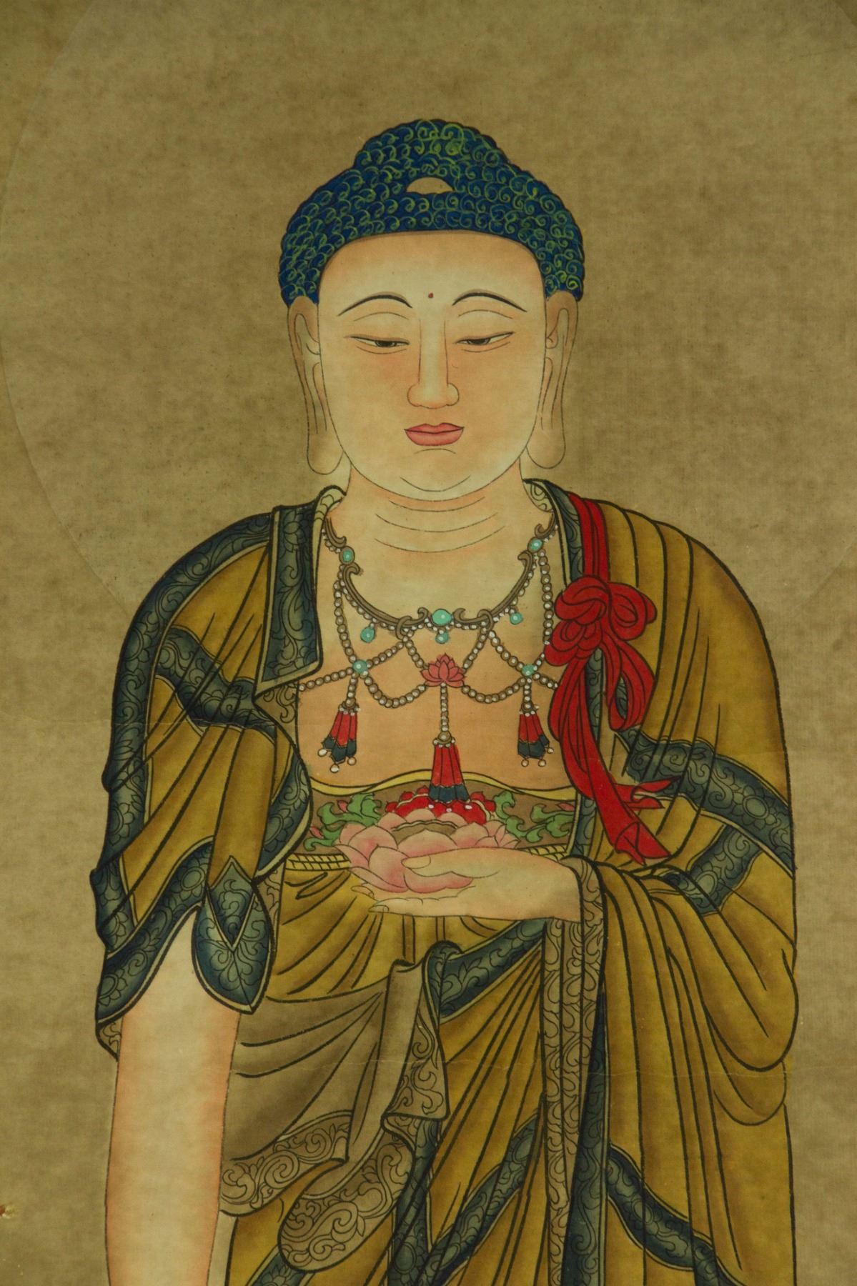 Gautama Buddha; Chinese ink and watercolour on silk; hanging scroll; inscribed with three red seals including one San Xi Tang seal; 183 cm × 61 cm