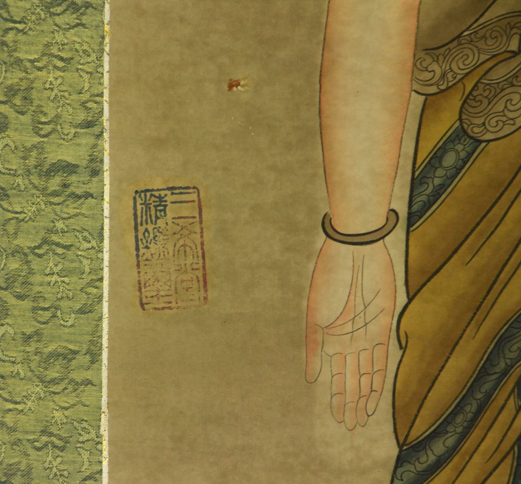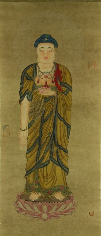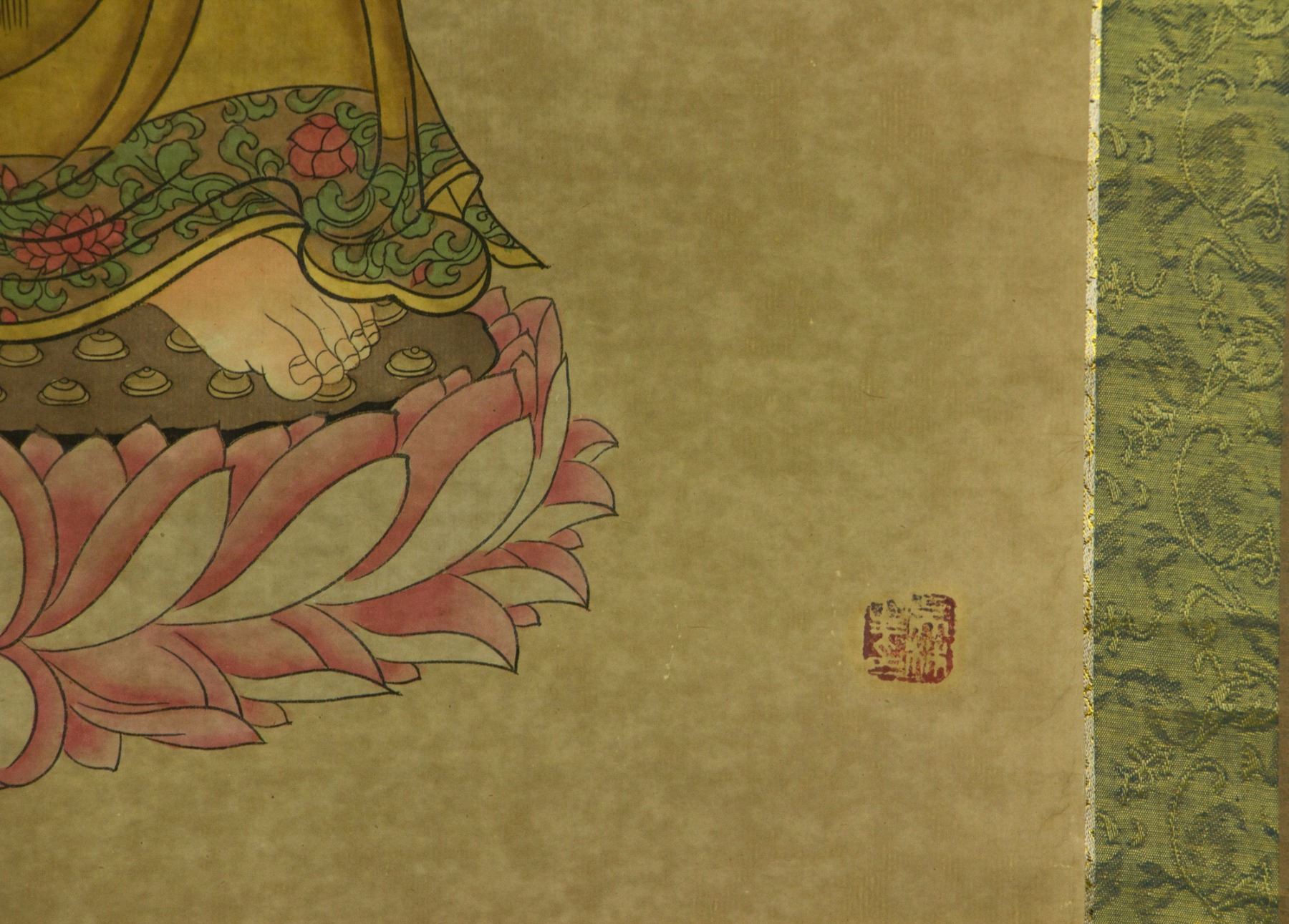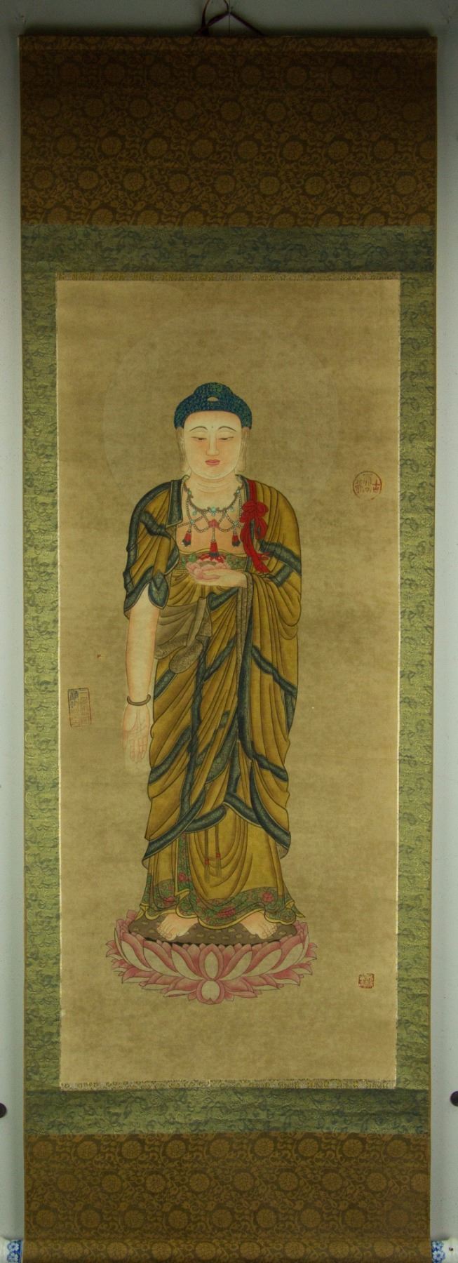 Gautama Buddha; Chinese ink and watercolour on silk; hanging scroll; inscribed with three red seals including one San Xi Tang seal; 183 cm × 61 cm
