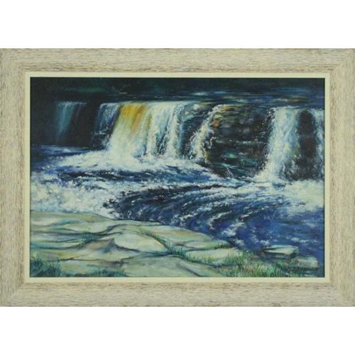 This is a brilliantly and intensely painted waterfall. Intense color and tonal contrast give this painting a depth and richness to the composition, and the brush strokes give the water a look of force and power. This 21? x 28.5? is painted with masterful control of the paint that really shows the skill level of its artist. Perfectly framed in white, rough grained wood frame that compliments the white foam of the rushing water. Its composition leads your eyes through the painting with ease while its subject matter will leave viewers with a sense of awe. A letter of provenance is provided.