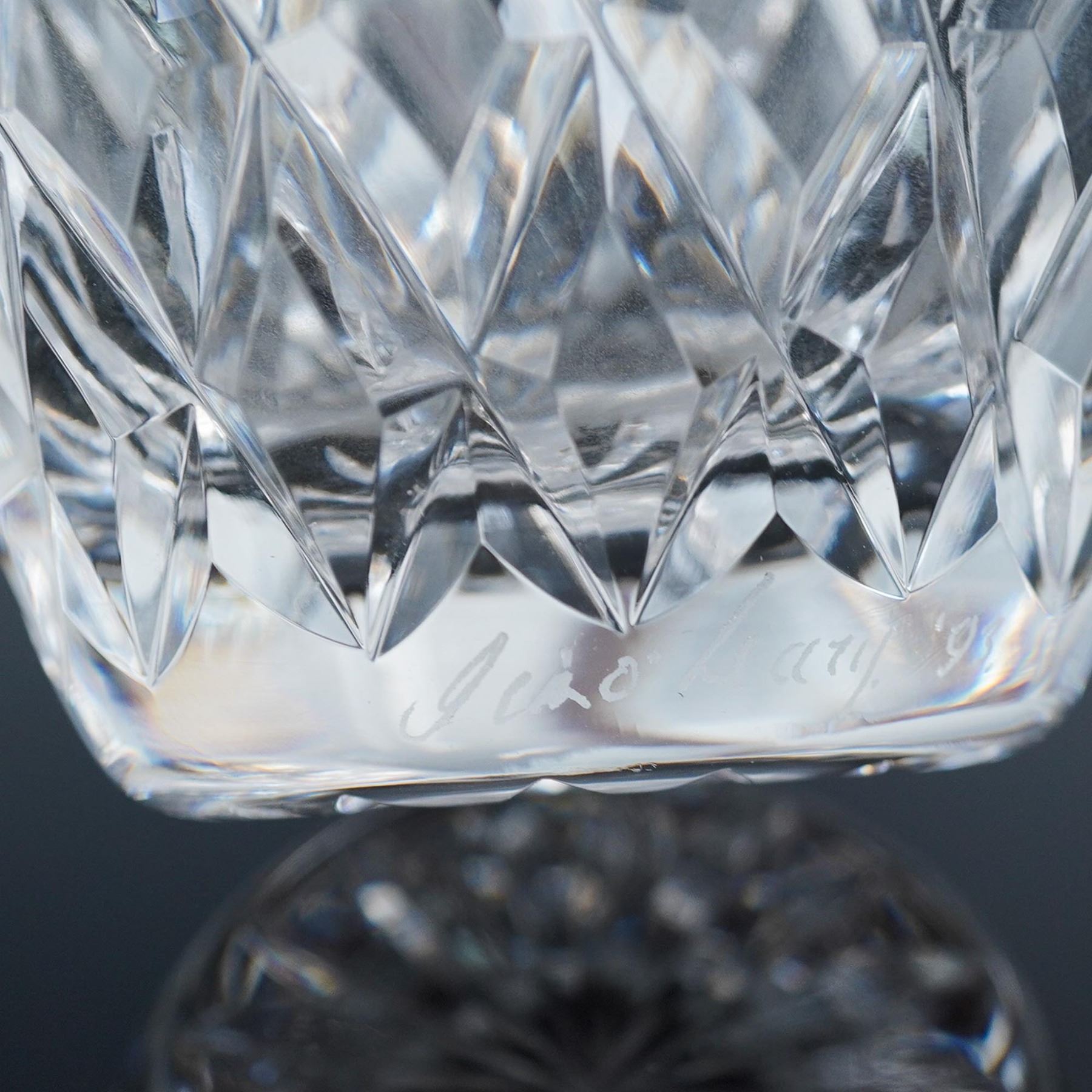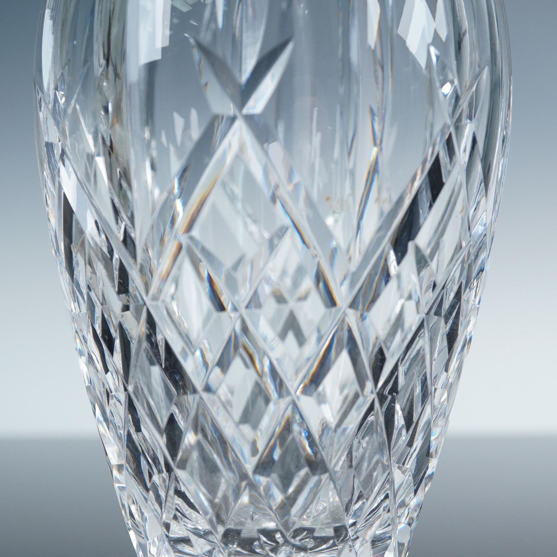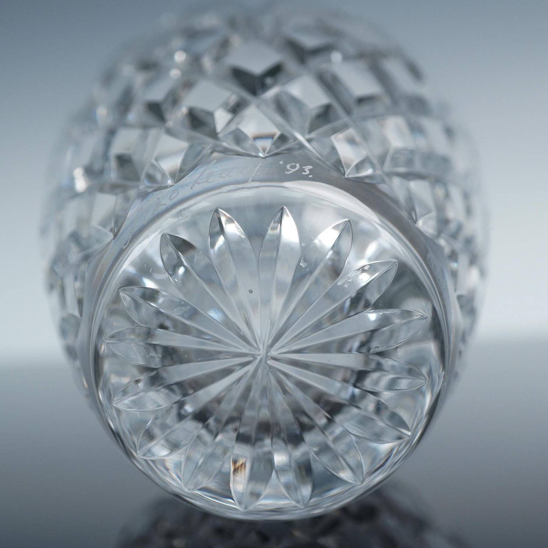 Elegant Waterford cut crystal vase in the classic Araglin pattern, showcasing a sophisticated combination of elongated vertical and crisscross diamond cuts. This 7-inch tall piece bears the acid-etched Waterford mark and features a personalized inscription on the base dated '93, adding a touch of provenance. The Araglin design is known for its refined brilliance and timeless Waterford craftsmanship, making this an excellent decorative or collectible piece.