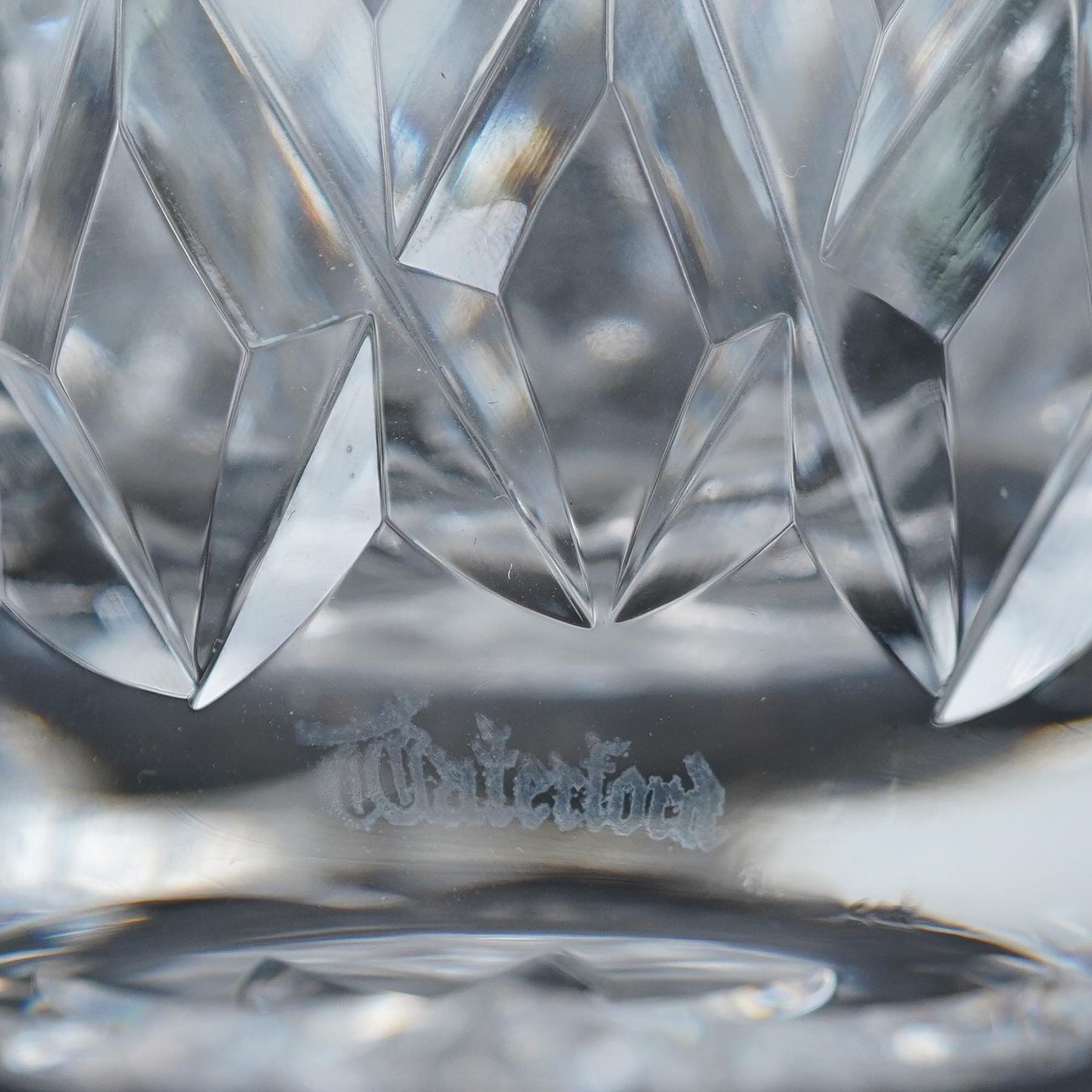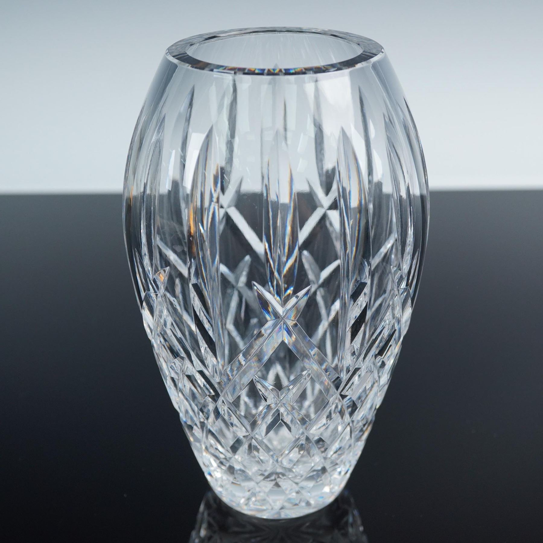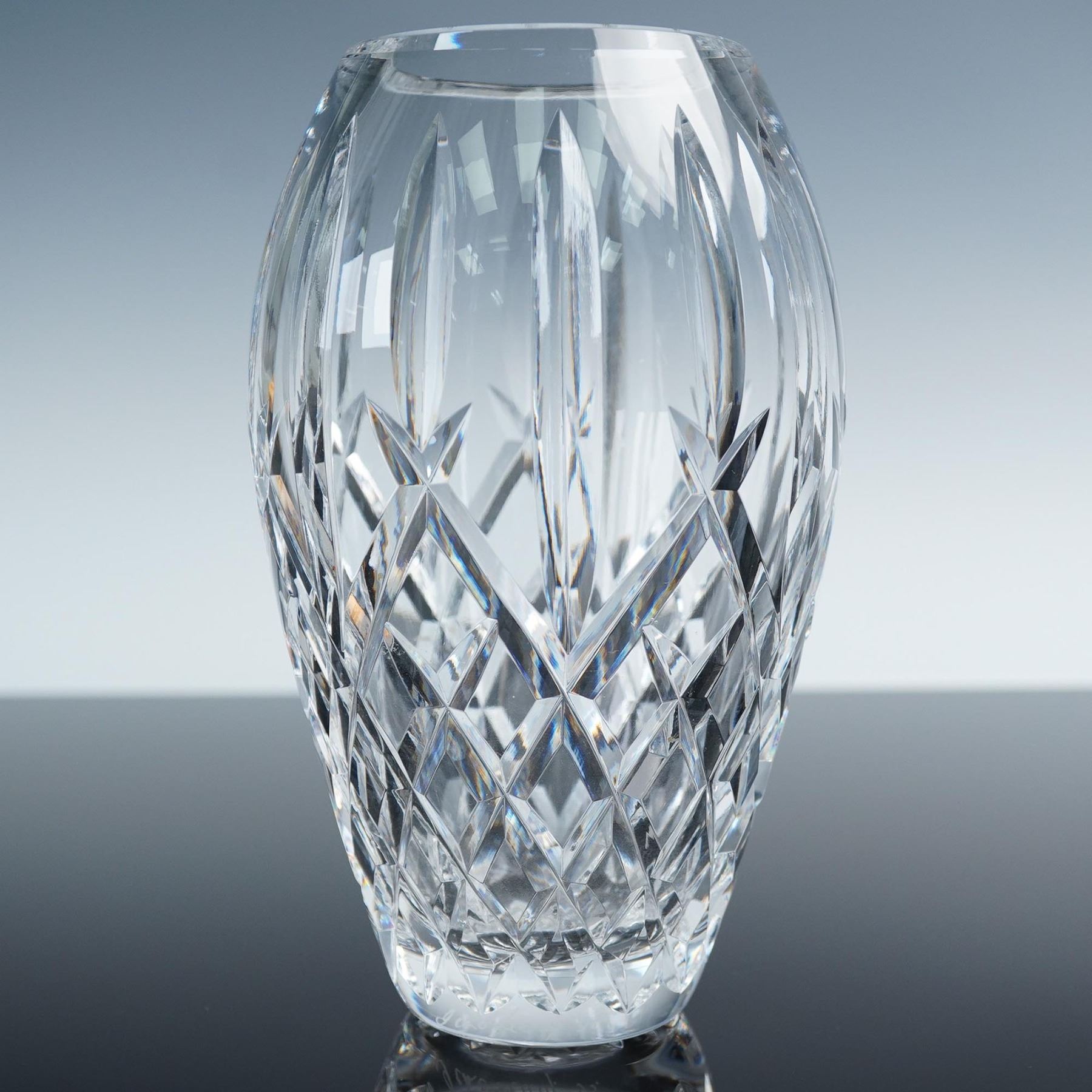 Elegant Waterford cut crystal vase in the classic Araglin pattern, showcasing a sophisticated combination of elongated vertical and crisscross diamond cuts. This 7-inch tall piece bears the acid-etched Waterford mark and features a personalized inscription on the base dated '93, adding a touch of provenance. The Araglin design is known for its refined brilliance and timeless Waterford craftsmanship, making this an excellent decorative or collectible piece.