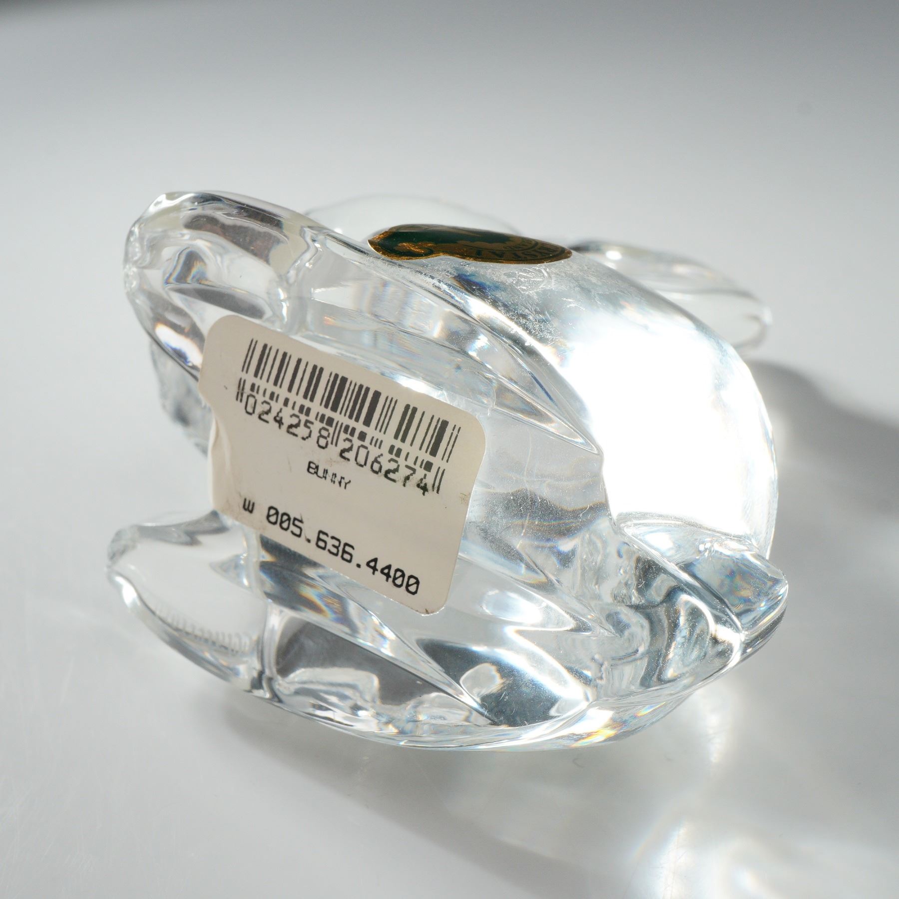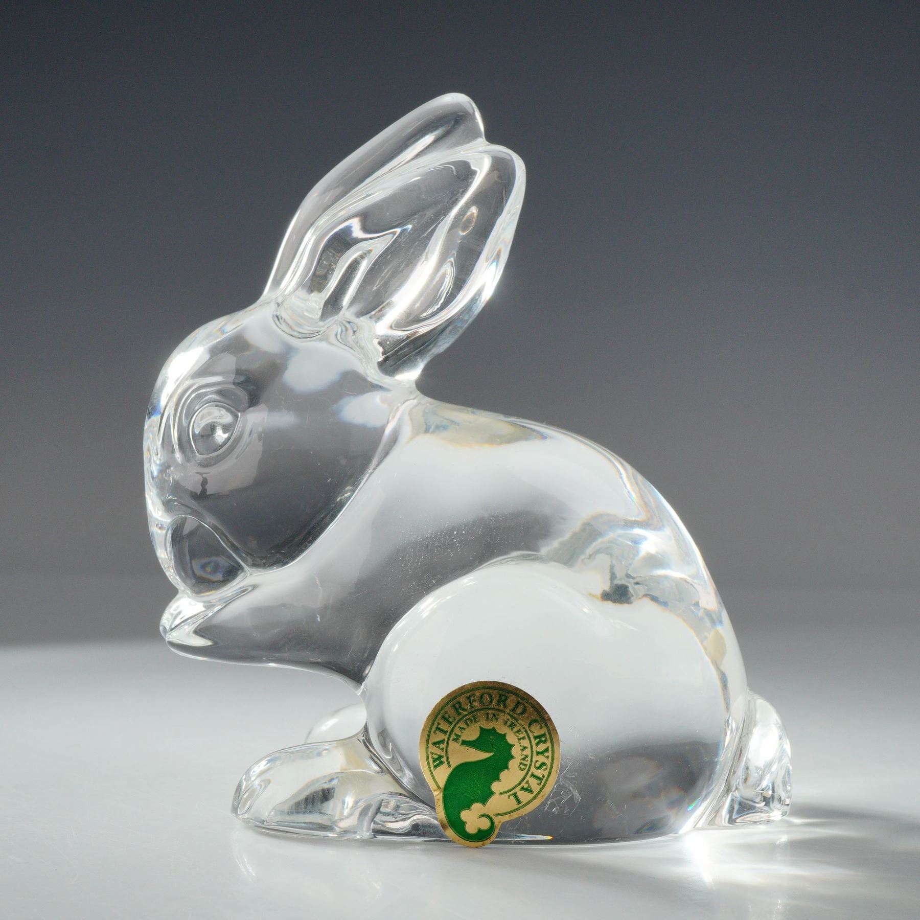 The piece features a seated rabbit in a smooth, molded form with a high-polished finish. Minimalist details define the ears, eyes, and paws, creating an expressive silhouette with exceptional clarity and prismatic brilliance. The figurine retains its original green and gold foil Waterford sticker.