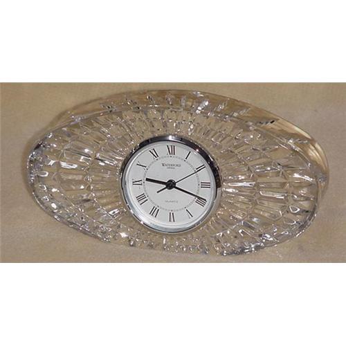 A quartz clock movement housed in a Waterford crystal case, 8" long, 4" tall.Battry operated movement, battery not included. Case signed Waterford. Condition is excellent.