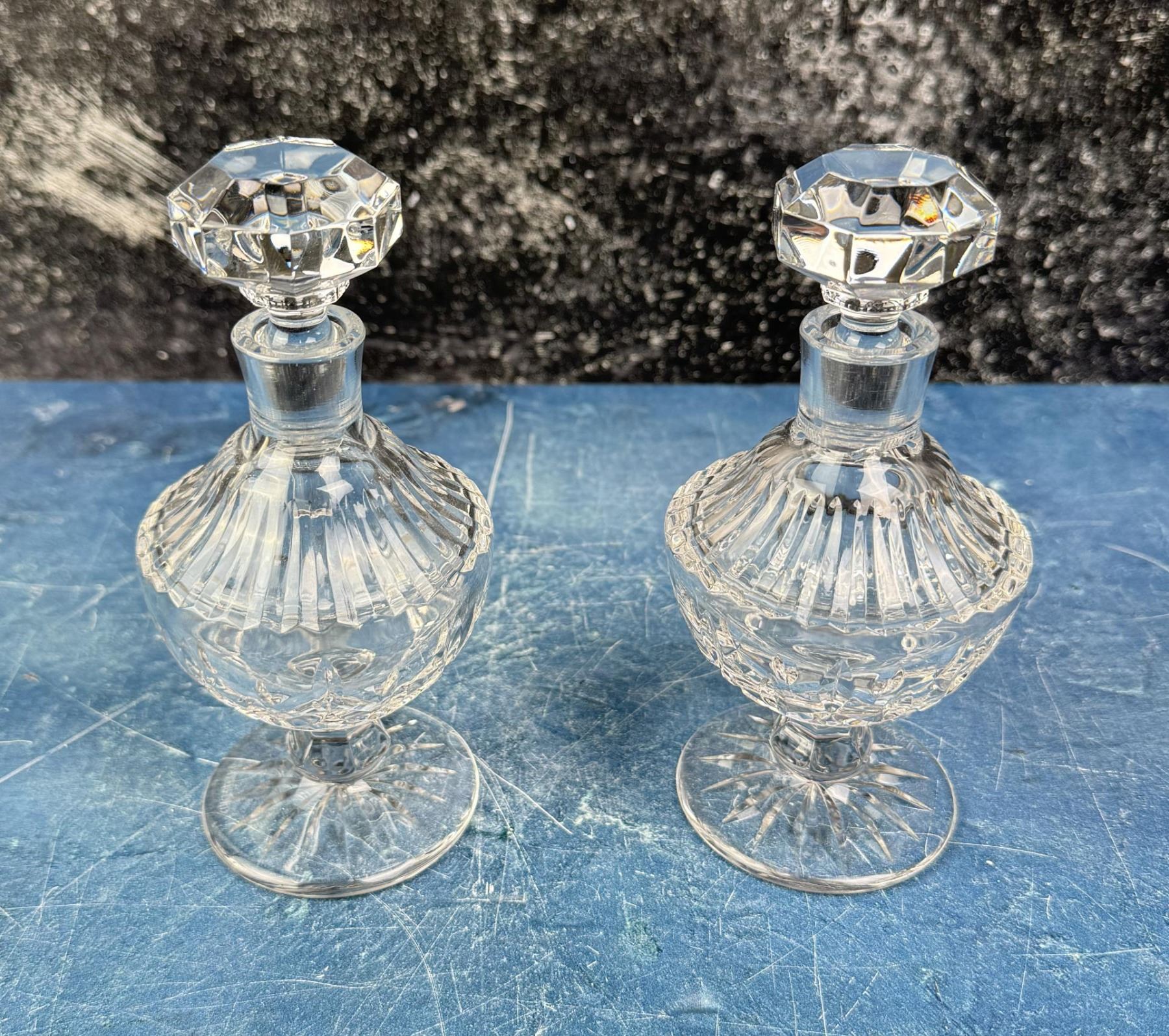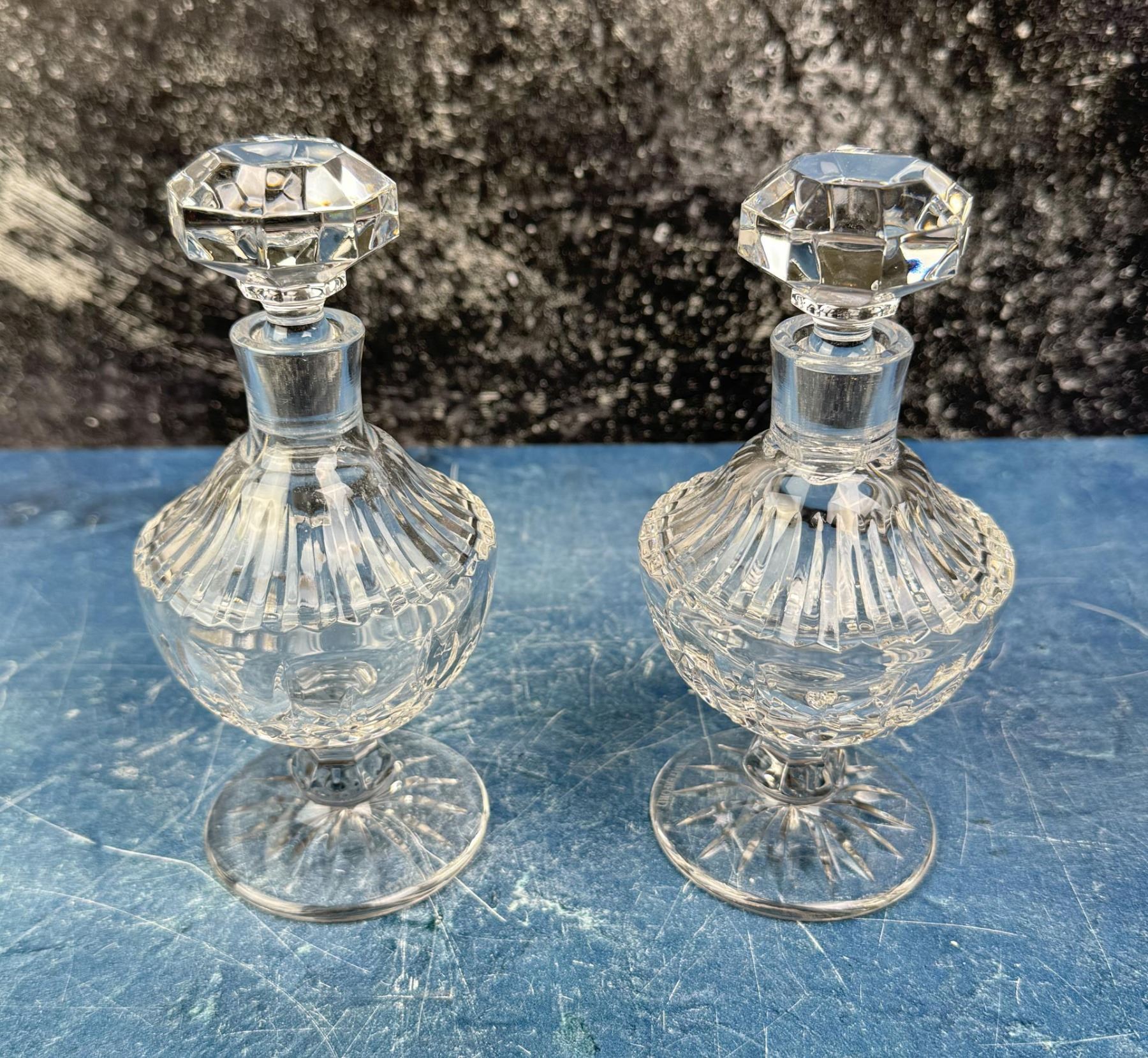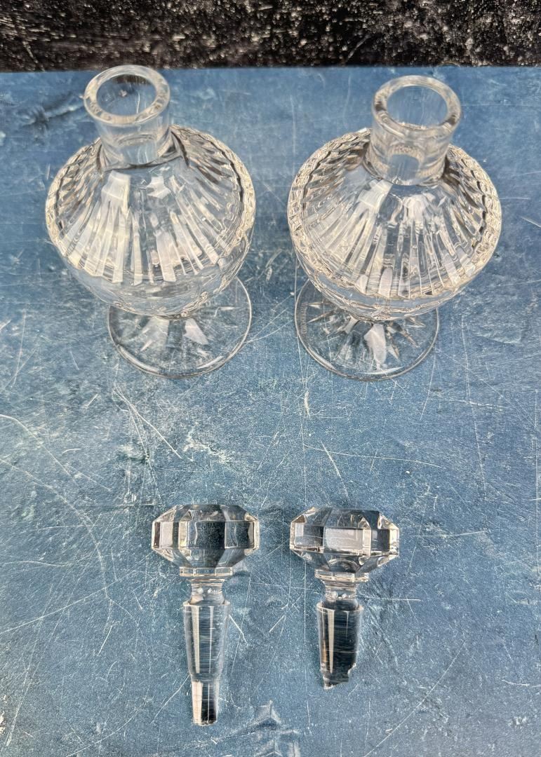 6 1/8" tall, 2 7/8" in diameter. One stopper is chipped.