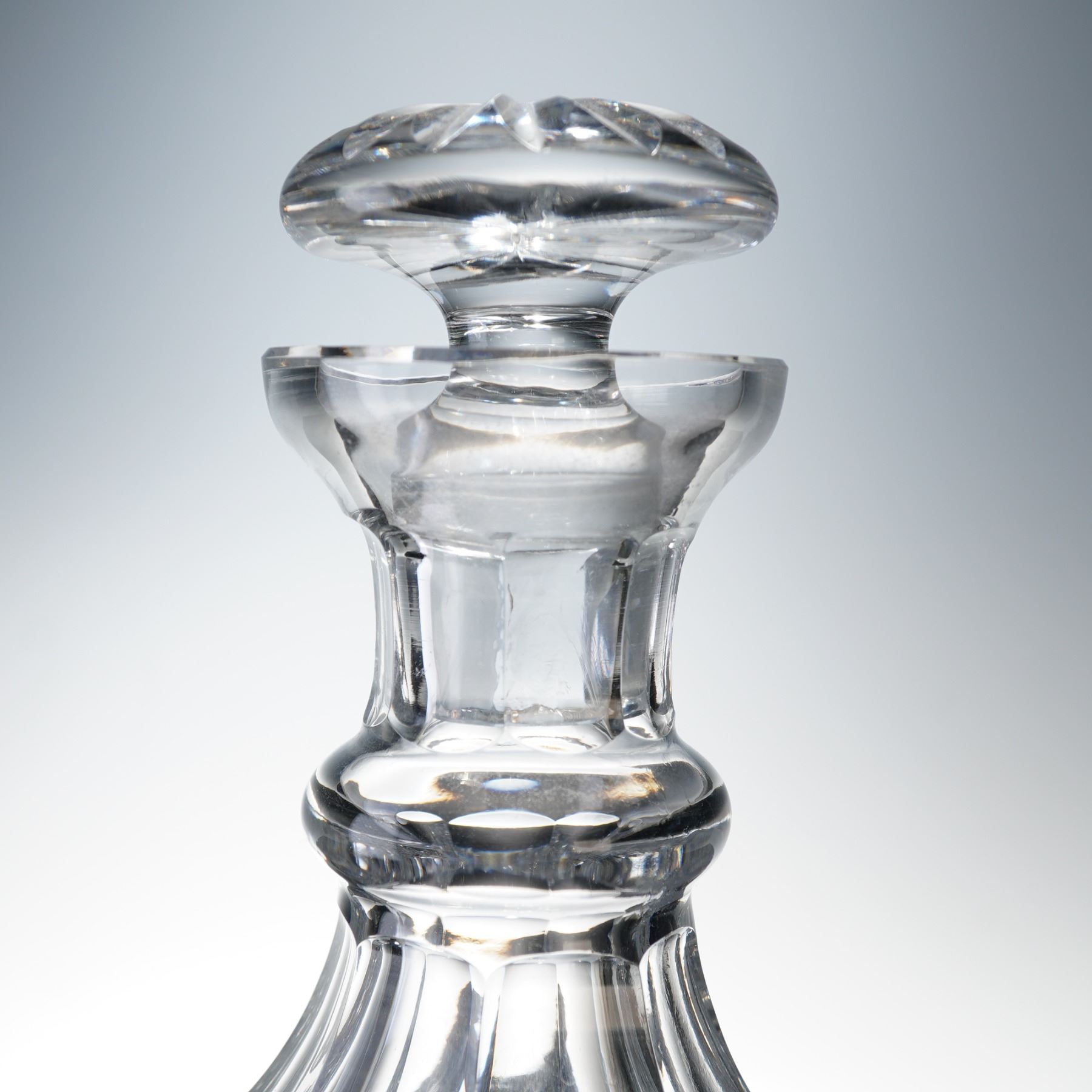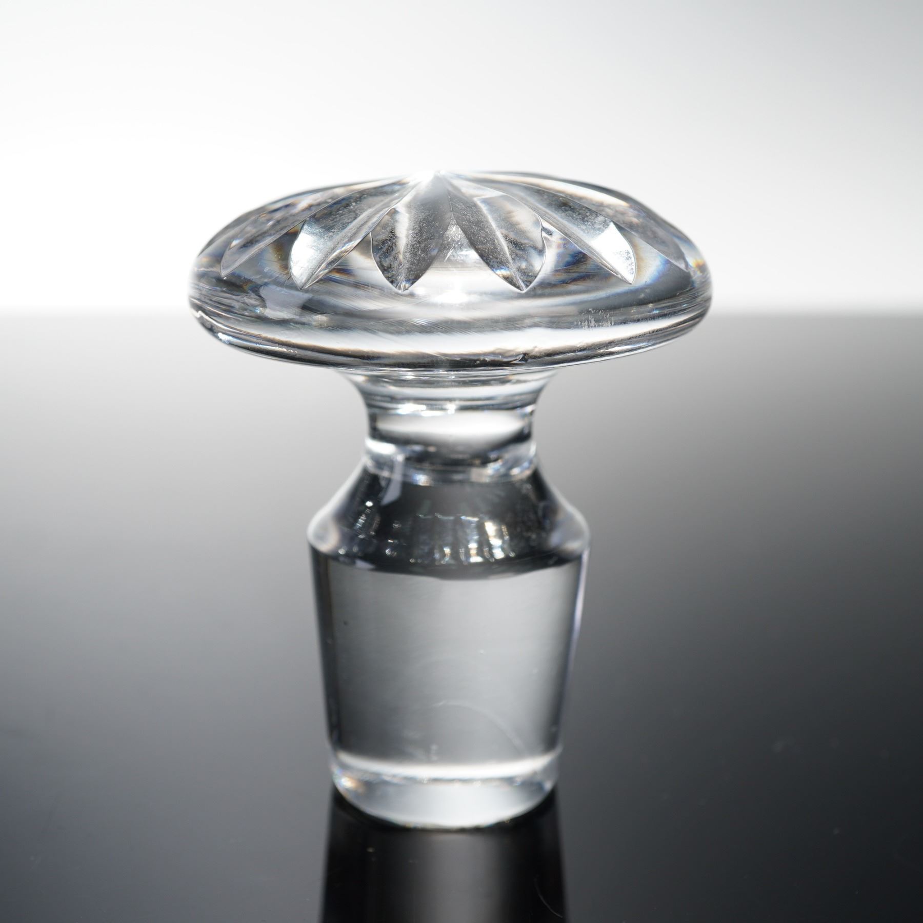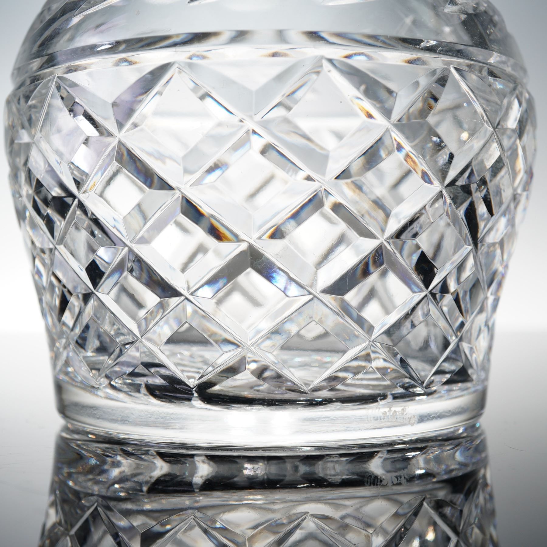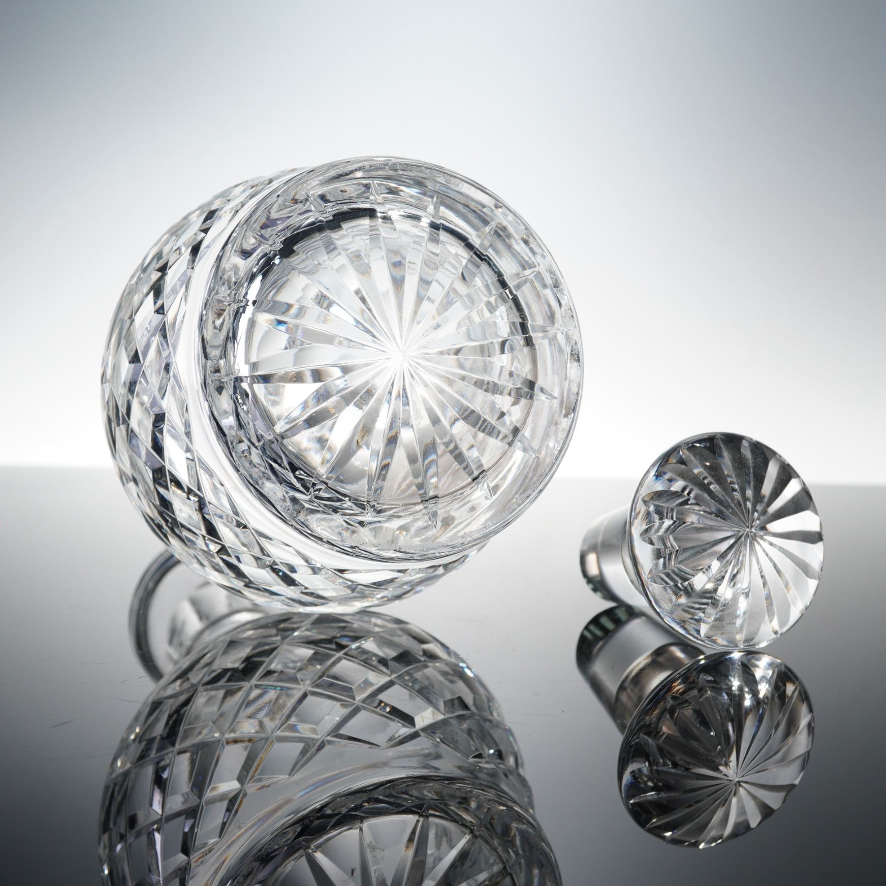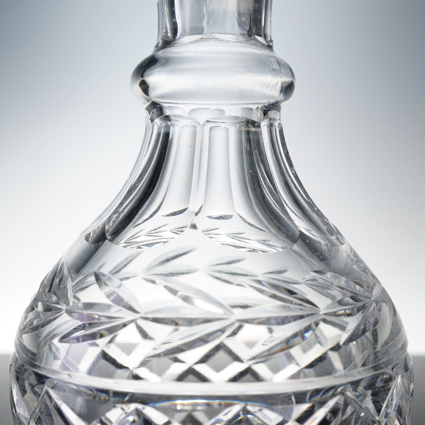 Crystal decanter in the Glandore pattern, featuring an elegant bulb form with deeply cut diamond and leaf motifs. The decanter showcases Waterford's signature brilliance and clarity, with precise hand-cut detailing that captures and refracts light beautifully. The matching faceted stopper echoes the same crisp geometric design, completing the piece with balanced proportion and weight. Waterford acid mark to base. A timeless example of Waterford craftsmanship, perfect for display or service in the finest of settings.