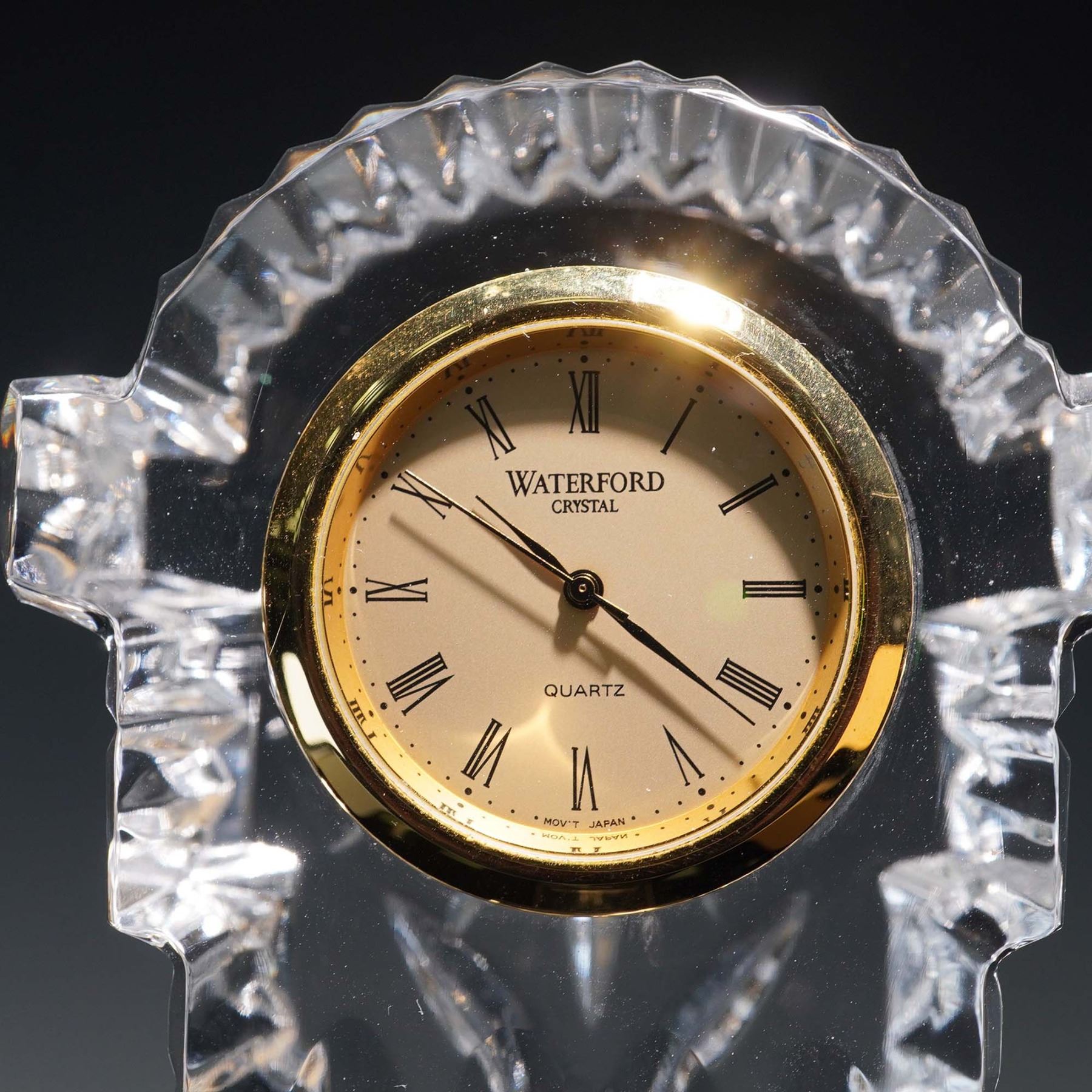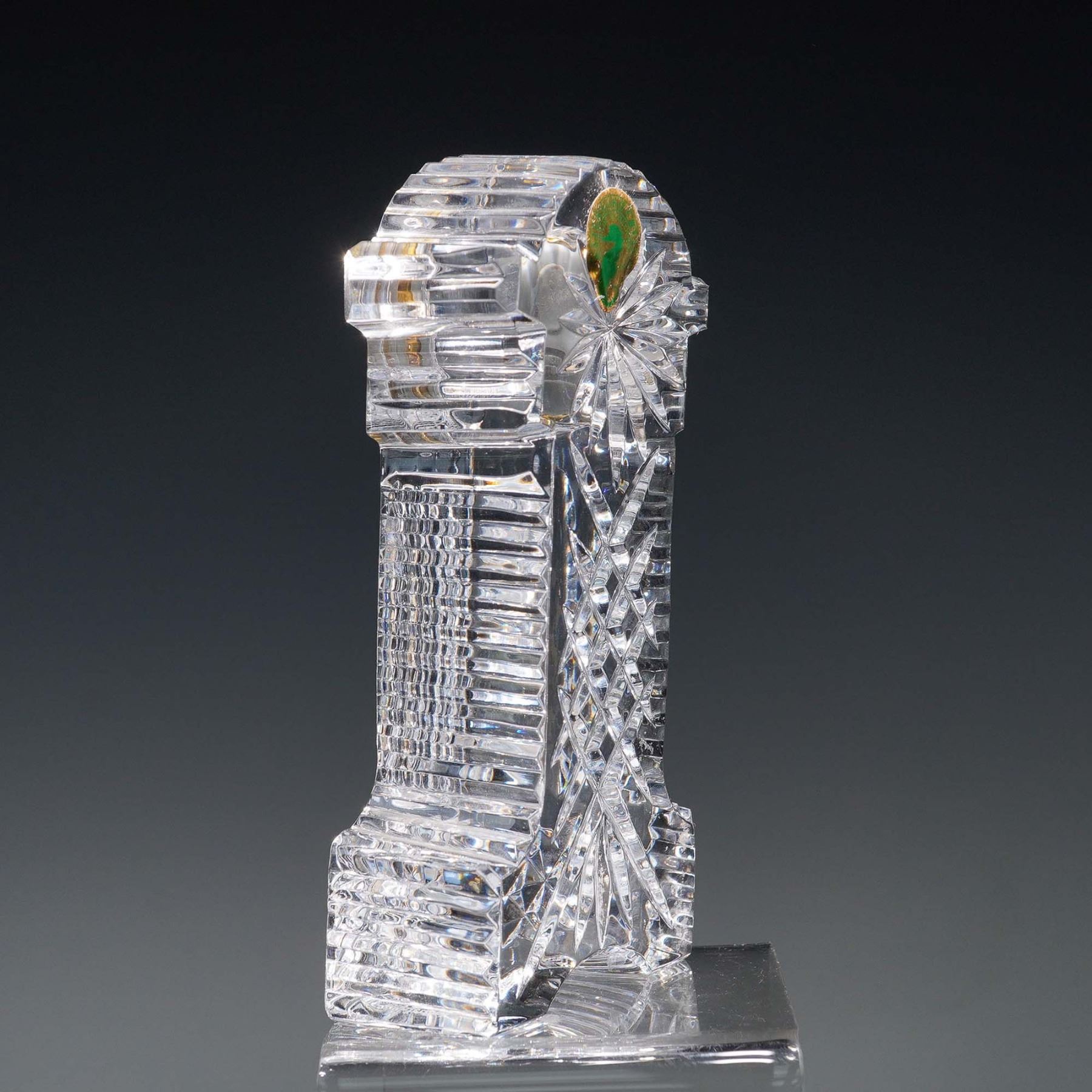 This elegant Waterford Crystal desk clock features a gracefully cut pedestal design with signature diamond and vertical crisscross patterns, showcasing the brand's renowned craftsmanship. The clock insert is encircled by a polished gold-tone bezel, complementing the clear brilliance of the crystal. The face bears Roman numerals and is marked "Waterford Crystal Quartz," with the movement noted as Japanese. A refined addition to any desk, vanity, or mantle, it embodies timeless luxury and precision in design.