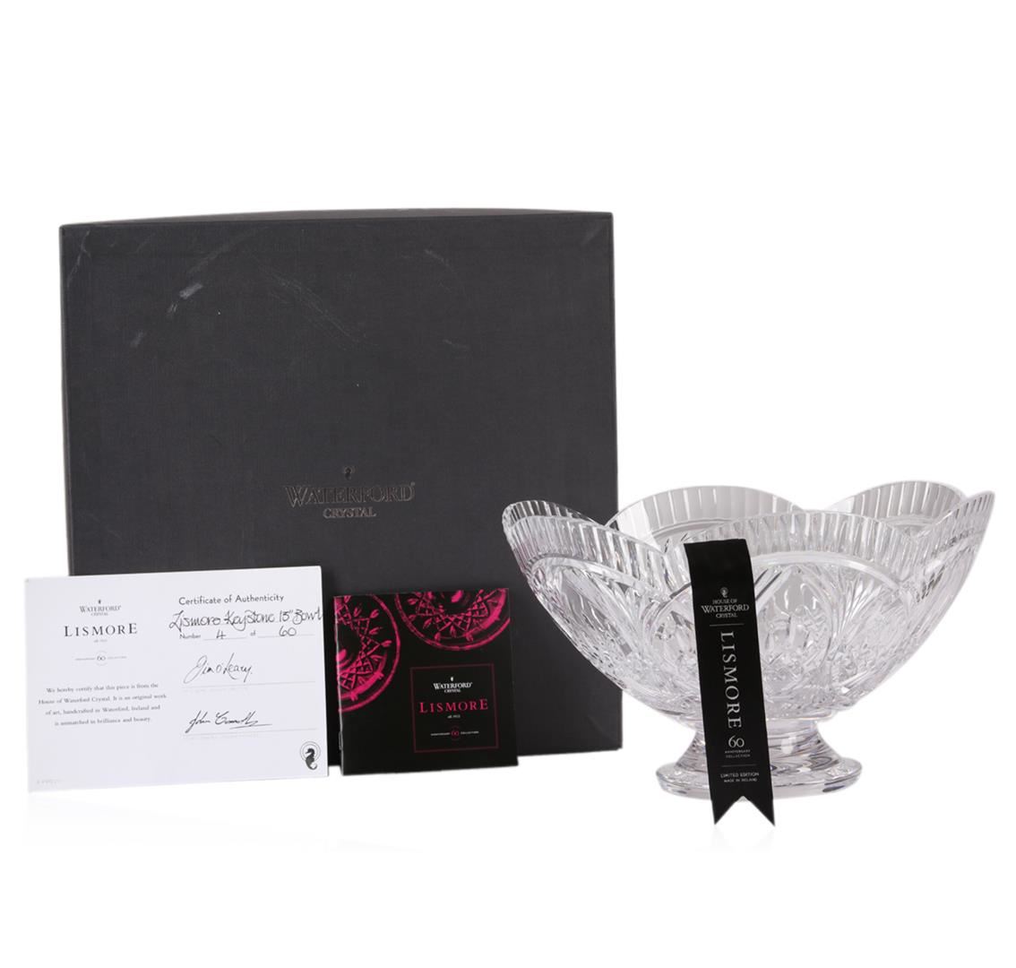 Waterford Crystal Jim O'Leary limited edition 4/60 Lismore Keystone 13" Bowl Genuine Waterford Crystal. Stamped with the Waterford seahorse symbol of excellence. Waterford crystal UPC number: 024258504387. Comes with certificate of authenticity from Waterford. Original box and packaging.