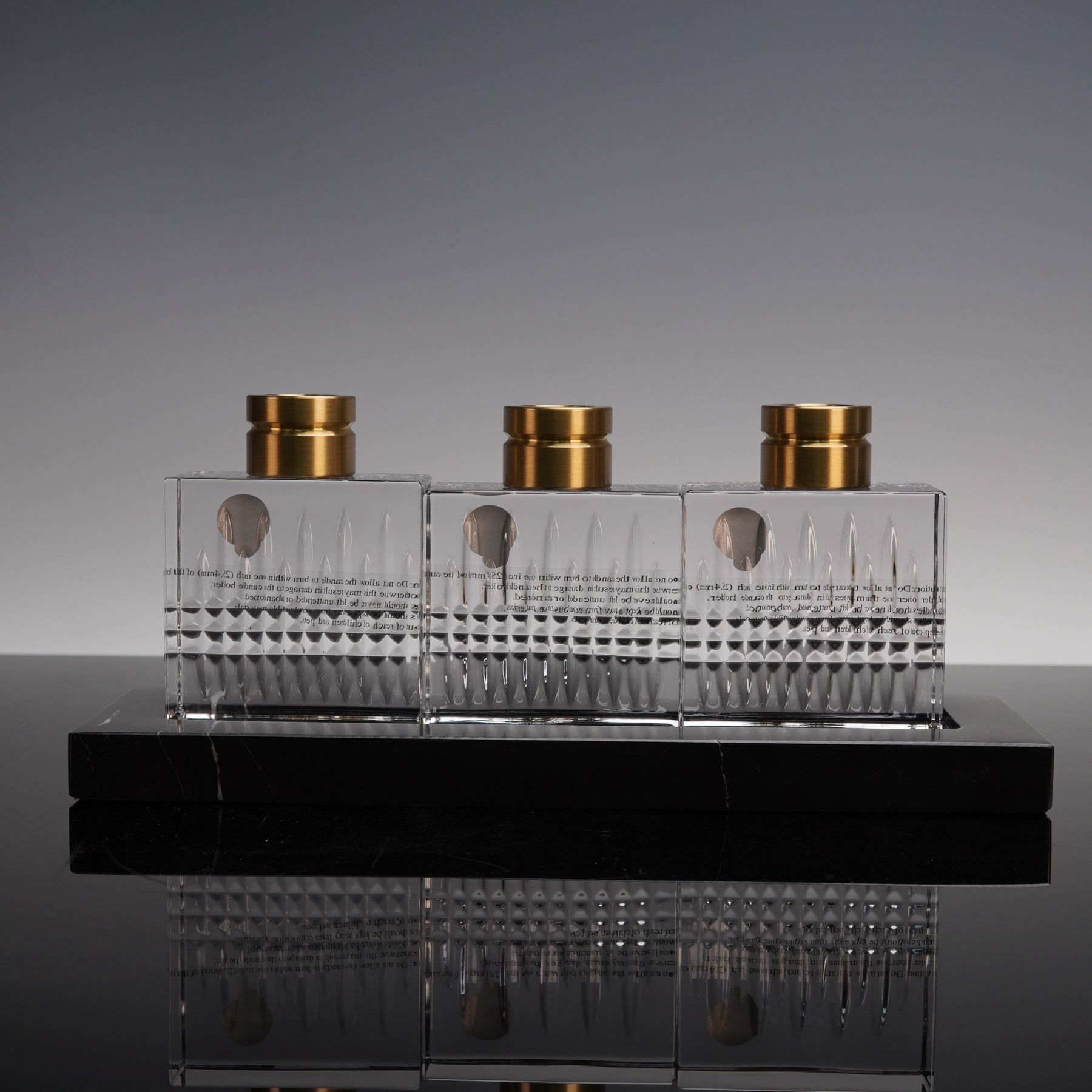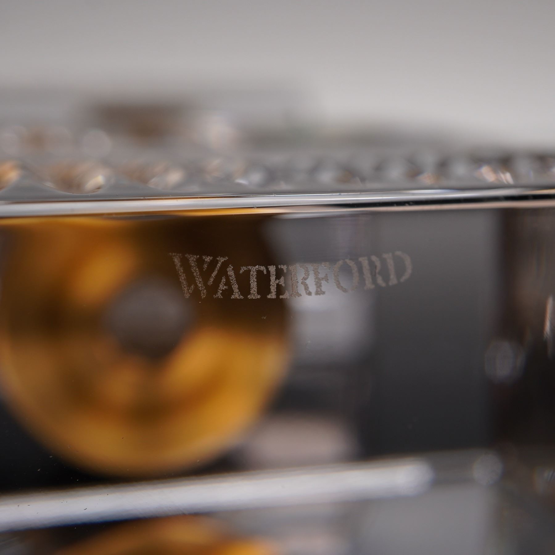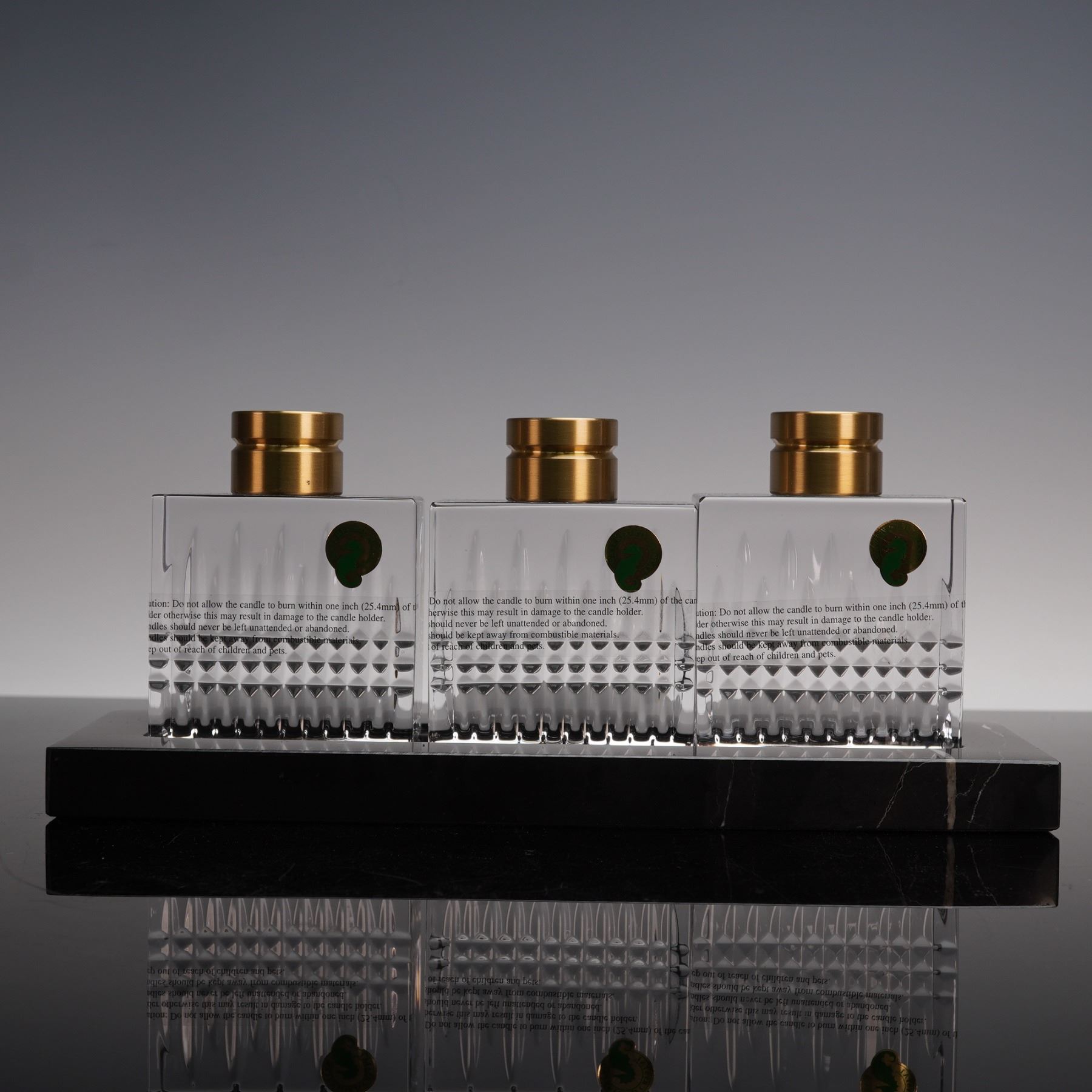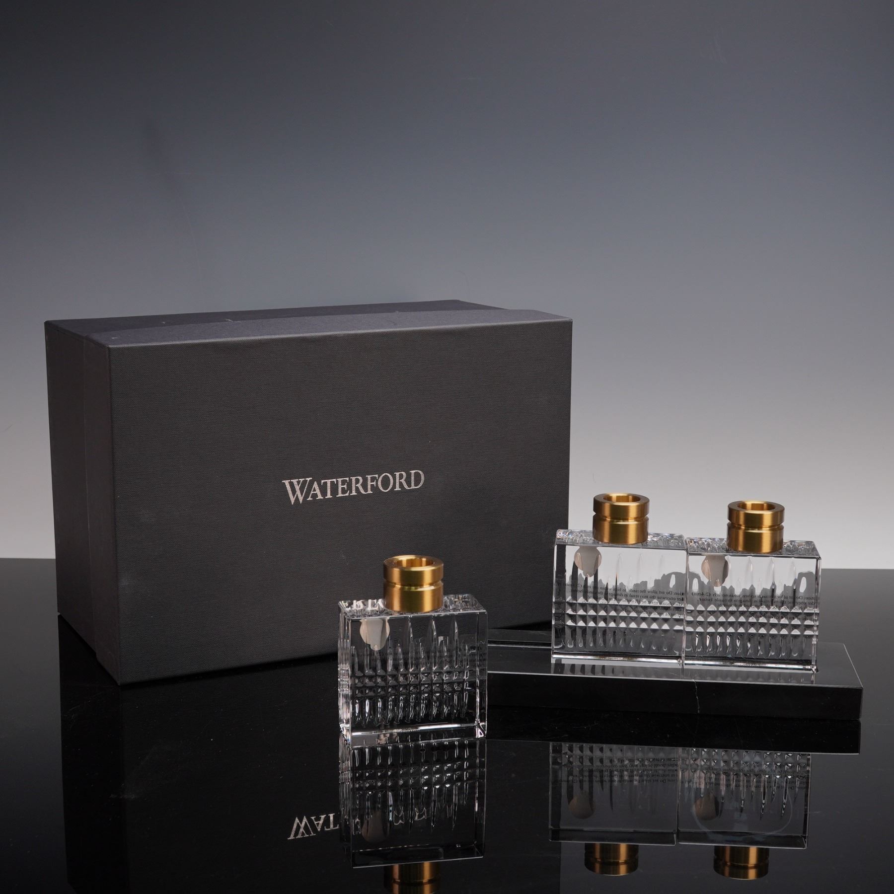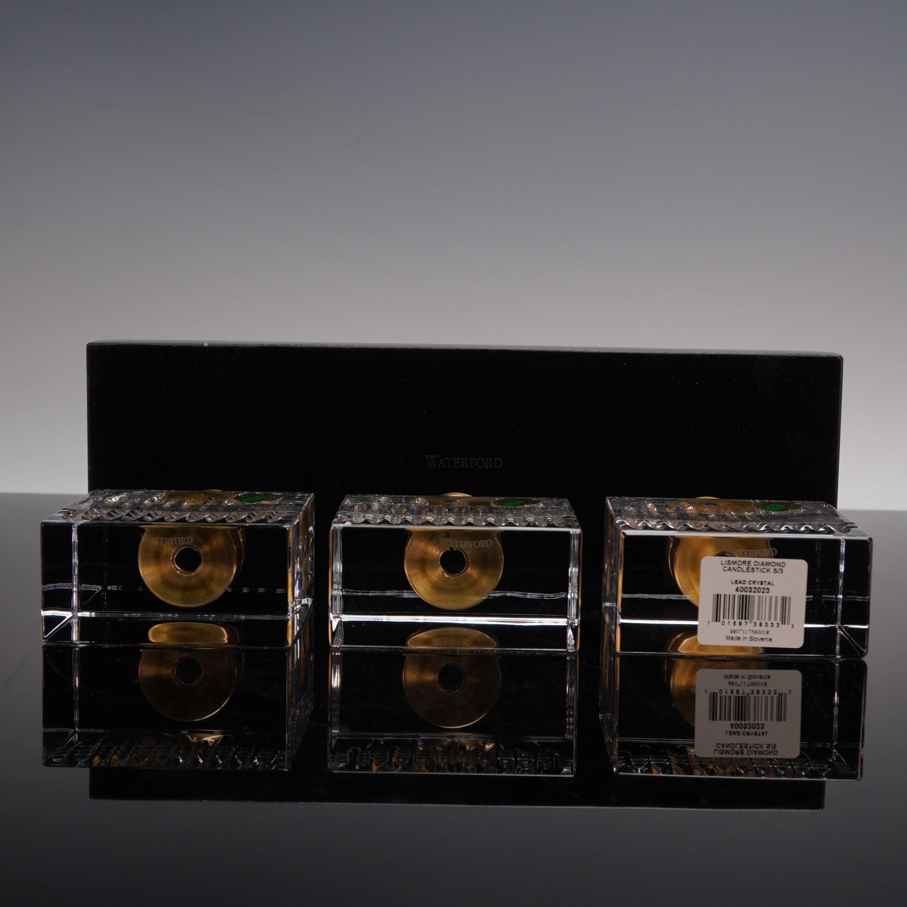 Presented is a set of three single-light candlesticks from Waterford's Lismore Short Stories Diamond collection, each with gilt metal tops and displayed on a polished black marble base. The Lismore Short Stories series was created as a contemporary interpretation of the classic Lismore pattern, with each chapter offering a fresh design perspective while preserving the iconic wedge and diamond cutting. The Diamond chapter takes its name from the striking use of deep diamond-shaped cuts, symbolizing brilliance and refinement within the Short Stories line. Each candlestick is etched with the Waterford name, the base is also marked Waterford underneath, and all pieces retain their original labels. The set is accompanied by the original Waterford presentation box.