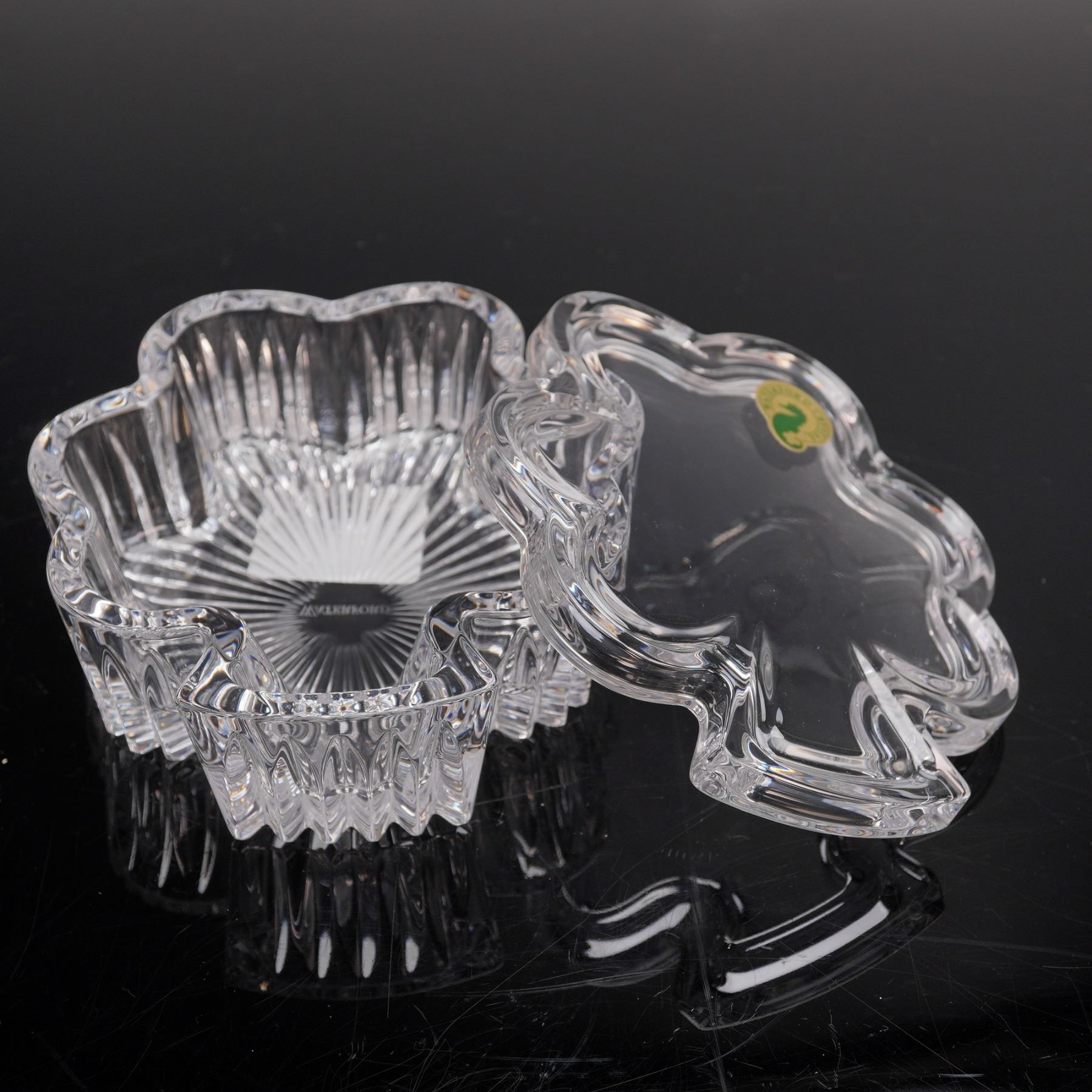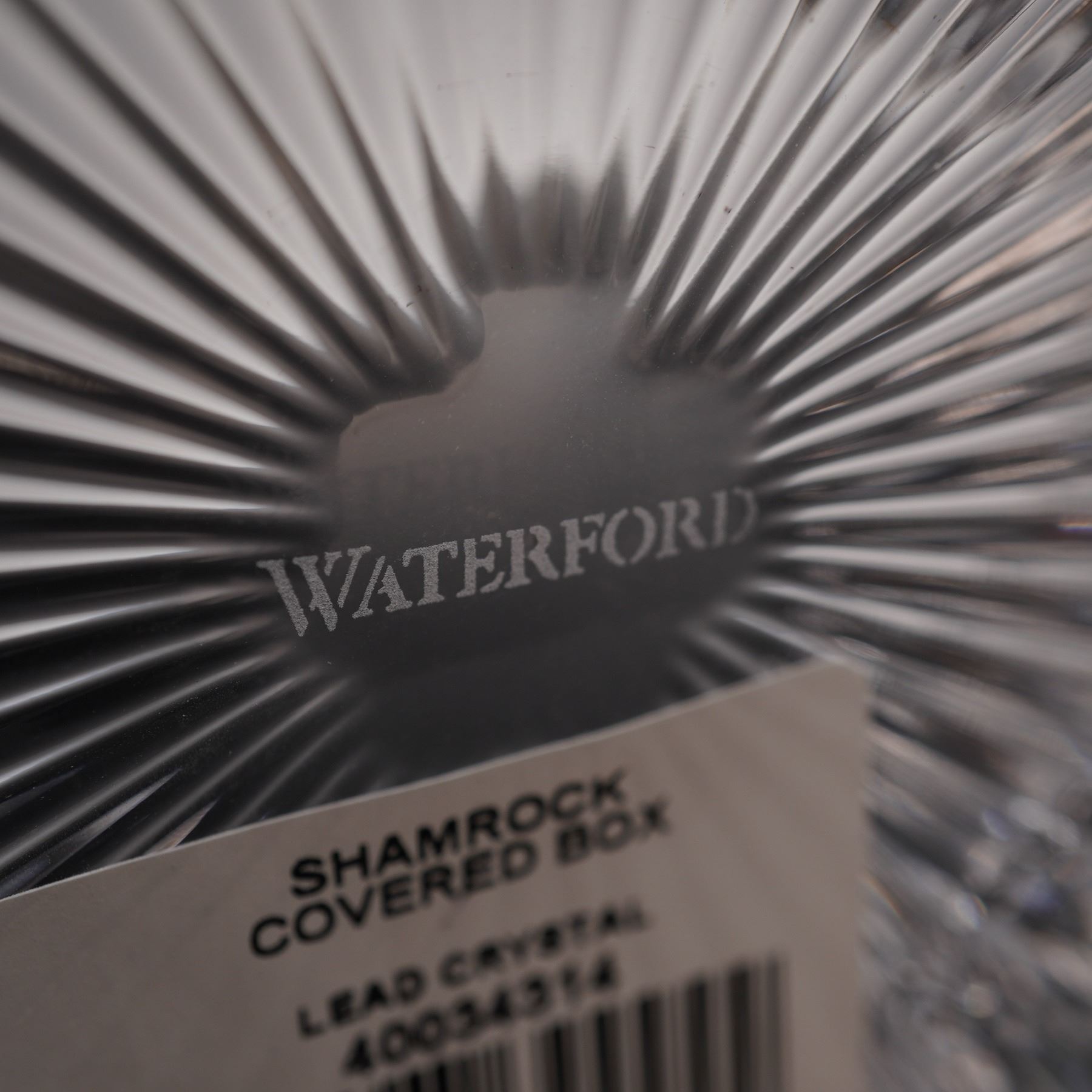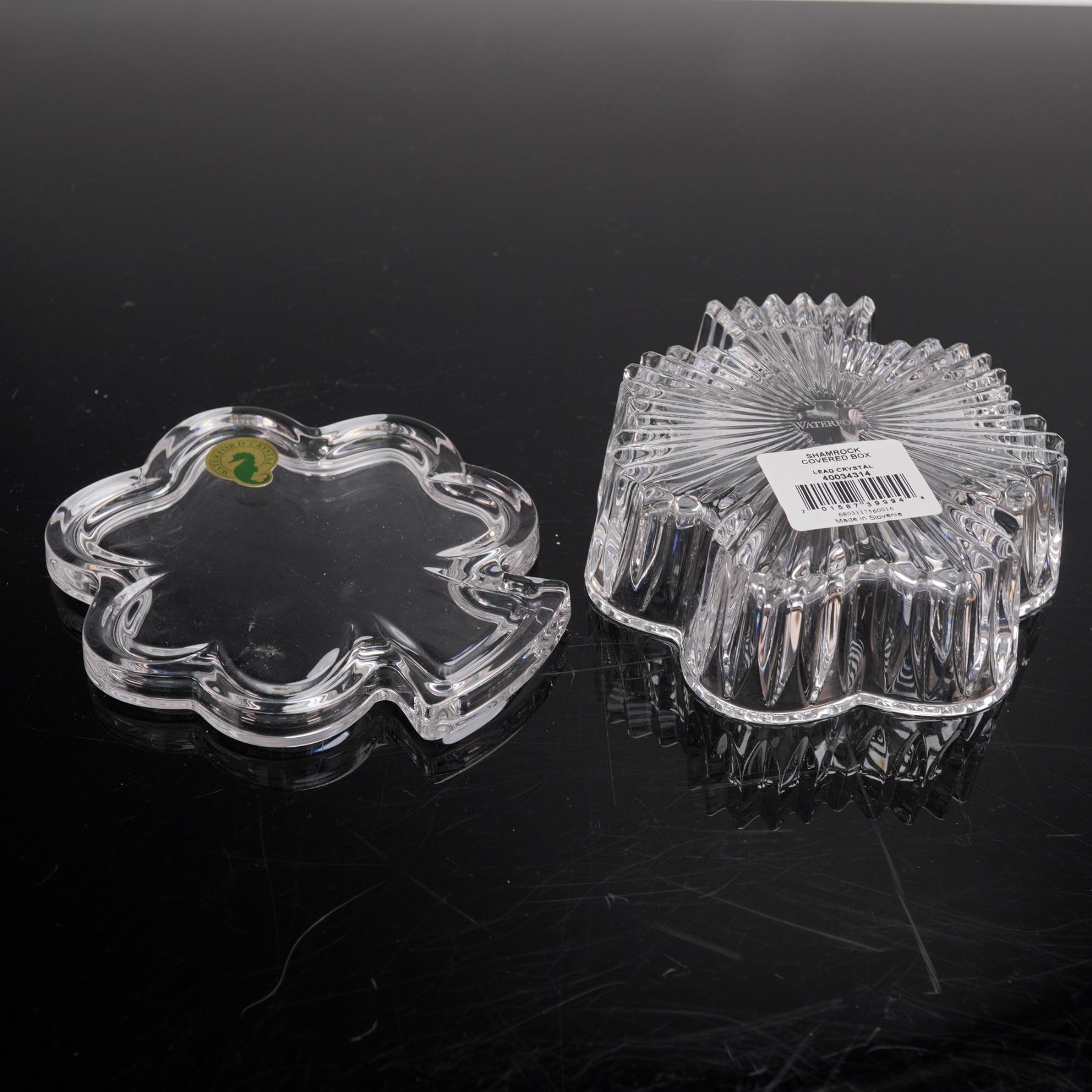 Waterford lead crystal Shamrock Covered Box, featuring a shamrock-shaped form with faceted sides and a matching fitted lid. The clear crystal body is deeply cut with radiating panels creating a brilliant display of light refraction. The underside is etched with the Waterford mark. A classic collectible piece ideal for display or storage of small keepsakes.