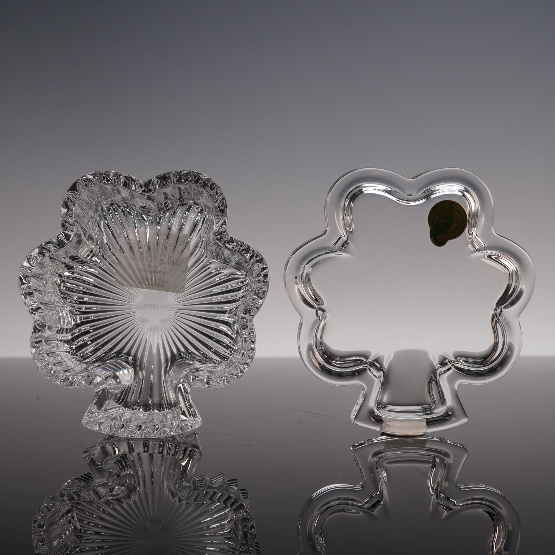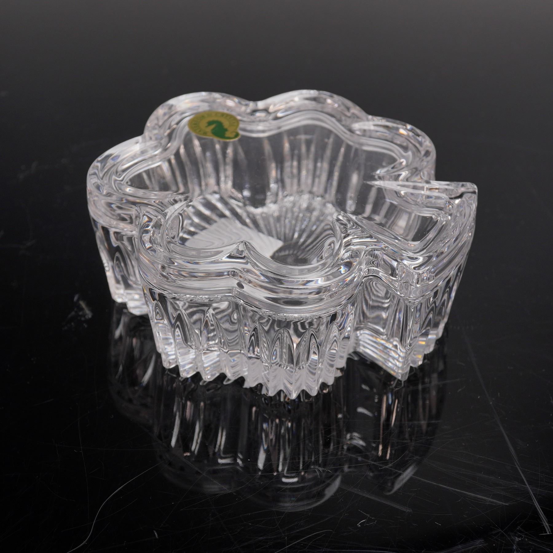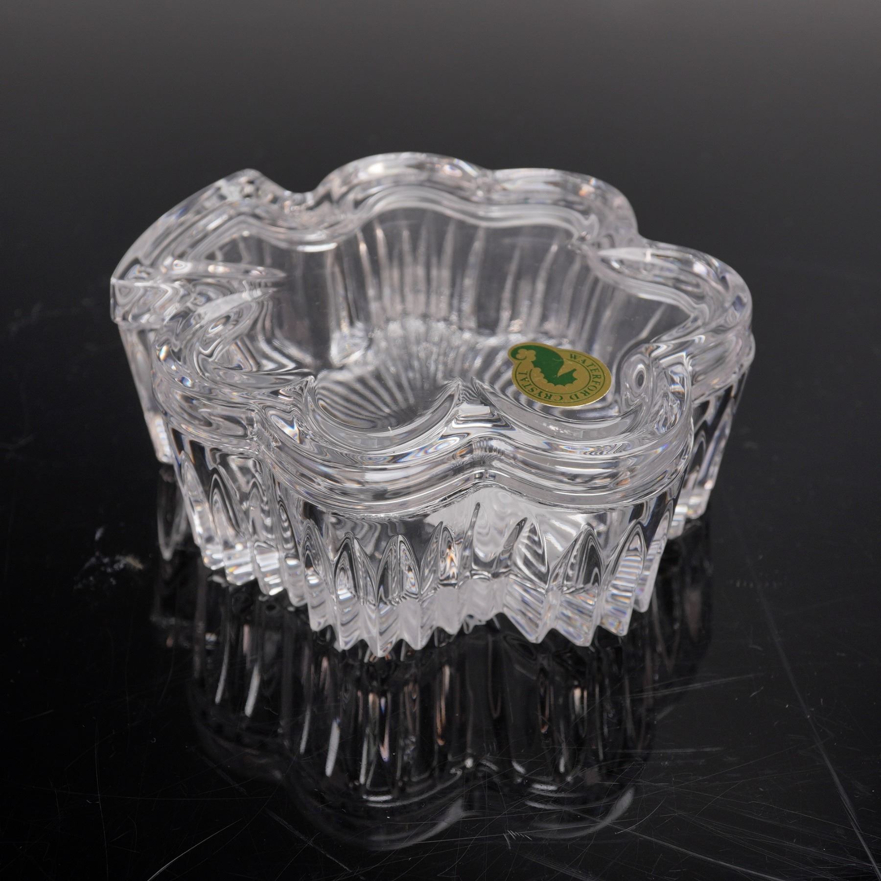 Waterford lead crystal Shamrock Covered Box, featuring a shamrock-shaped form with faceted sides and a matching fitted lid. The clear crystal body is deeply cut with radiating panels creating a brilliant display of light refraction. The underside is etched with the Waterford mark. A classic collectible piece ideal for display or storage of small keepsakes.