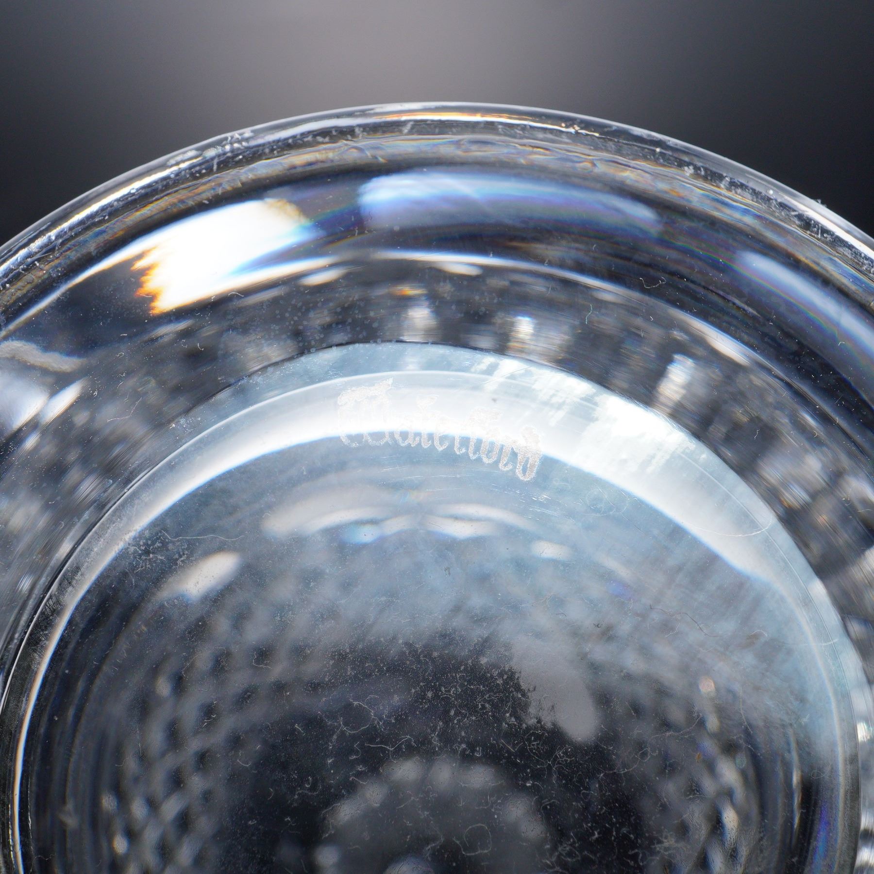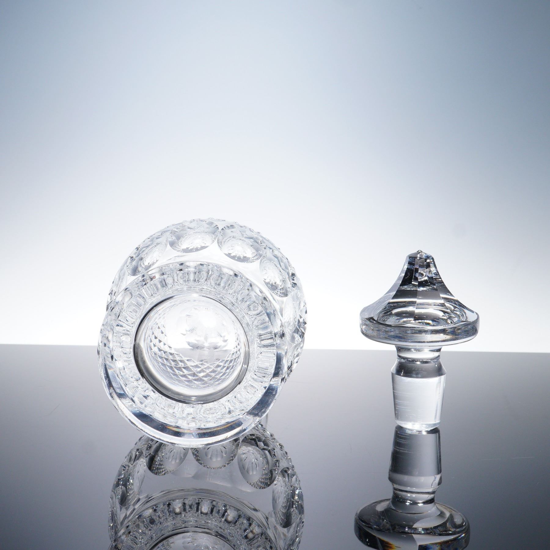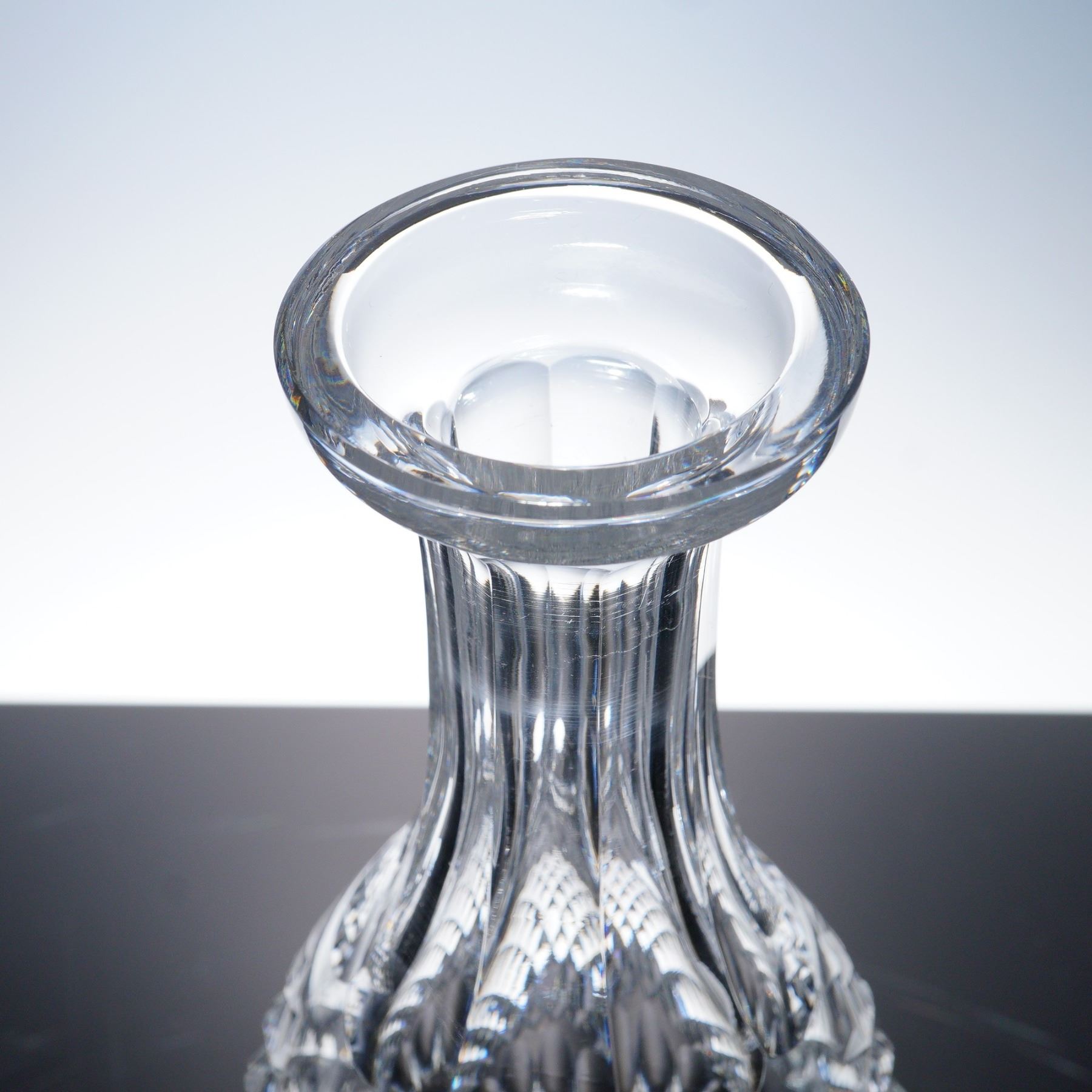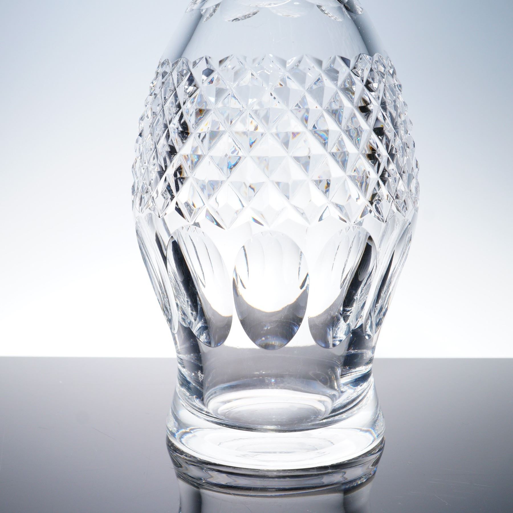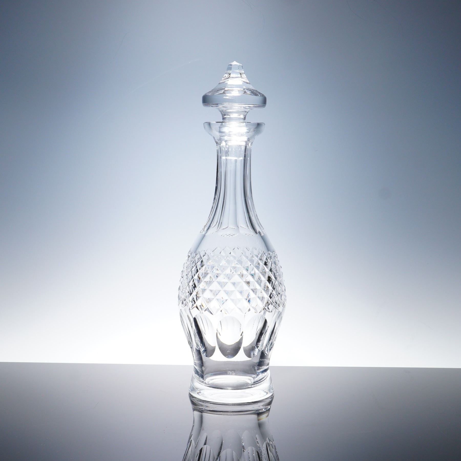 Tall Waterford crystal decanter in the classic Colleen pattern, featuring deep cross-hatch cuts and vertical flutes that capture and reflect light with elegance. The form is finished with a faceted crystal stopper that complements the traditional design. A distinguished addition to any bar or crystal collection. Measures approx. 13.25"H.