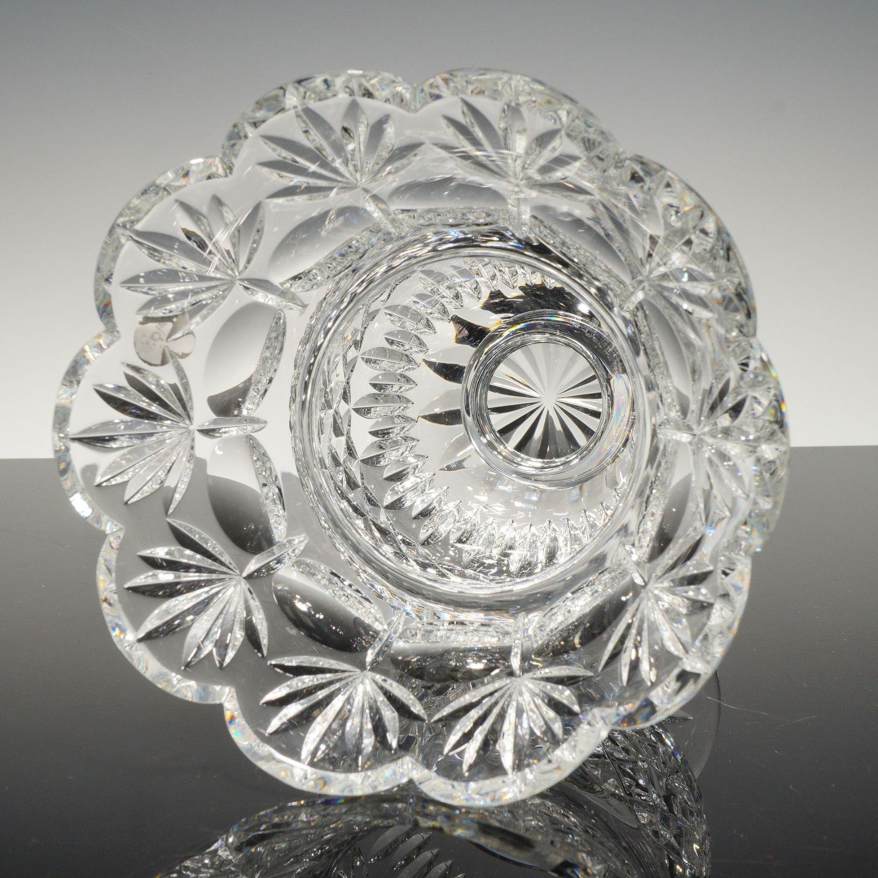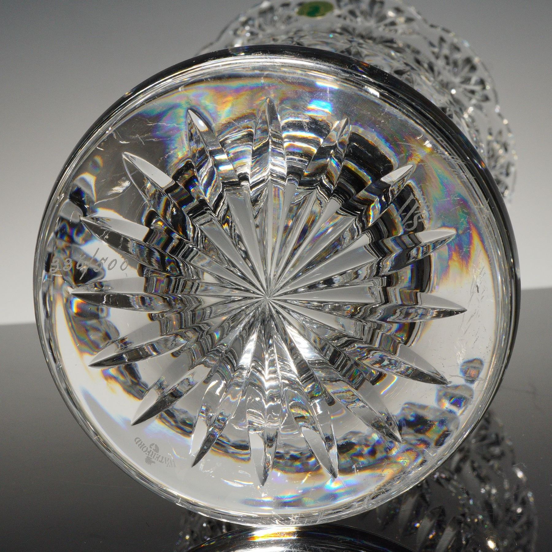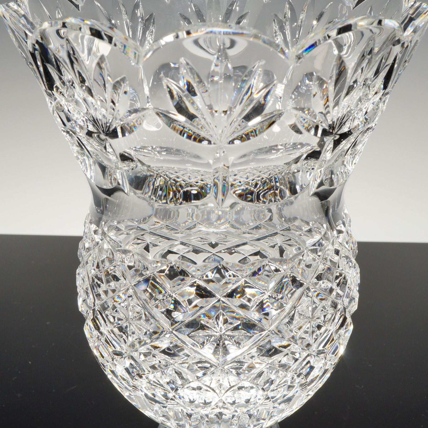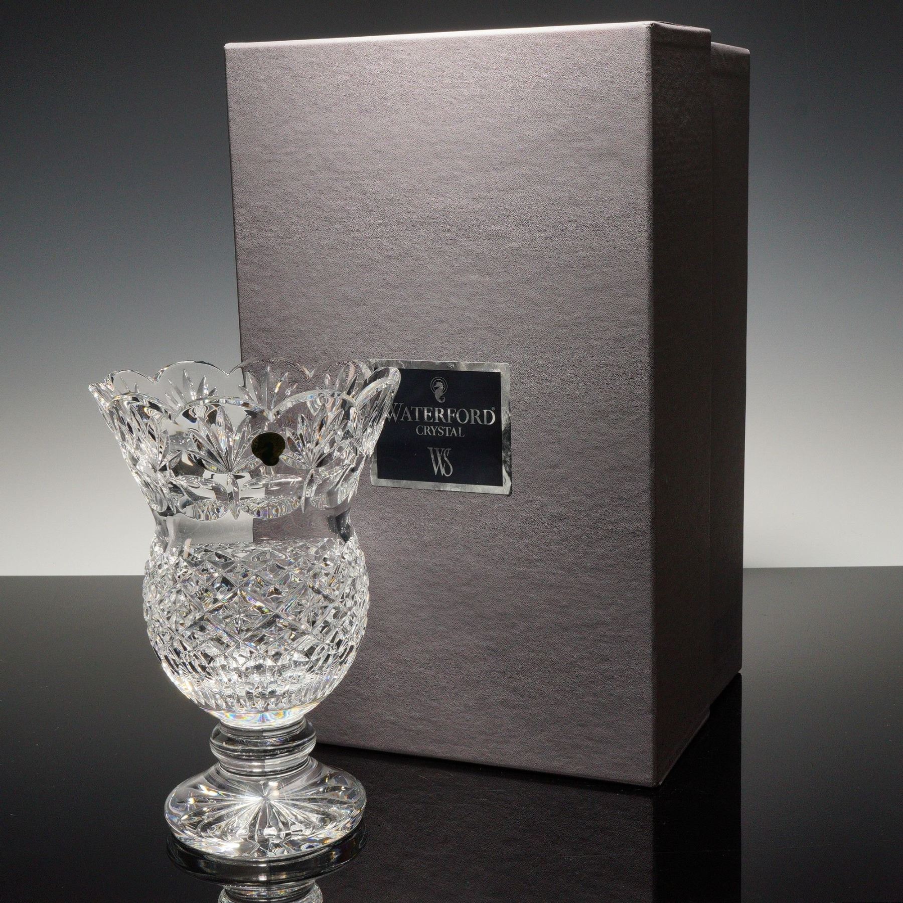 A finely crafted cut crystal vase from Waterford's Fitzwilliam Thistle Collection, featuring intricate cross-hatched and fan cuts that catch the light beautifully. Standing on a circular pedestal base with a radiating starburst design, the vase's flared rim is scalloped and adorned with stylized thistle motifs. Presented with its original Waterford Crystal box, this limited edition piece bears the Waterford acid-etched signature and numbered.
