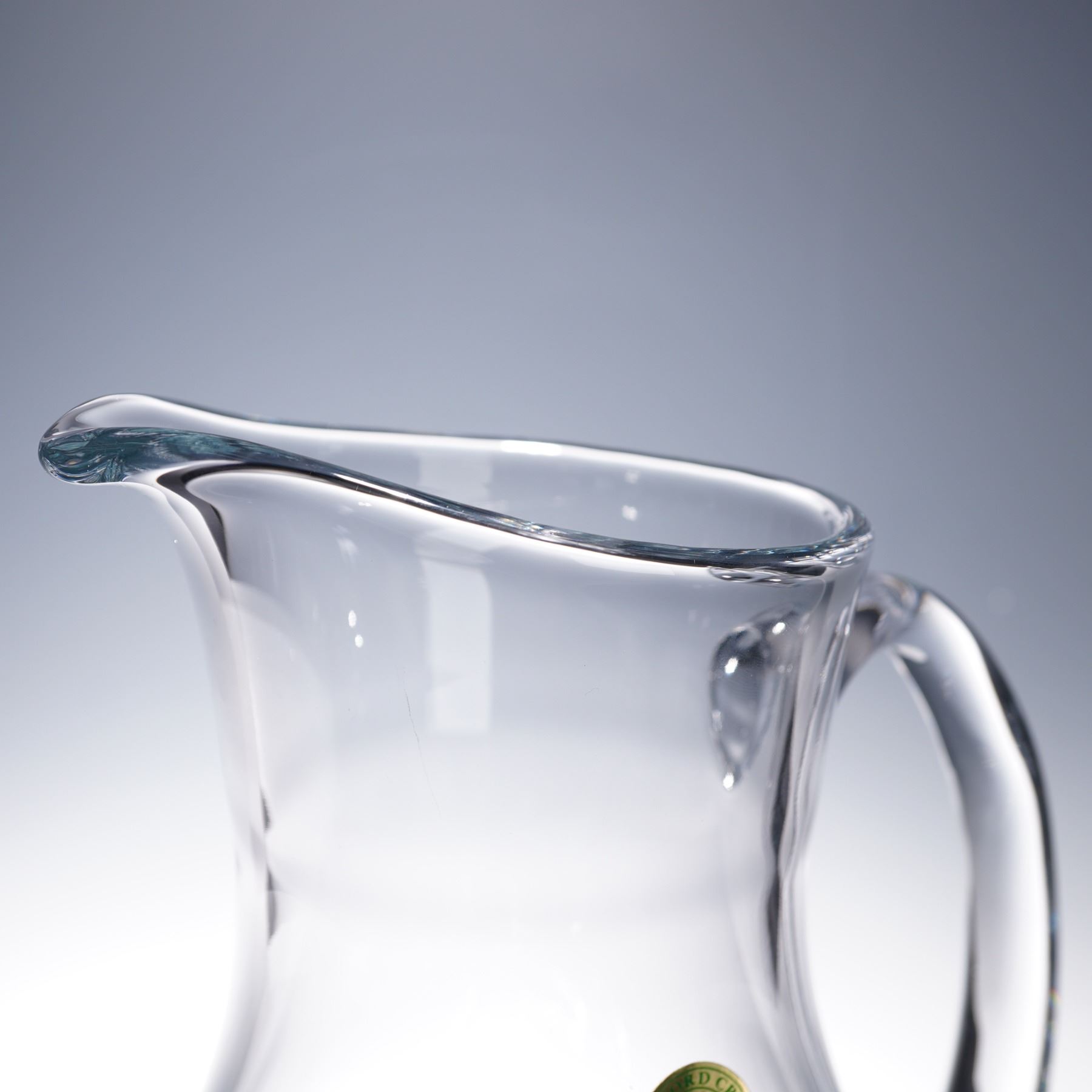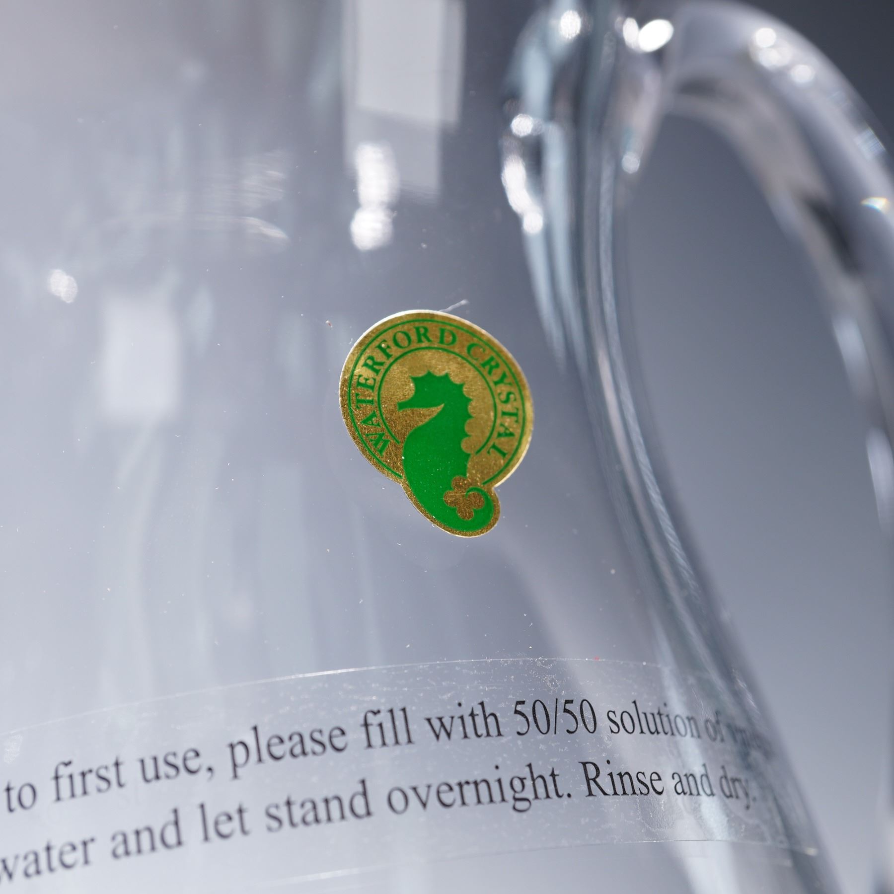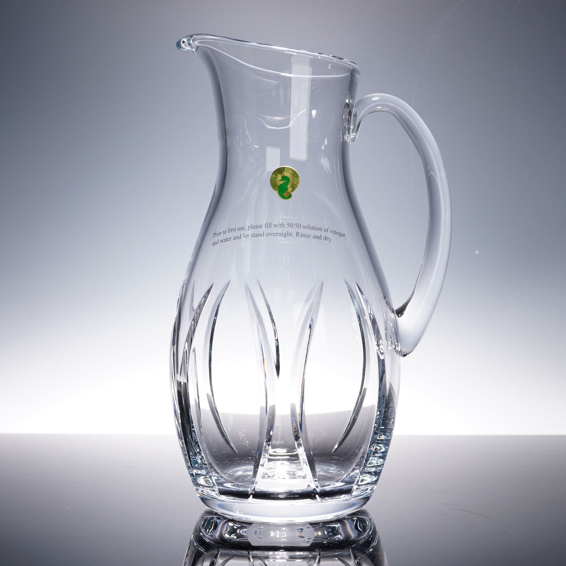 This Waterford Crystal pitcher in the Tonn pattern features elegant curved cuts that highlight its clarity. It carries the original label and acid etched mark. Complete with wide spout and strong handle, it blends function and decoration, and is presented in the original box.