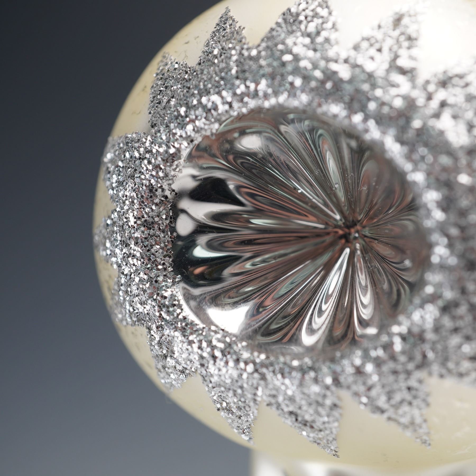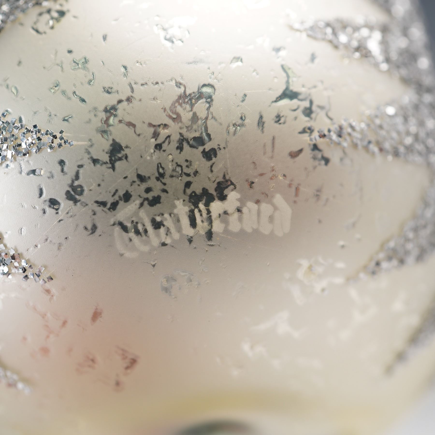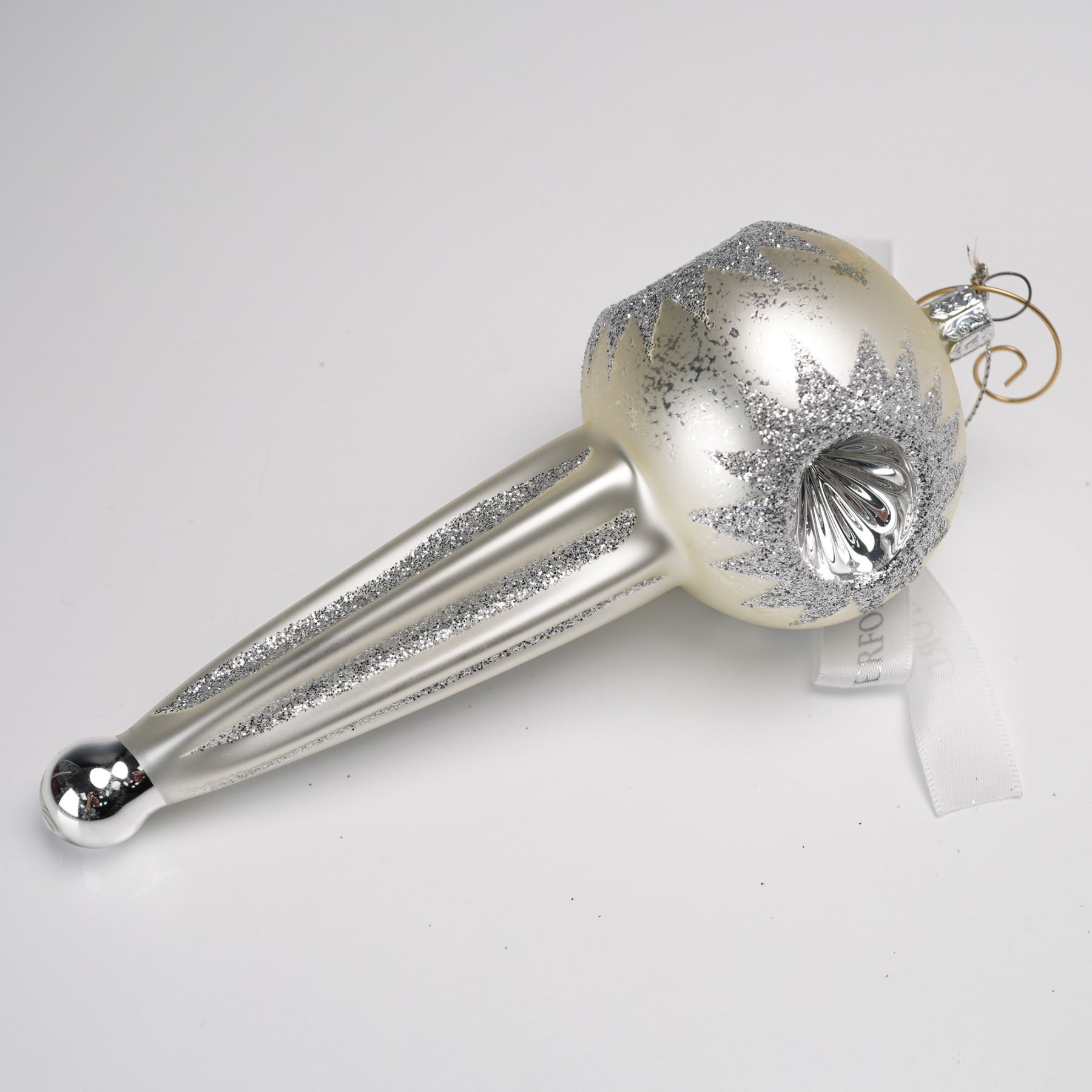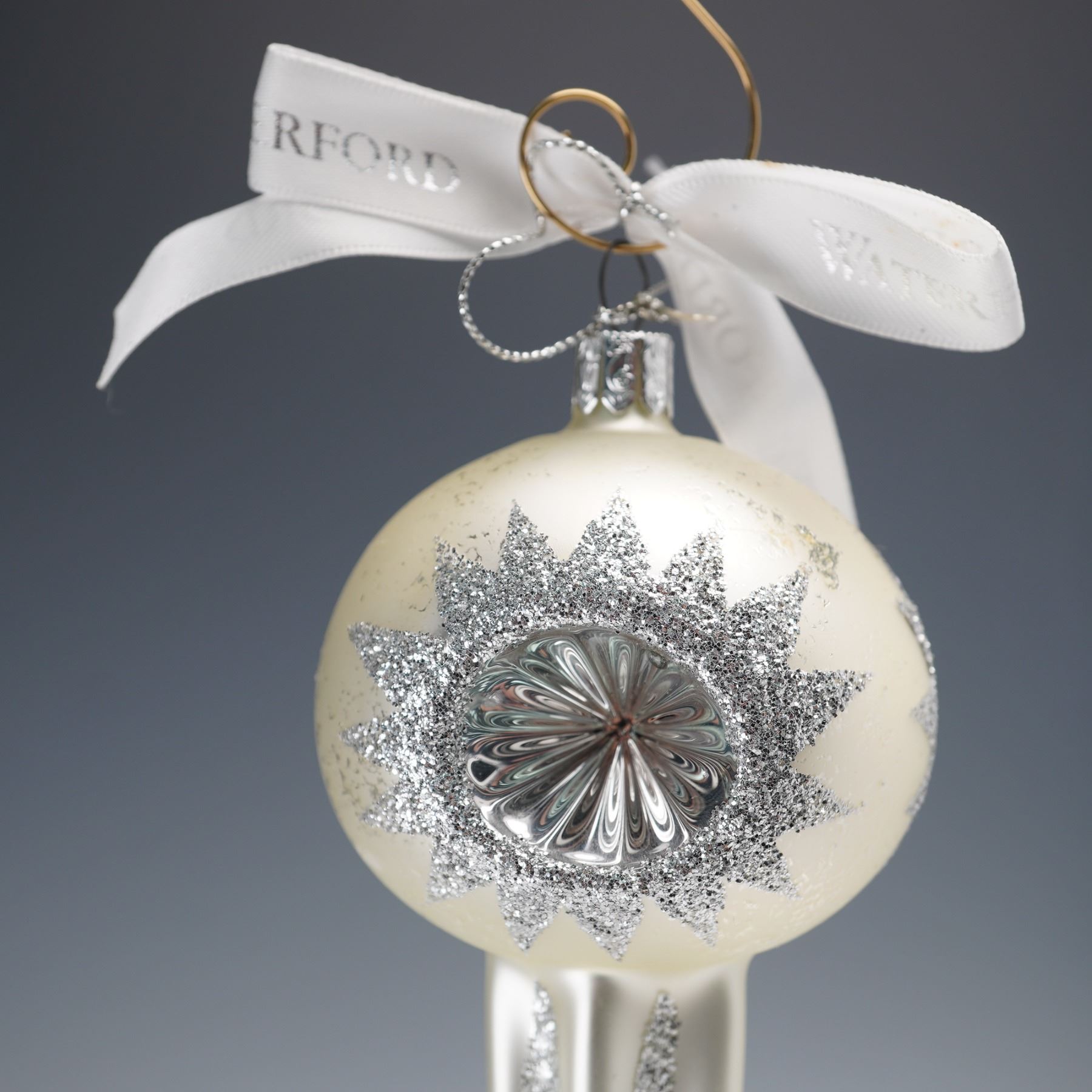 A finely crafted blown glass ornament featuring a luminous pearl-white orb with a deeply indented silver reflector center, surrounded by a radiant burst of silver glitter. The elongated tapered drop below is accented with vertical glitter stripes, ending in a polished silver sphere. The ornament is topped with a silver-toned cap embossed with a decorative "W" and suspended from a white satin ribbon bearing the Waterford name. Includes original presentation box marked "Waterford Holiday Heirlooms". The ornament is also back stamped "Waterford." This item has its original box.
