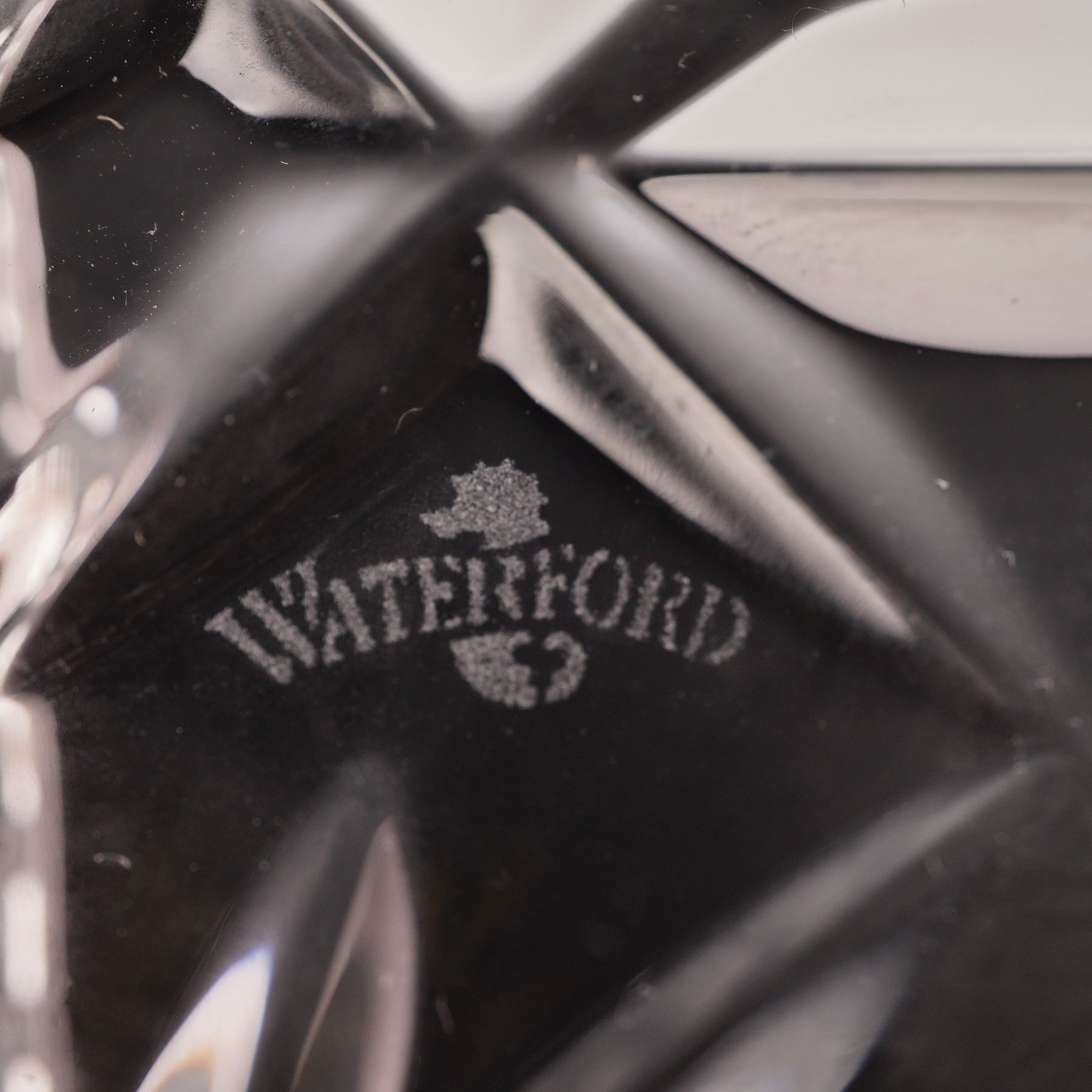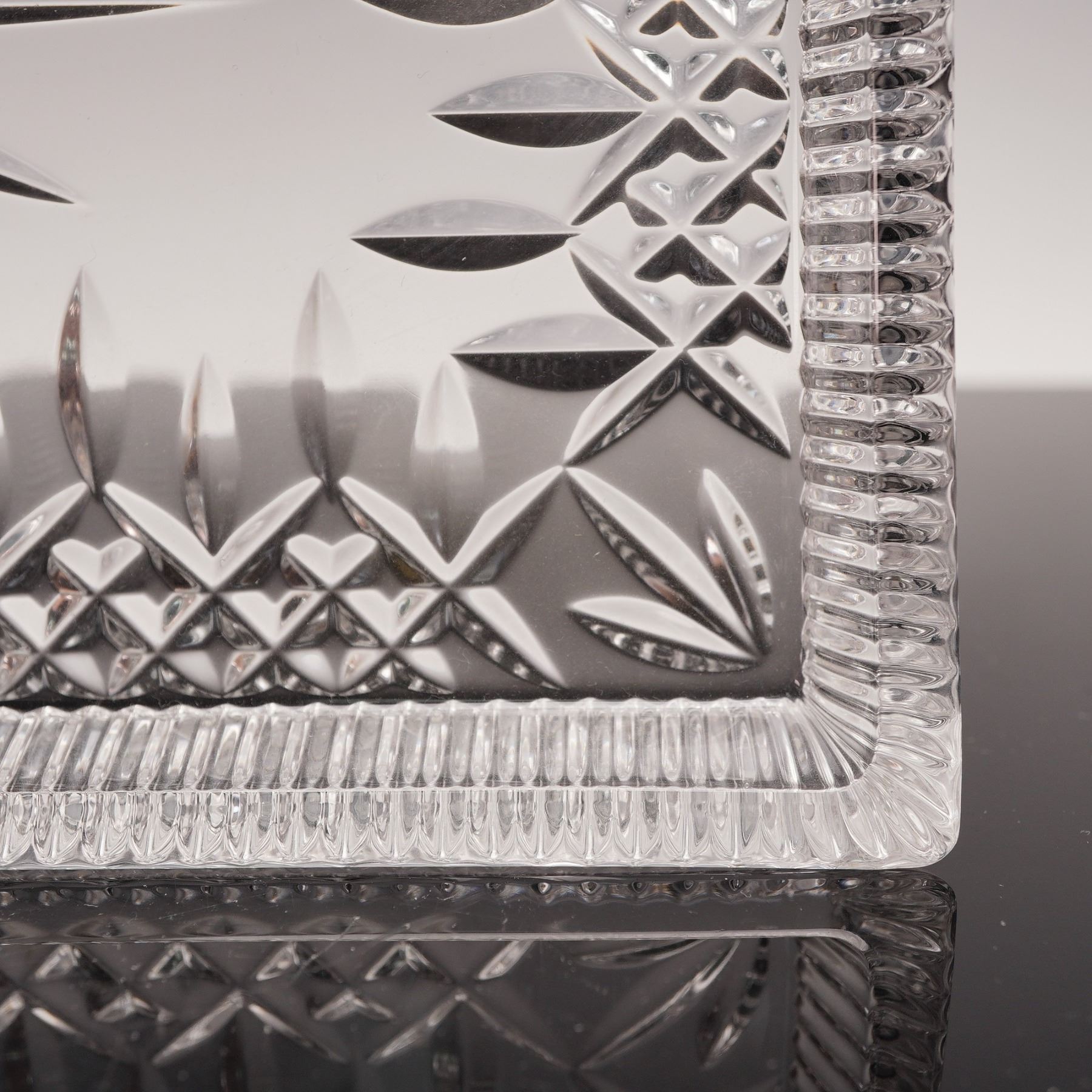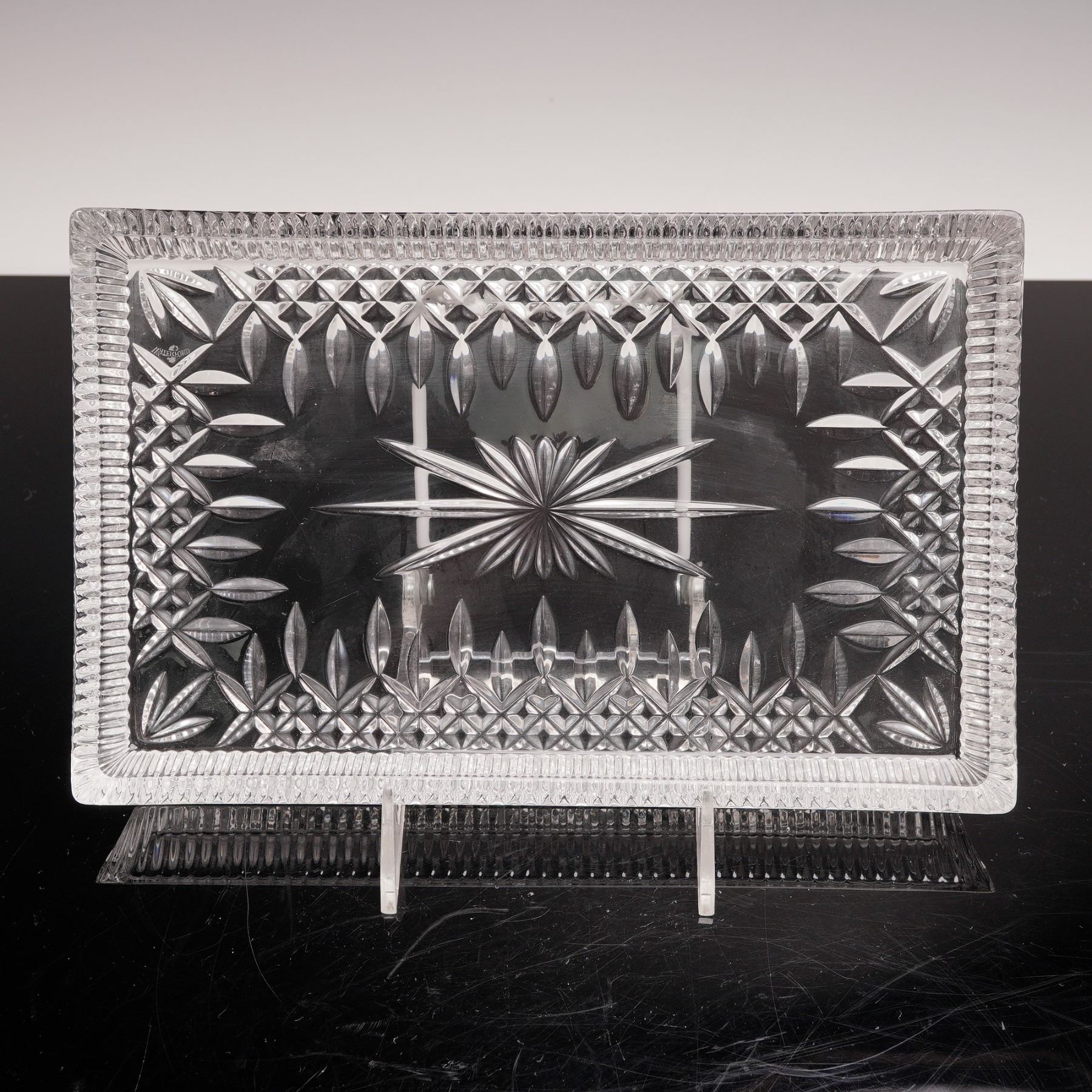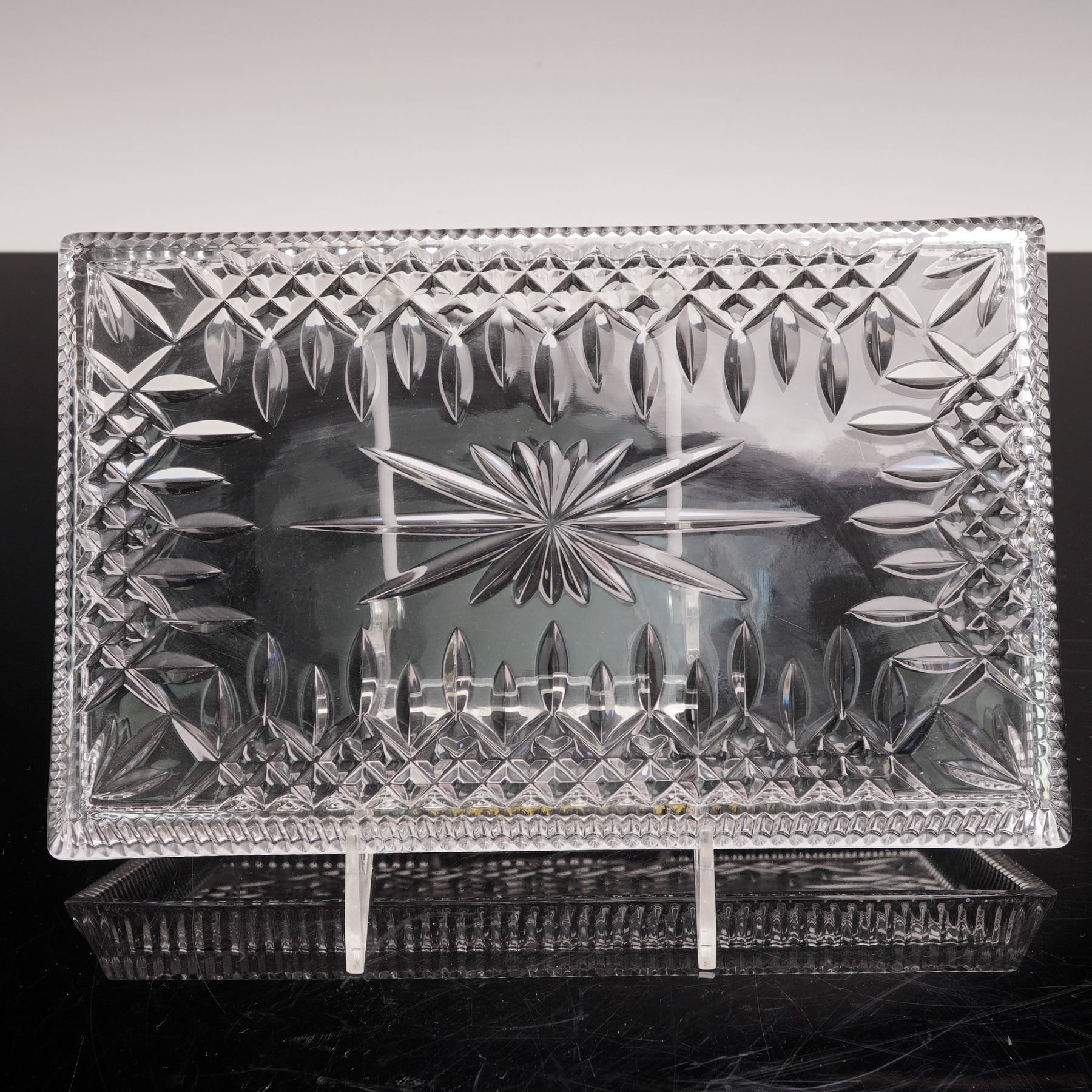 Rectangular cut crystal tray by Waterford in the iconic Lismore pattern, showcasing radiant diamond and leaf cuts with a deeply notched border and brilliant starburst center. The tray is acid-etched Waterford to one corner and displays exceptional clarity and weight. Light shelf wear underneath; overall in excellent condition.
