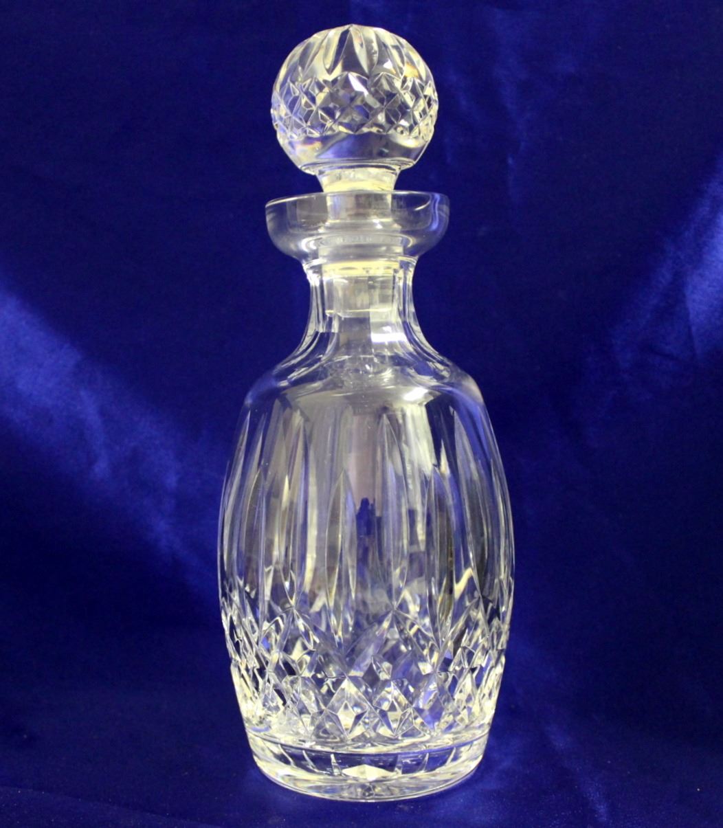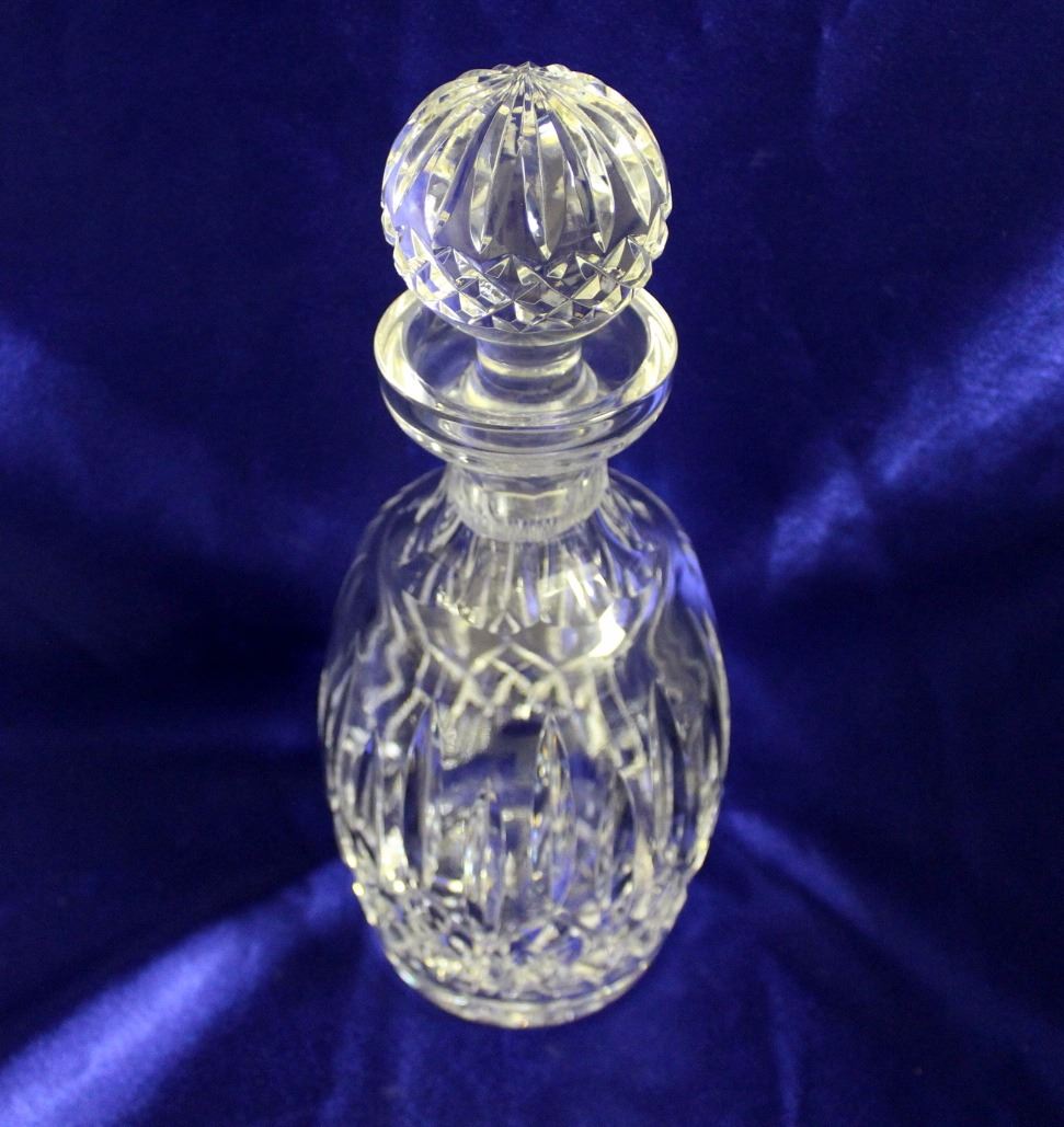 Excellent condition Waterford cut crystal spirits decanter in Lismore pattern. 10 5/8" high including stopper. Faint "Waterford" acid stamp on base.