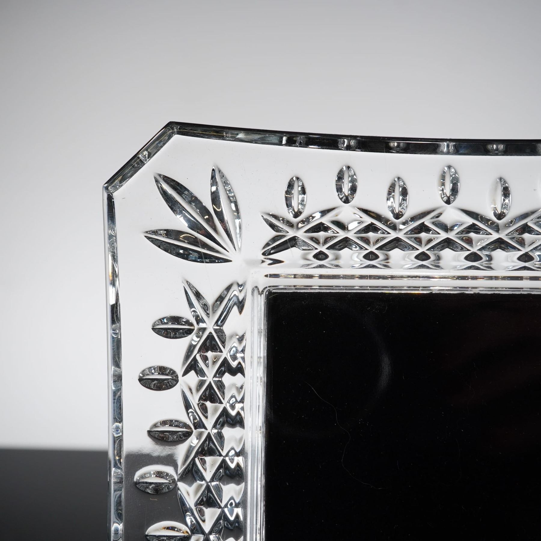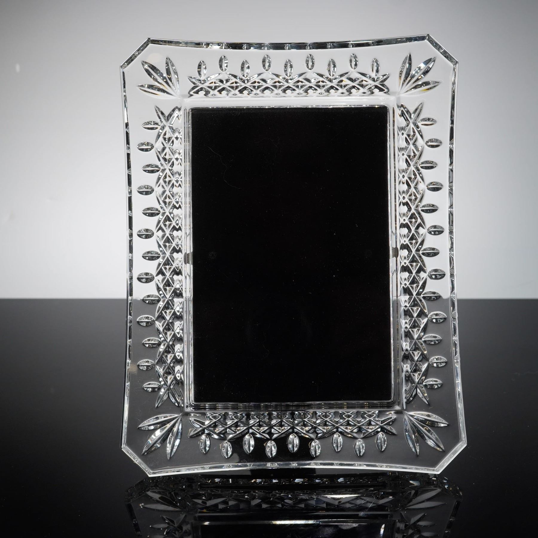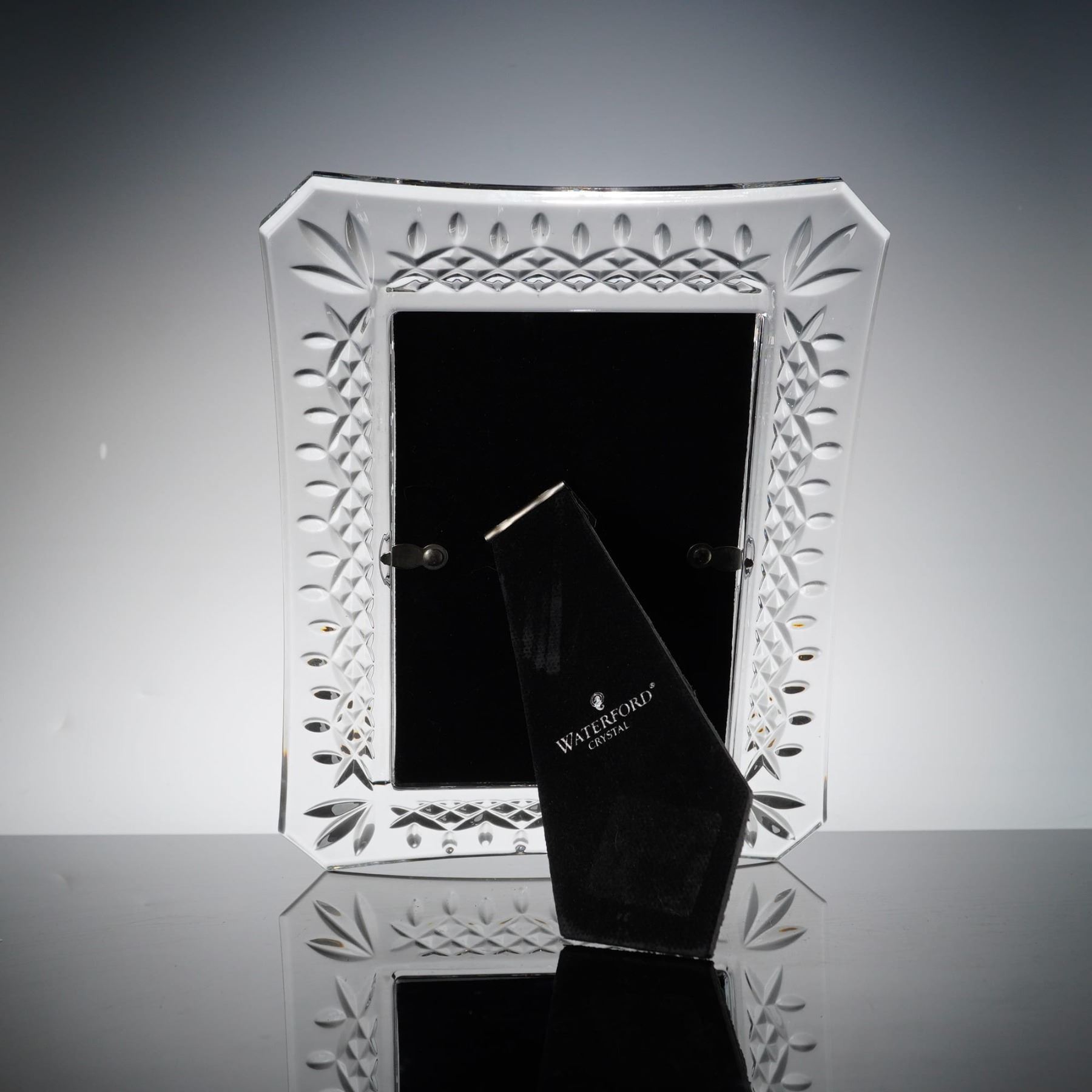 A professional-grade lead crystal picture frame manufactured by Waterford in the world-renowned Lismore pattern. The frame features a traditional geometric cut design characterized by fan-cut corners, cross-hatched diamond bands, and oval olive cuts. The outer perimeter is finished with a precisely notched edge. Crafted from high-quality full-lead crystal, the piece displays exceptional clarity and brilliant light refraction. The reverse features a black velvet-covered easel back for tabletop display, secured with two swivel turn-buttons for photo insertion. The easel back is prominently marked with the gold Waterford Crystal seahorse logo.