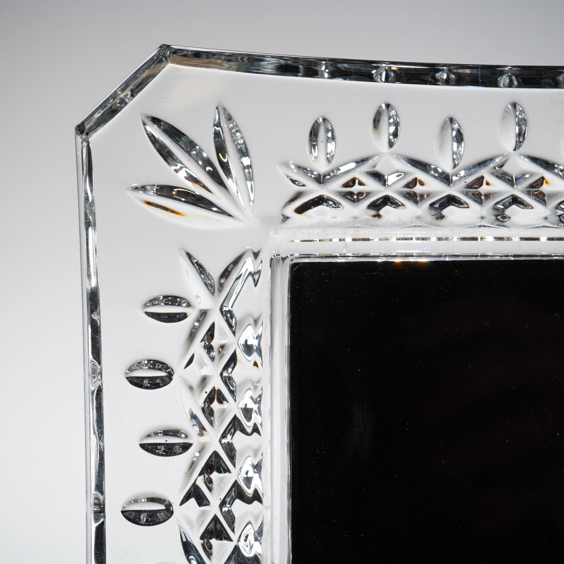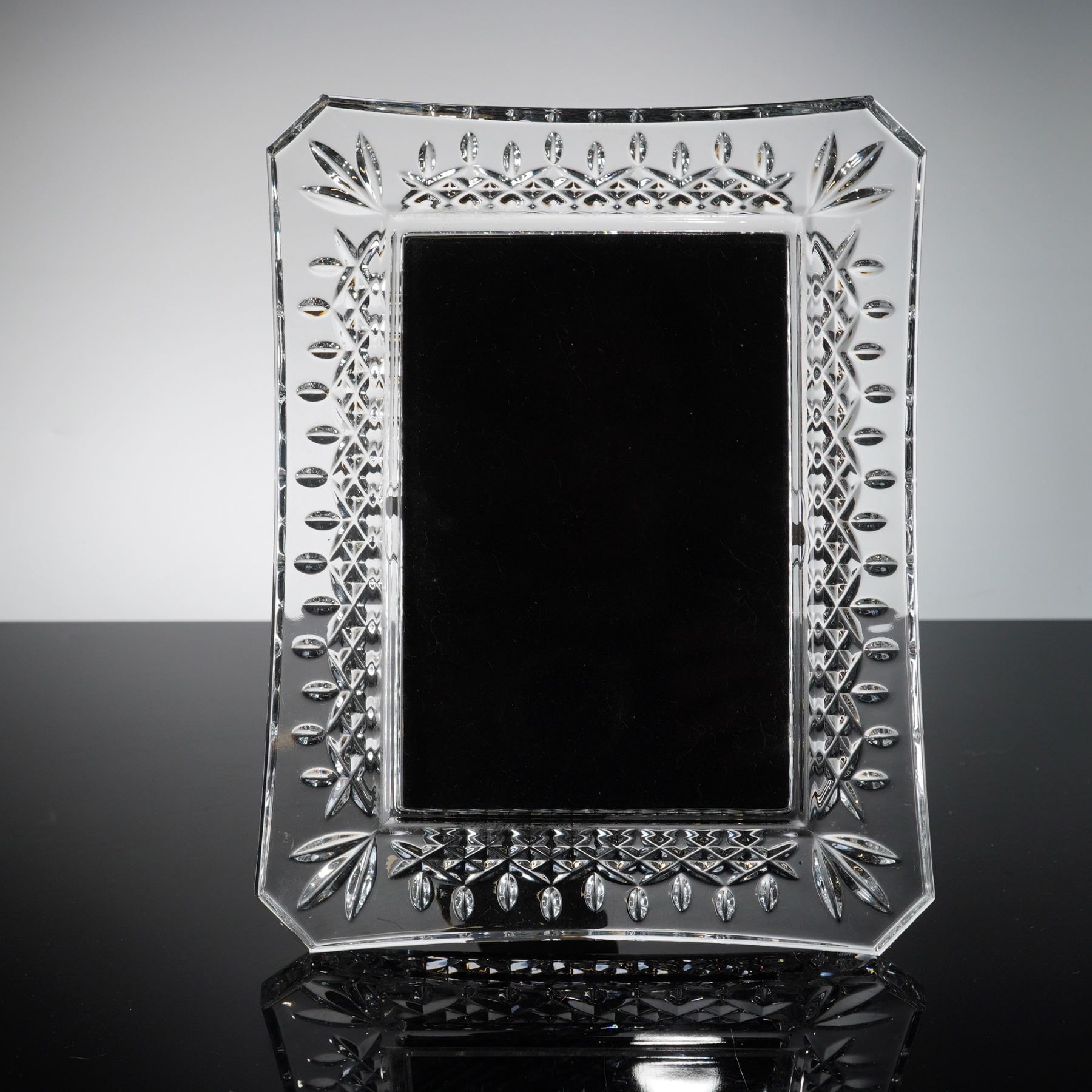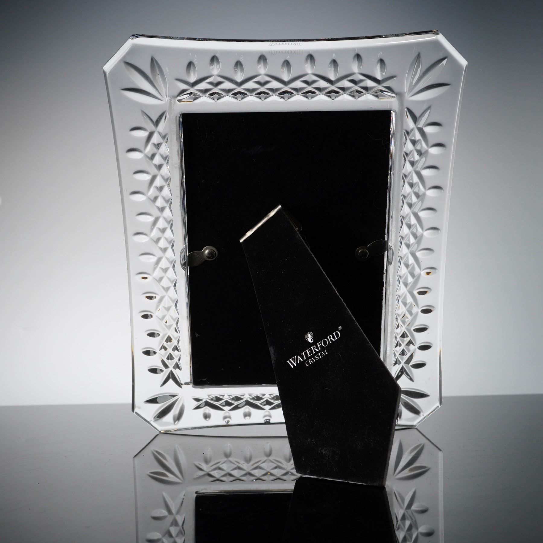 A fine lead crystal picture frame by Waterford in the iconic Lismore pattern. This elegant piece features the classic Lismore design, characterized by a central band of deep diamond wedge cuts accented by rows of oval thumbprint cuts. The frame is designed with canted corners decorated with stylized three-leaf palmette wedge cuts. The crystal exhibits exceptional clarity and brilliance with sharp light refraction. The item bears a faint, acid-etched Waterford wordmark on the top exterior edge. The reverse features a black velvet-lined easel back embossed with the Waterford Crystal name and seahorse logo in silver. This contemporary piece represents the traditional craftsmanship of the Irish manufacturer.