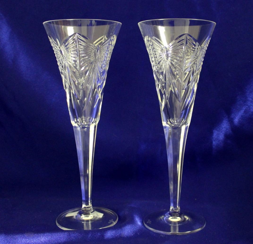 9.25" tall. One has very small chip on rim of base, otherwise in excellent condition. Acid stamped "Waterford" on bases. Part of "Happiness" series.