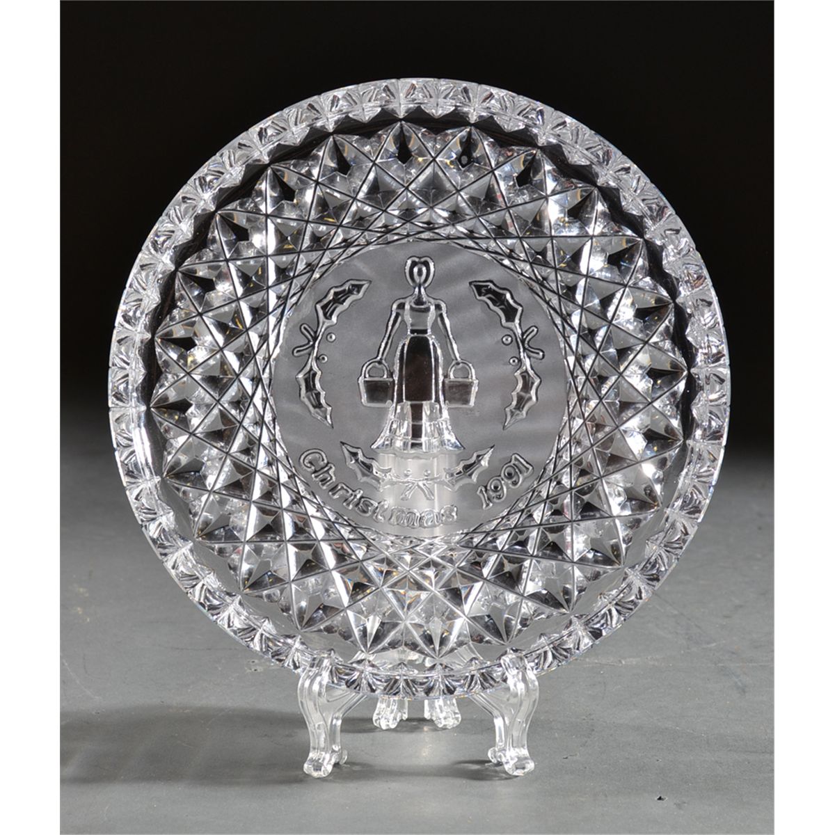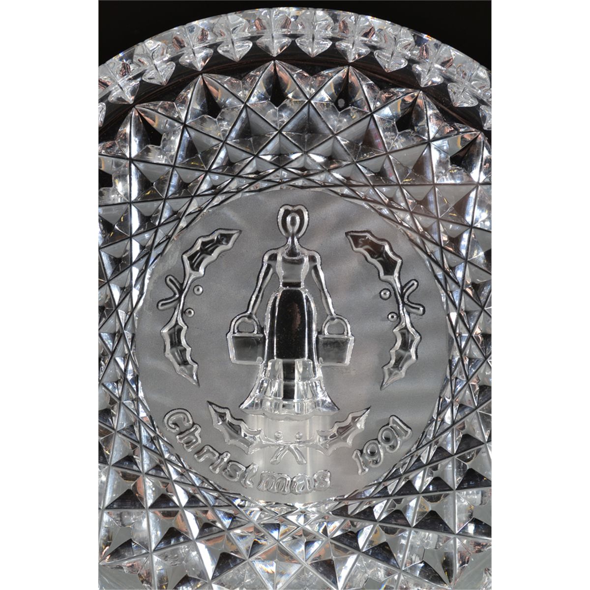 With diamond designs, with central female figure holding baskets, holly and "Christmas 1991." With original fitted red box with satin liner, 8" Dia. Circa 1991. Private collection St. Clair Shores, MI.