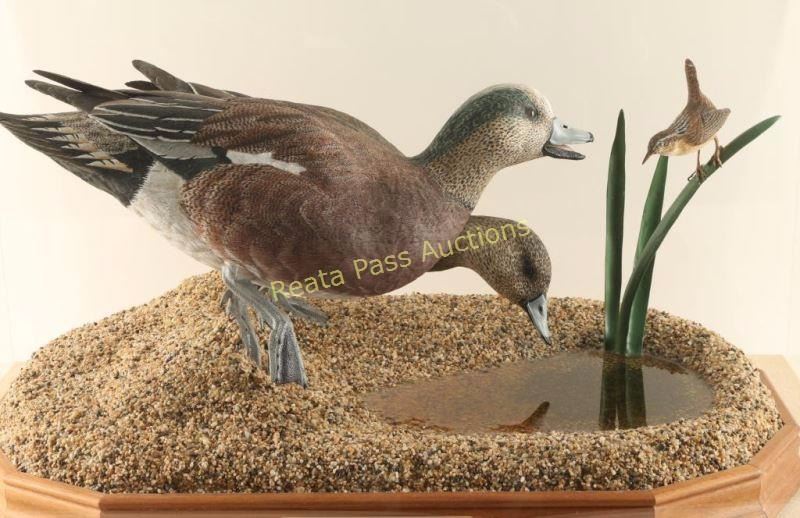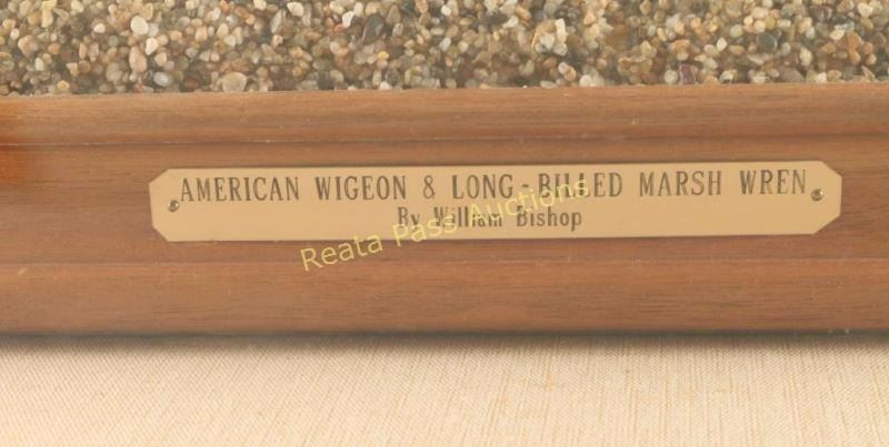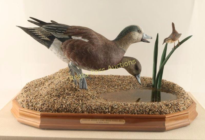 "American Wigeon & Long-Billed Marsh Wren" wood carving. Male and female wigeon on a pebbled surface interact with a marsh wren. Very lifelike with extreme attention to detail. Sculpture sits on wood base in plexiglass box, measures 30 3/4"x18"x20 1/2". William Bishop is a wildlife artist who works in the medium of wood. Each sculpture is an original, detailed carving representing various species of waterfowl. Using natural wood, William brings out the beauty and grain, creating a unique and stunning piece of art. William was introduced to wildlife carving in 1983 when he attended a fund-raising dinner sponsored by Duck’s Unlimited. He was so impressed with wildlife sculpture and the people involved in this realm he began studying books on the subject acquiring a great admiration for this form of art. The dining room in his Santa Monica, California apartment was transformed into an artist studio. He has always wanted to work with wood and in 1986 he took a leap of faith, quit his job at UCLA, and began carving professionally. He did well in competitions, winning many blue ribbon and best of show awards in carving exhibitions throughout the United States. That very next year he was honored with the first place award in Life-Size Decorative Waterfowl category at the Ward Brothers World Championship held in Ocean City, Maryland. Buyer is responsible for shipping this item due to the delicate nature of the piece.