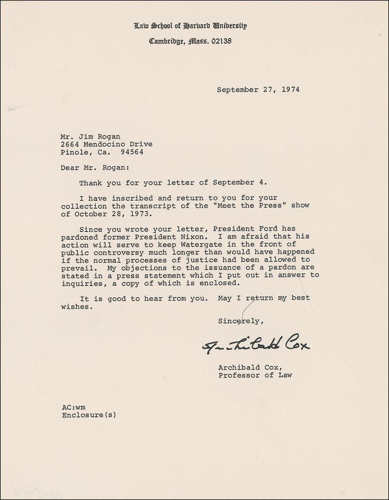 TLS, one page, 8.5 x 11, Law School of Harvard University letterhead, September 27, 1974. Letter to an admirer. In part: “Since you wrote your letter, President Ford has pardoned former President Nixon. I am afraid that his action will serve to keep Watergate in the front of the public controversy much longer than would have happened if the normal process of justice had been allowed to prevail. My objections to the issuance of a pardon are stated in a press statement which I put out in answer to the inquiries.” In fine condition. RRAuction COA.