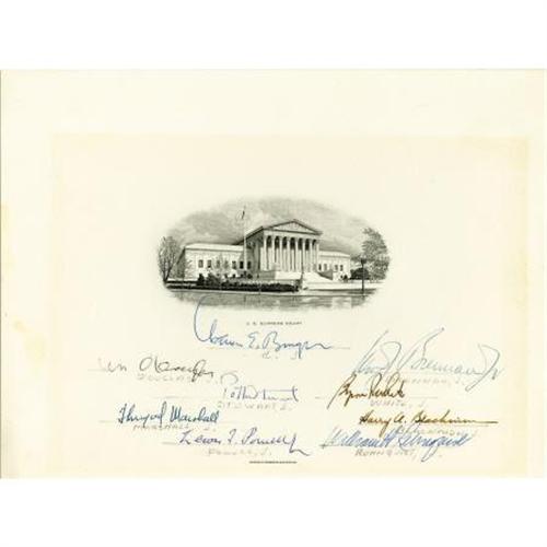 <B>Watergate Court. Supreme Court Building Engraving Signed</B></I> “<I>Warren E. Burger,</B></I>” “<I>Wm O Douglas,</B></I>” “<I>Wm J Brennan Jr.,</B></I>” “<I>Potter Stewart,</B></I>” “<I>Byron R. White,</B></I>” “<I>Thurgood Marshall,</B></I>” “<I>Harry A. Blackmun,</B></I>” “<I>Lewis F. Powell, Jr.</B></I>” and “<I>William H. Rehnquist,</B></I>” 8' x 6” card imprinted at the bottom, “<I>Bureau of Engraving and Printing.</B></I>” Warren E. Burger became Chief Justice of the United States on June 23, 1969. Associate Justices Powell and Rehnquist were sworn in on January 7, 1972. On November 12, 1975, Associate Justice William O. Douglas retired. The Justices who signed this engraving served together from 1972-1975. On July 24, 1974, this Court unanimously ruled that President Nixon must turn over the Watergate tapes; he resigned 16 days later. Light rectangular toning at perimeter of image and signatures from prior framing. A collector has lightly penciled the names of the justices beneath their signatures. Fine condition.<BR><BR><b>Shipping:</b> Flat Material, Small (<a target="_blank" href="http://www.heritageauctions.com/common/shipping.php">view shipping information</a>)