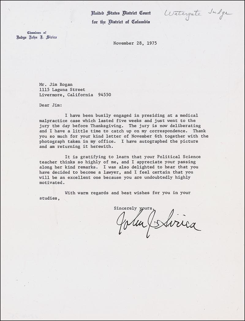 Chief Judge (1904–1992) during the Watergate hearings who effected a pivotal turning point in the investigation when he demanded that Nixon turn over his “secret” recordings of White House conversations. TLS, one page, 8 x 10.5, United States District Court letterhead, November 28, 1975. Letter to a collector and law student. In part: “I have been busily engaged in presiding at a medical malpractice case which has lasted five weeks and just went to the jury…the jury is now deliberating…I was also delighted to hear that you have decided to become a lawyer, and I feel certain that you will be an excellent one.” In fine condition. RRAuction COA.