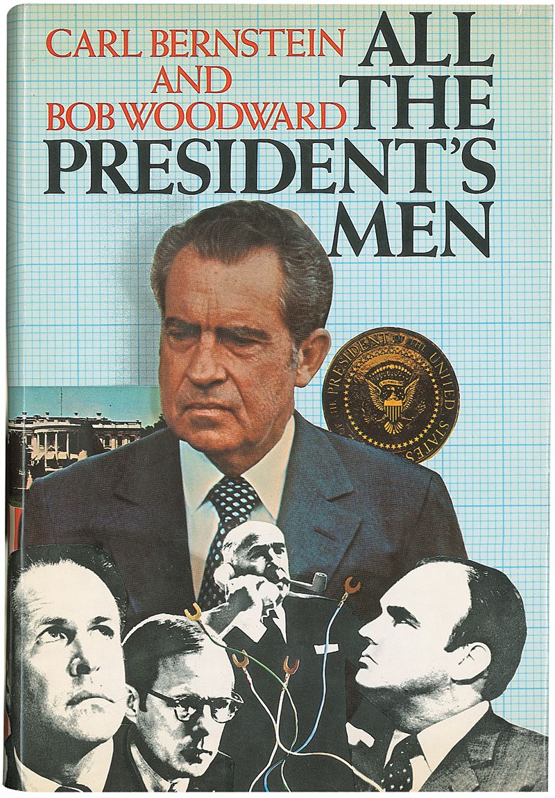 Signed book: All the President’s Men. First edition, later printing. NY: Simon & Schuster, 1974. Hardcover with dustjacket, 6.25 x 9.5, 349 pages. Signed on the title page in black ink by Carl Bernstein, Bob Woodward, and Ben Bradlee. In fine condition, with dustjacket having some light toning, creasing, and a few edge tears.