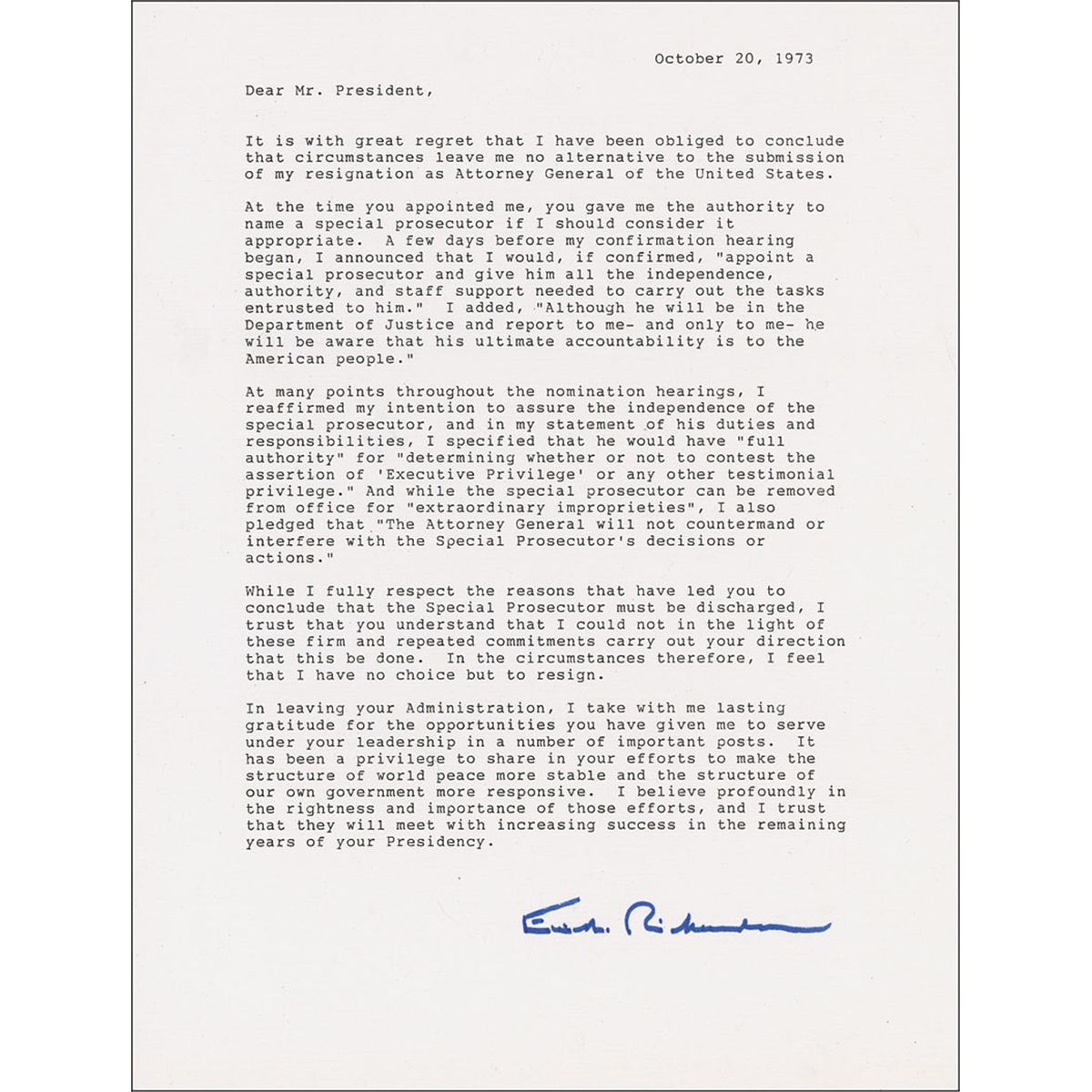 Two souvenir TLSs, each detailing the resignation of Acting Director of the Federal Bureau of Investigation, William D. Ruckelshaus, and Attorney General, Elliot Richardson, during the Watergate scandal, each signed in ink at the conclusion by the respective official. In fine condition.