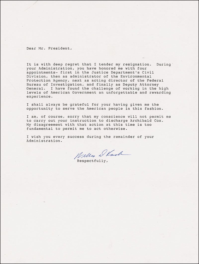 Two souvenir TLSs, each detailing the resignation of Acting Director of the Federal Bureau of Investigation, William D. Ruckelshaus, and Attorney General, Elliot Richardson, during the Watergate scandal, each signed in ink at the conclusion by the respective official. In fine condition. Richardson and Ruckelshaus resigned after refusing to fire special prosecutor Archibald Cox as ordered by Nixon. This became known as the Saturday Night Massacre and was a turning point in shifting public opinion strongly against Nixon.
