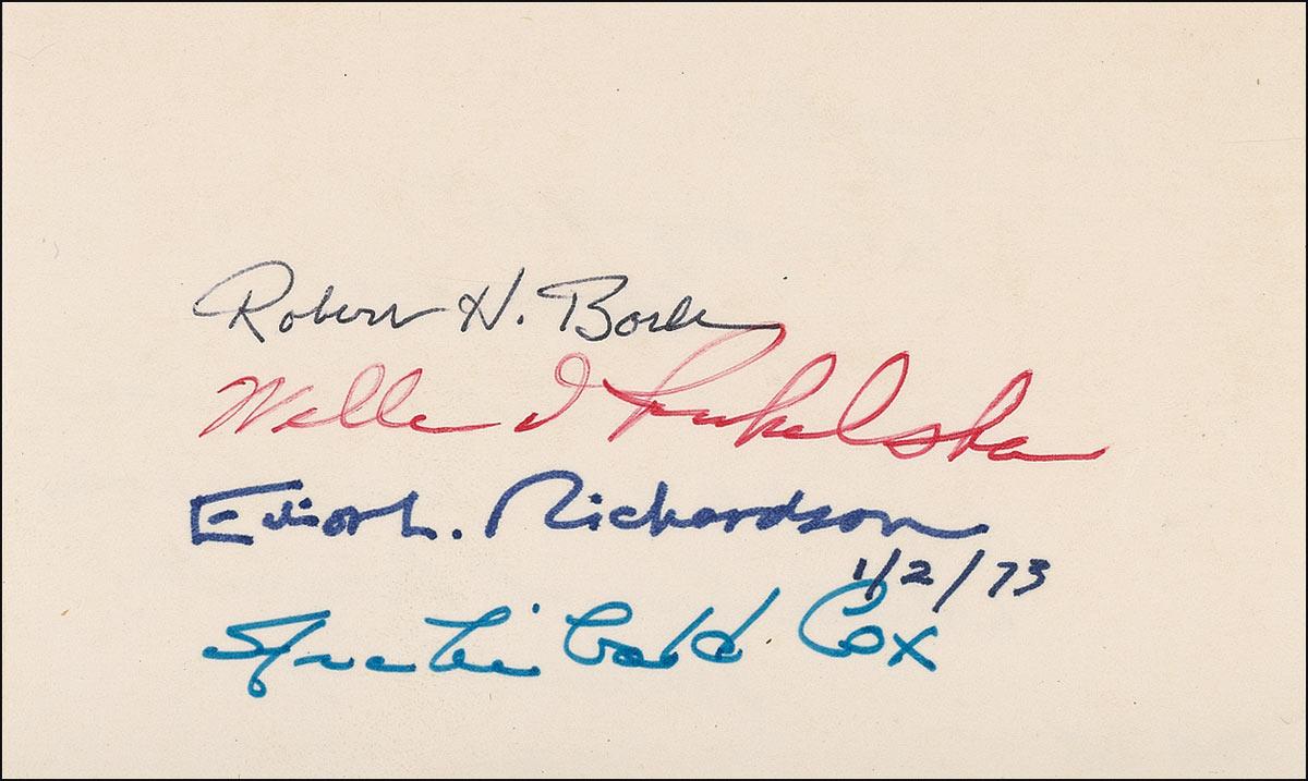 Ink and felt tip signatures of Robert Bork, William Ruckelshaus, Elliot Richardson, and Archibald Cox on an off-white 5 x 3 card. In fine condition. President Nixon acted to dismiss Cox from his office as Special Prosecutor during the Watergate investigation. He contacted Attorney General Richardson and ordered him to fire the special prosecutor. Richardson refused, and instead resigned in protest. Nixon then ordered Deputy Attorney General Ruckelshaus to fire Cox; he also refused and resigned in protest. Nixon then contacted the Solicitor General, Robert Bork, and ordered him as acting head of the Justice Department to fire Cox, which he eventually did. RRAuction COA.