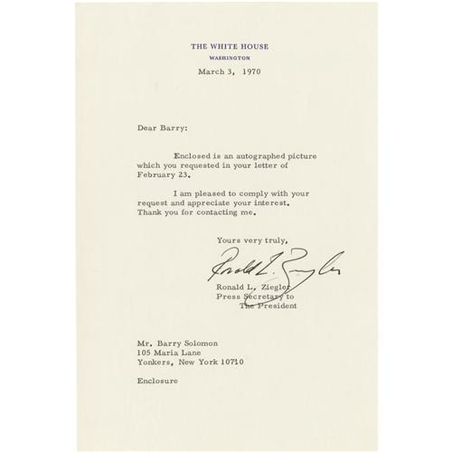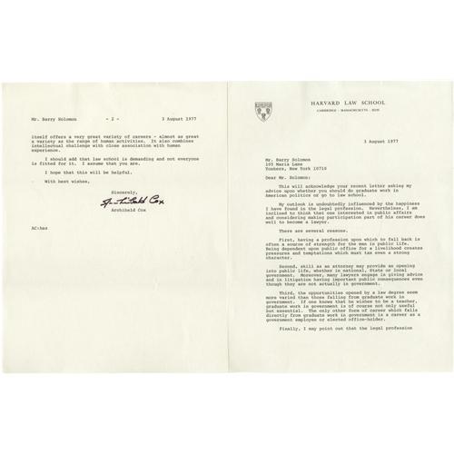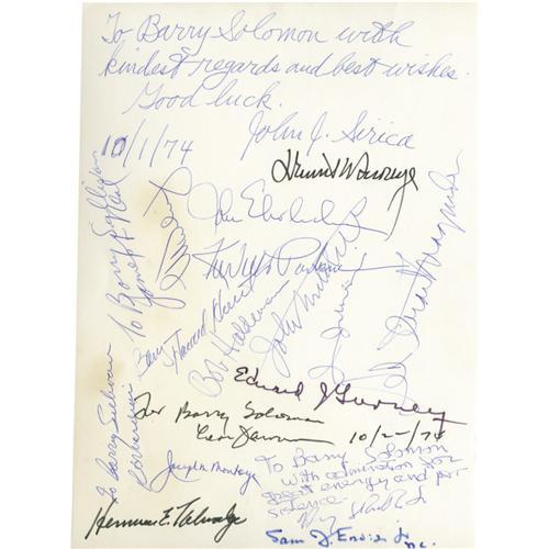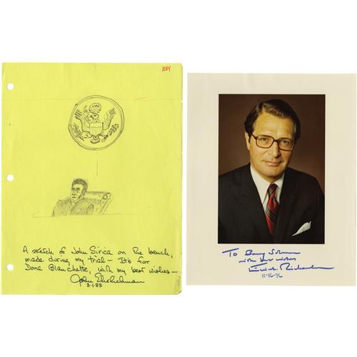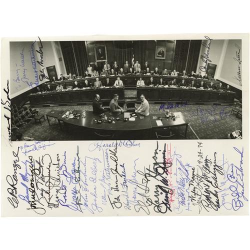 <B>Watergate Scandal Signed Photograph and Other Items.</B></I> One page, 10.5" x 8", np, nd. Includes: an extraordinary photograph of the committee on the Judiciary House of Representatives authorized to investigate whether sufficient grounds exist to impeach Richard M. Nixon, signed by each member of the Congressional Watergate Committee. Also signed by those indicated; Hunt, Magruder, Haldeman, and Ehrlichman. The scandals known as Watergate include the criminal acts of break-ins and bugging at Democratic National Headquarters in Washington, the subsequent cover-up, various acts of sabotage against the Democrats in the 1972 presidential campaign, secret payments of hush money to the Watergate burglars, the burglary of the office of Daniel Ellsberg's psychiatrist, Richard Nixon's federal tax return claims and perjury in connection with the investigation into a possible connection between the settlement of antitrust suits against the International Telephone & Telegraph Co. and its pledges for money for the Republican National Convention. In all 26 former Nixon aides and agents pled guilty or were convicted. The scandal forced Nixon to resign from office in disgrace. The signed photograph has been signed by all 43 members, mostly on the wide lower white margin. In addition, the reverse has been inscribed and signed by John J. Sirica (dated 10/1/74) and signed by John Ehrlichman, Jeb Magruder, Bob Haldeman, Leon Jaworski, Howard Hunt, James F. Neal as well as eight others. Accompanied by a TLS and a signed photograph, from Archibald Cox to the same collector; an ink sketch of Sirica beneath the great seal of the United States, inscribed in the lower margin: "A sketch of John Sirica on the bench, made during my trial…with best wishes, John Ehrlichman, 3-1-83". Truly a unique and irreplaceable group of items relating to the Watergate scandal. Very fine condition overall.