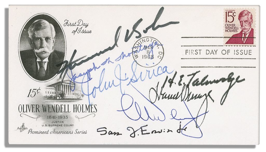 First day cover honoring Supreme Court Justice Oliver Wendell Holmes, signed by seven lead figures in the investigation of the Watergate scandal. Signed in ink or felt tip by Judge John Sirica and five Senators from the Watergate Committee: Chairman Sam Ervin, Howard Baker, Daniel Inouye, Herman Talmadge, Joseph Montoya and Lowell Weicker, Jr. Measures 6.5'' x 3.5''. Fine condition.