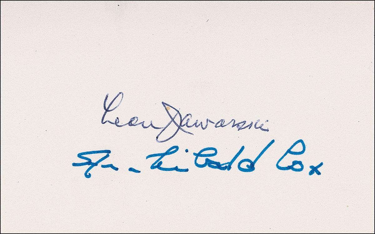 Ballpoint signatures of both Watergate Special Prosecutors: “Leon Jaworski,” and a felt tip signature, “Archibald Cox,” on an off-white 3.5 x 2.25 card. In fine condition. RRAuction COA.