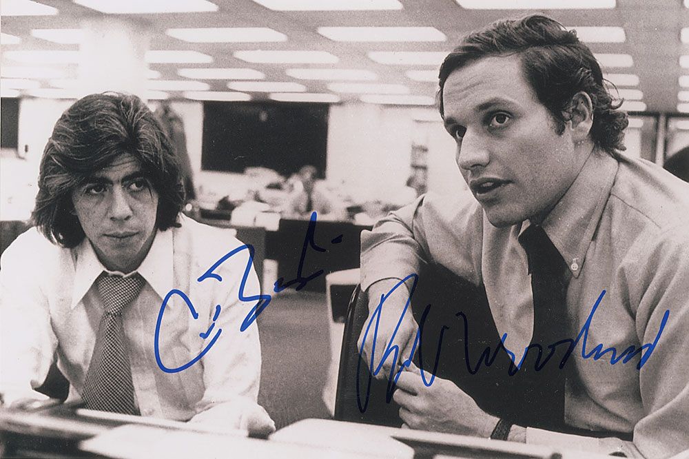 Satin-finish 12 x 8 photo of Bob Woodward and Carl Bernstein in their office, signed in blue felt tip by both. In fine condition.
