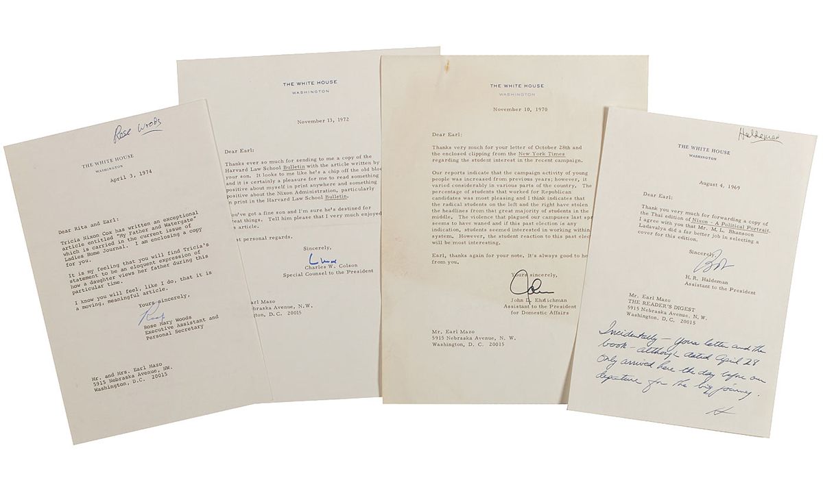 Four one-page TLSs, all on White House letterhead, ranging in date from 1969 to April 3, 1974, all written to Richard Nixon’s friend and biographer, Earl Mazo, each signed by a different staff member involved in the Watergate scandal. Letters are from H. R. Haldeman, signed “Bob”; John Erlichman, signed “John”; Charles W. Colson, signed “Chuck”; and Rose Mary Woods, signed “Rose.” In very good to fine overall condition.