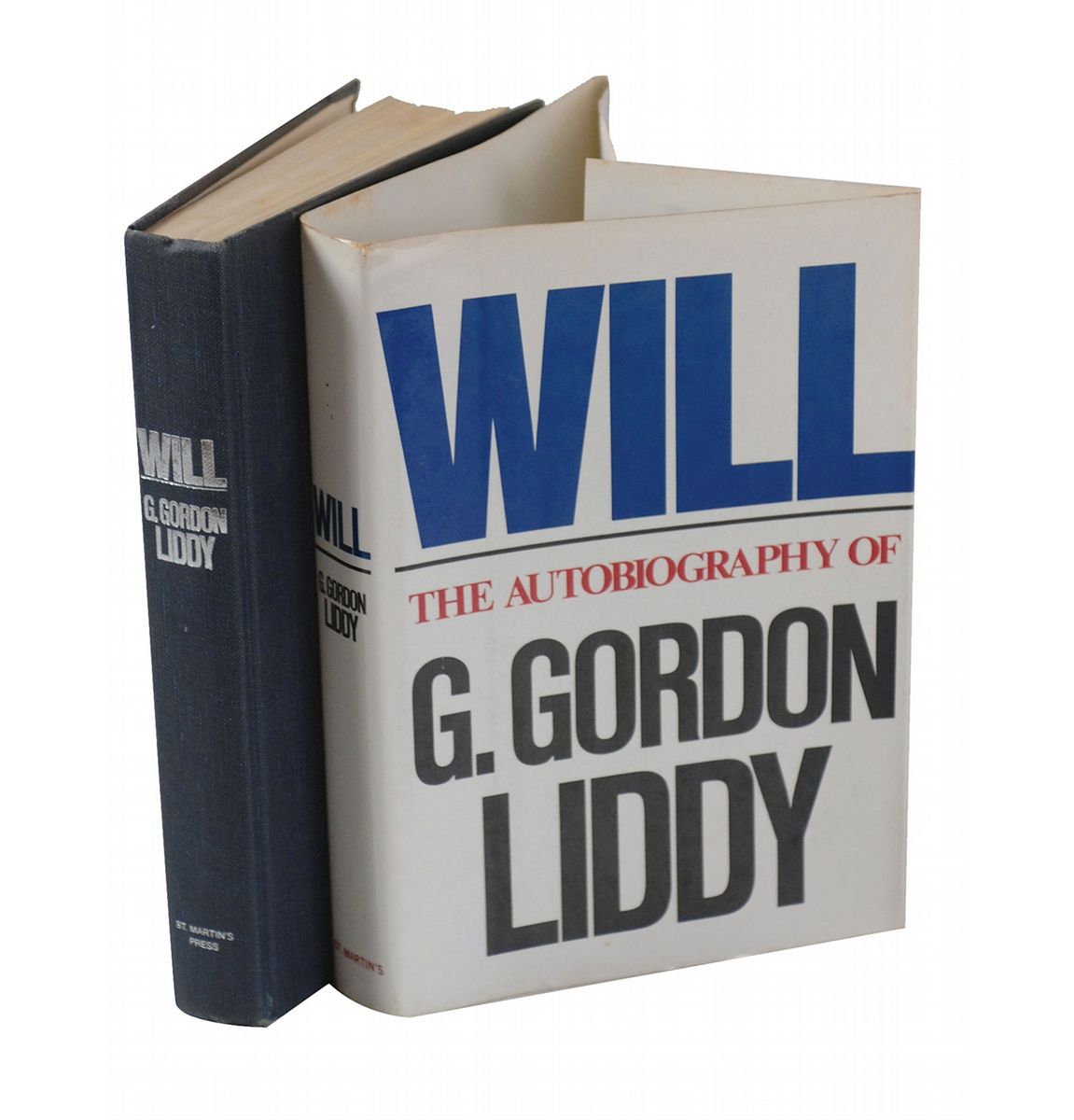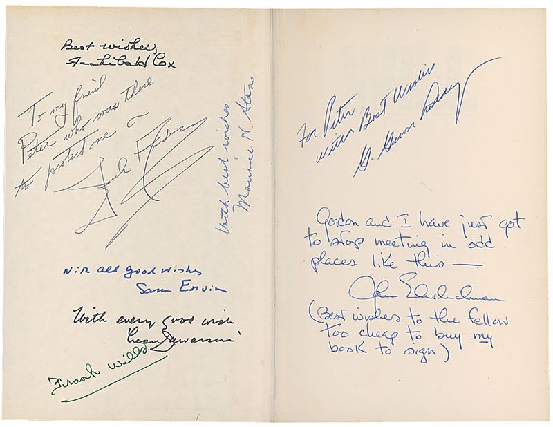 Signed book: Will: The Autobiography of G. Gordon Liddy. First edition. NY: St. Martin's Press, 1980. Hardcover with dust jacket, 6.5 x 9.5, 374 pages. Signed in ink and felt tip on the front pastedown and first free end page by eight men involved in the scandal: G. Gordon Liddy (ins), John Ehrlichman (ins), Archibald Cox, Frank Wills, Sam Ervin, Leon Jaworski, Jack Anderson, and Maurice Stans. Autographic condition: fine. Book condition: VG+/VG+. Navy cloth-covered spine and grey paper-covered boards; light wear to edges; hard bump at rear upper corner; light foxing, almost exclusively to textblock edges. Dust jacket has a few small tears and creases at corners and spine-ends; slightly yellowed upper edge; and minor rubbing, foxing, and soiling.