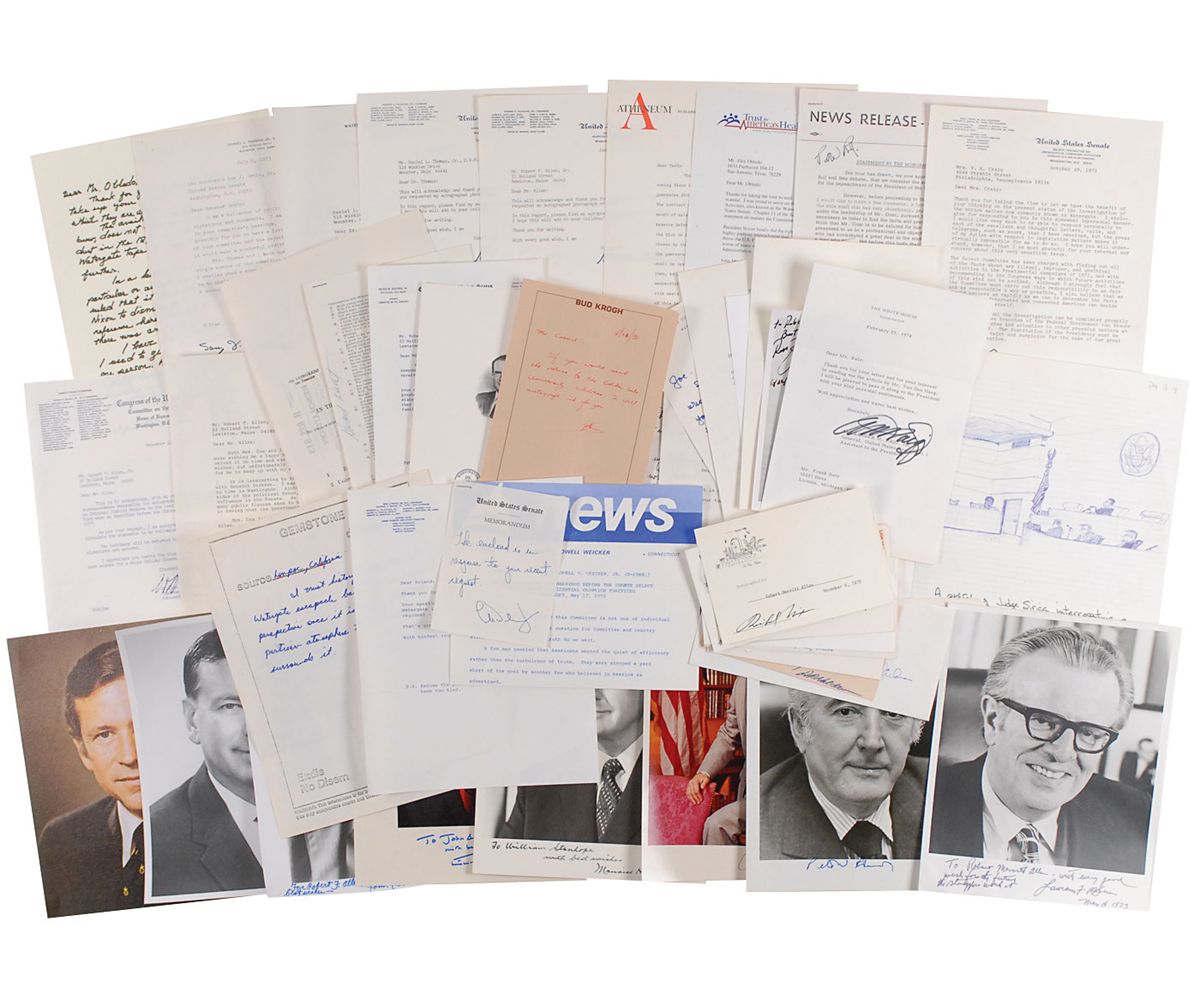Impressive collection of over 140 items consisting primarily of letters, signatures, photos, and covers, each signed in ink by a notable figure in the Watergate scandal, including President Nixon, reporters Woodward and Bernstein, key players Haldeman and Erlichman, and all members of the Senate Watergate Committee. Especially interesting quotes within letters in this archive follow: