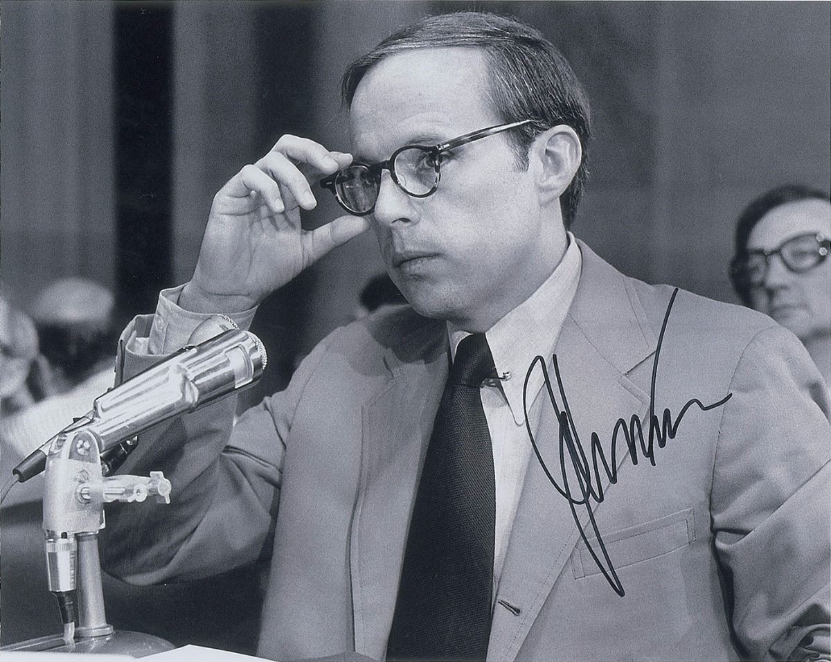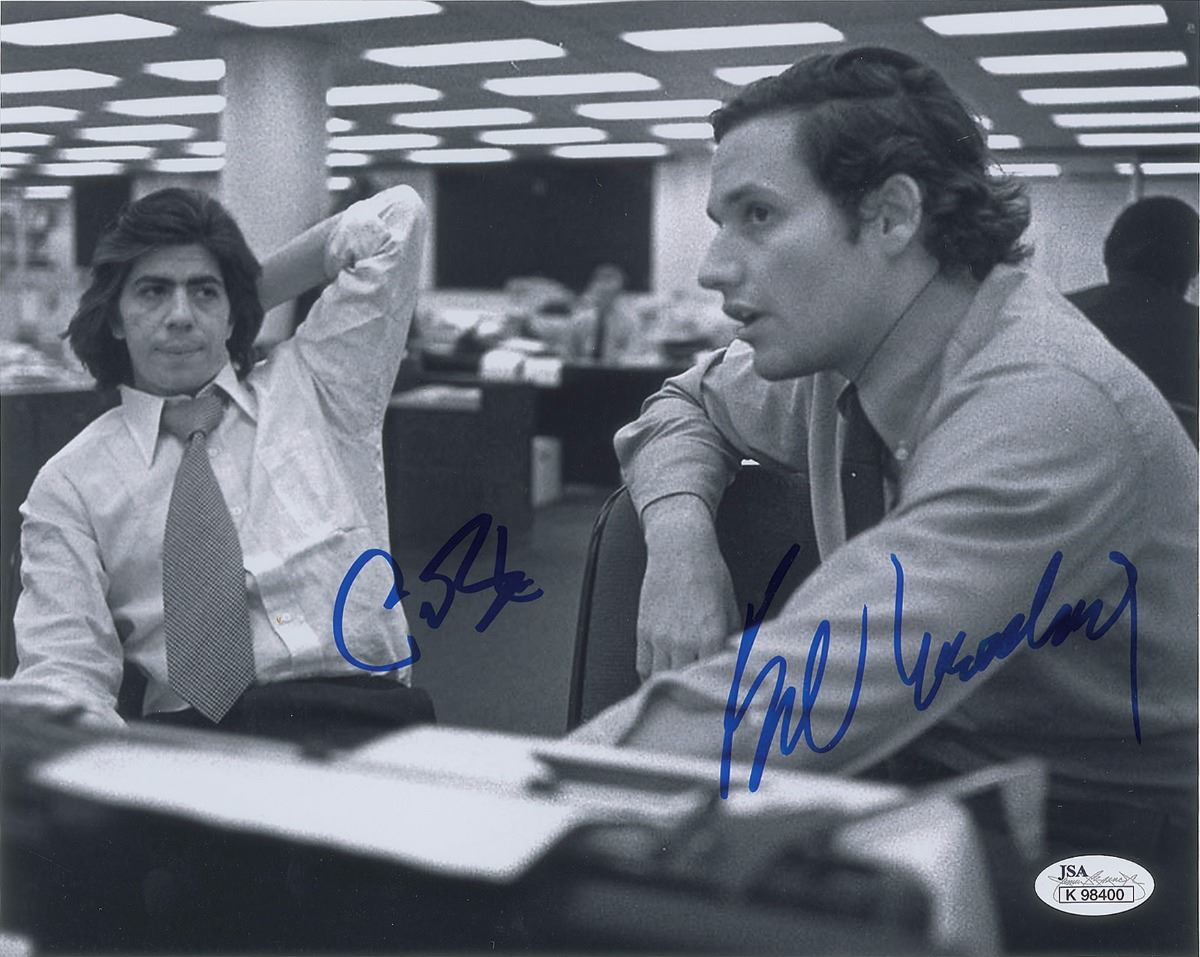 Three photos: a glossy 10 x 8 photo of Carl Bernstein and Bob Woodward, signed in blue felt tip by both; a satin-finish 10 x 8 photo of Bernstein and Woodward, signed in blue felt tip by Woodward; and a satin-finish 10 x 8 photo of John Dean, who served as White House Counsel for Nixon and was termed ‘the master manipulator of the cover-up’ by the FBI, signed in black felt tip. In overall very fine condition, with an expected grainy quality to some of the images. Accompanied by a certificate of authenticity from JSA.