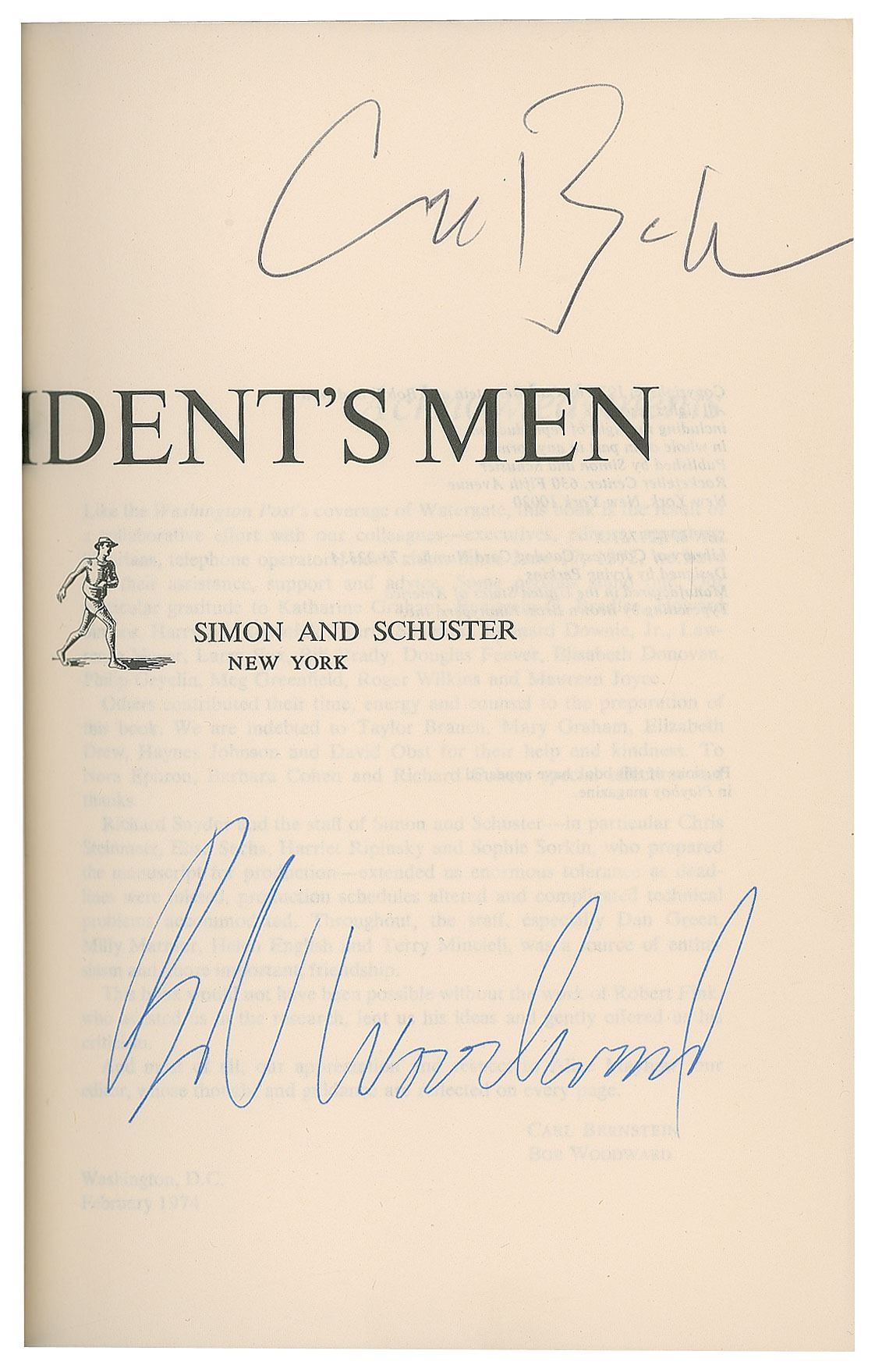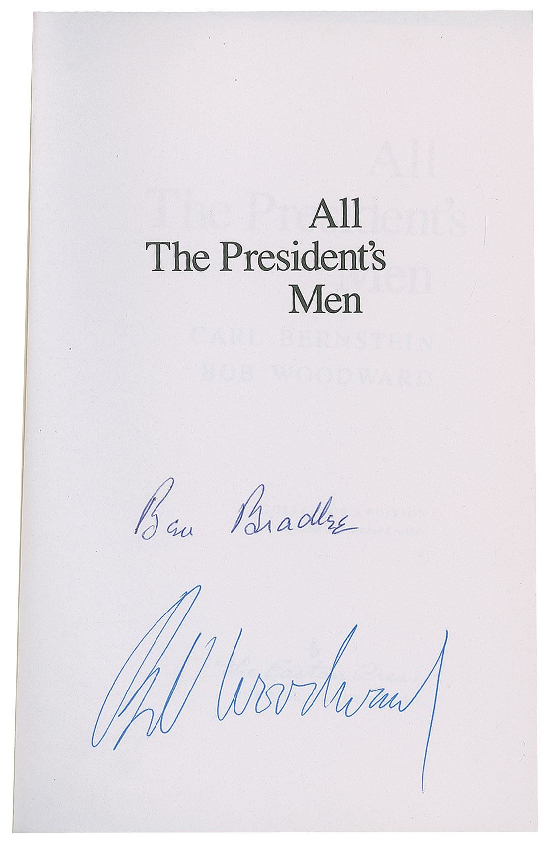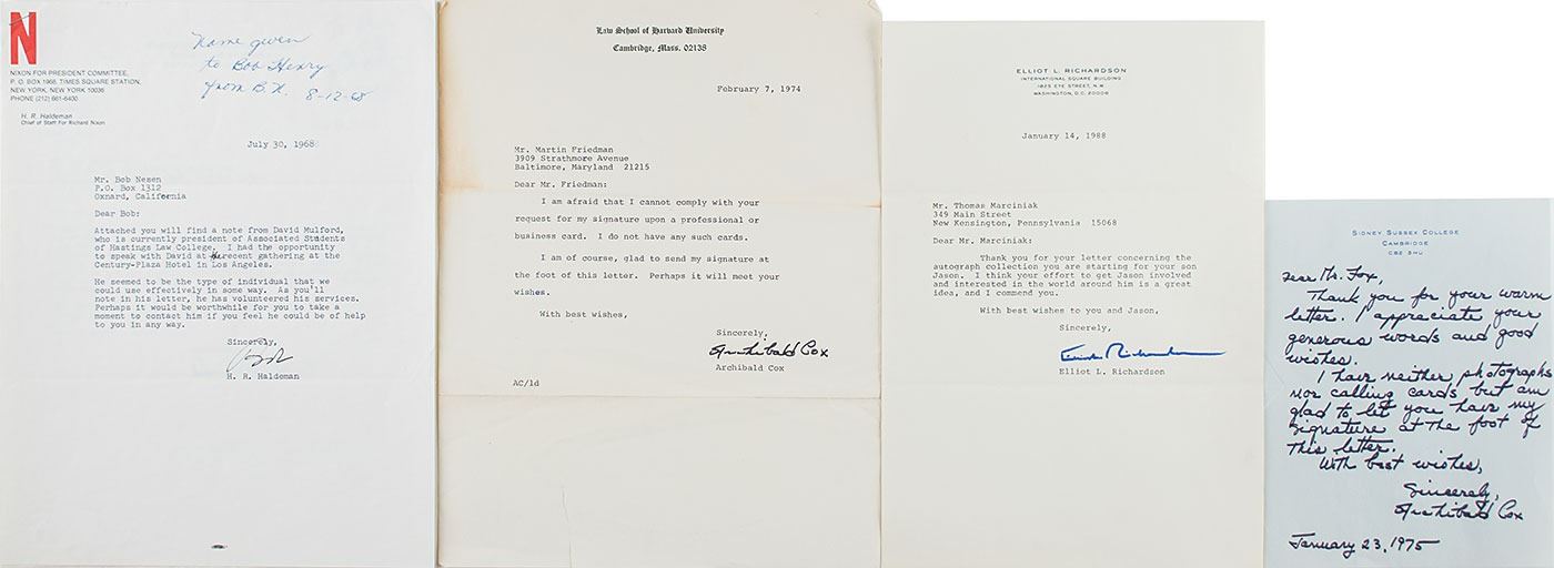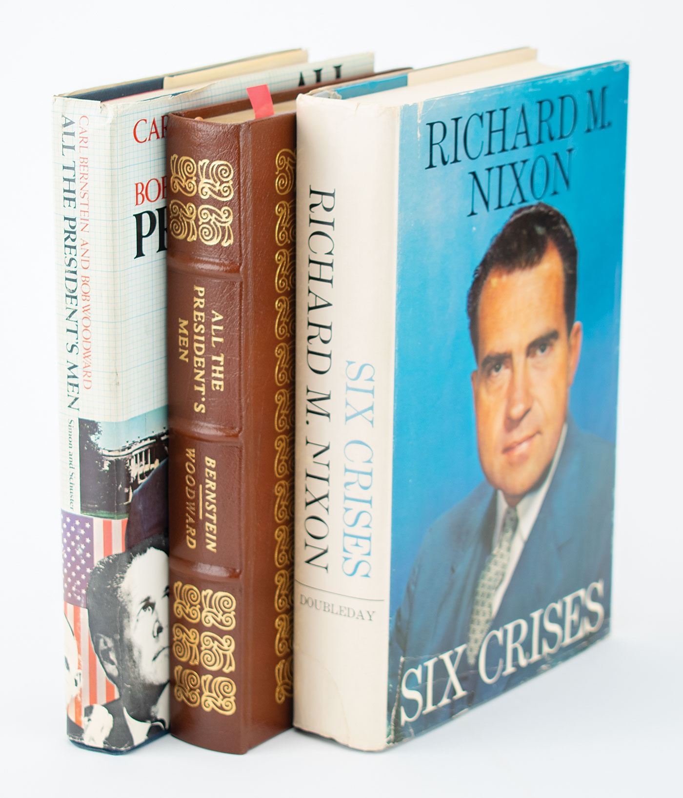 Group lot of seven items signed by notable figures involved with the Watergate scandal, including: Richard Nixon (bookplate affixed to opening page of a Six Crises first edition); Carl Bernstein and Bob Woodward (book, All the President's Men); Ben Bradlee and Bob Woodward (book, collector’s edition of All the President's Men); H. R. Haldeman (TLS dated July 30, 1968, with attached letter from David Mulford); Elliot Richardson (TLS dated January 14, 1988); and Archibald Cox (2 items: an ALS dated January 23, 1975, and a TLS dated February 7, 1974). In overall fine condition.