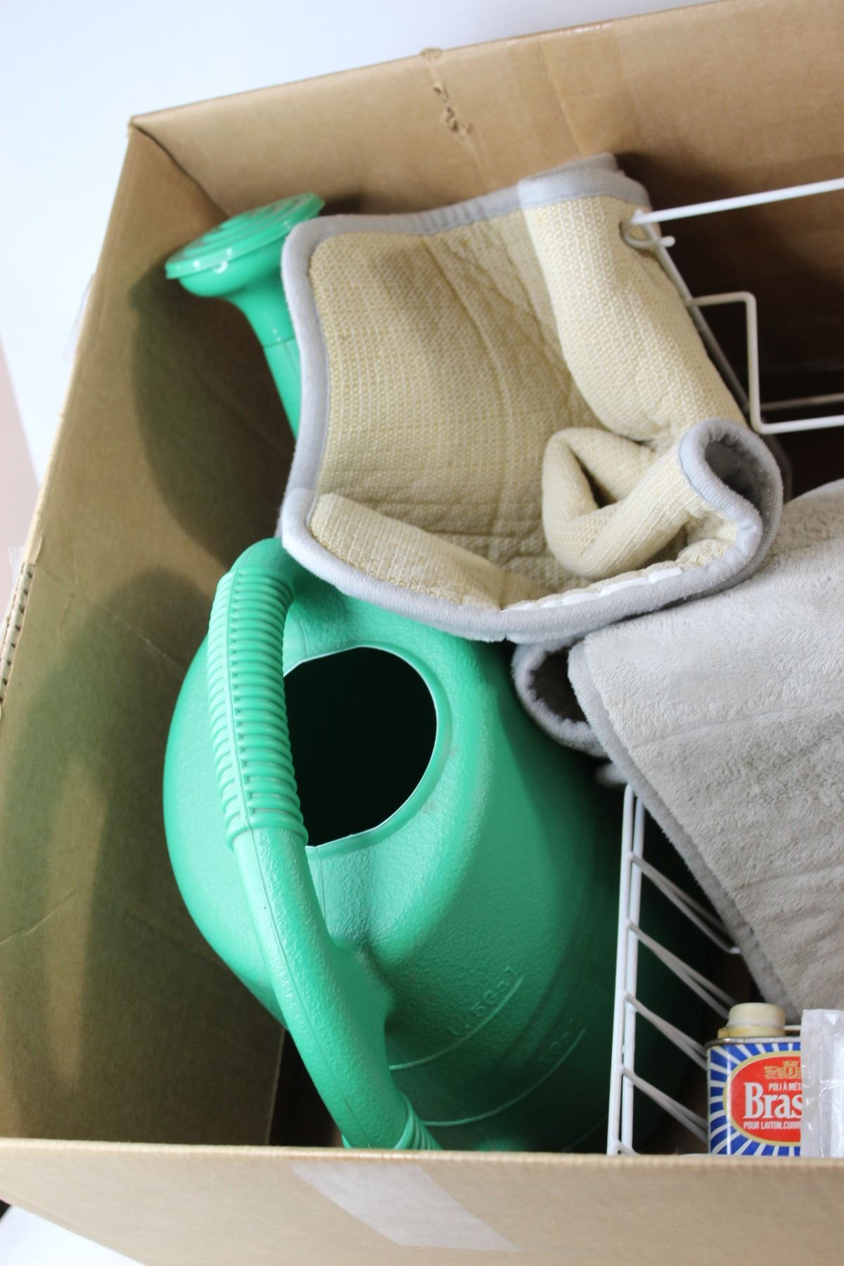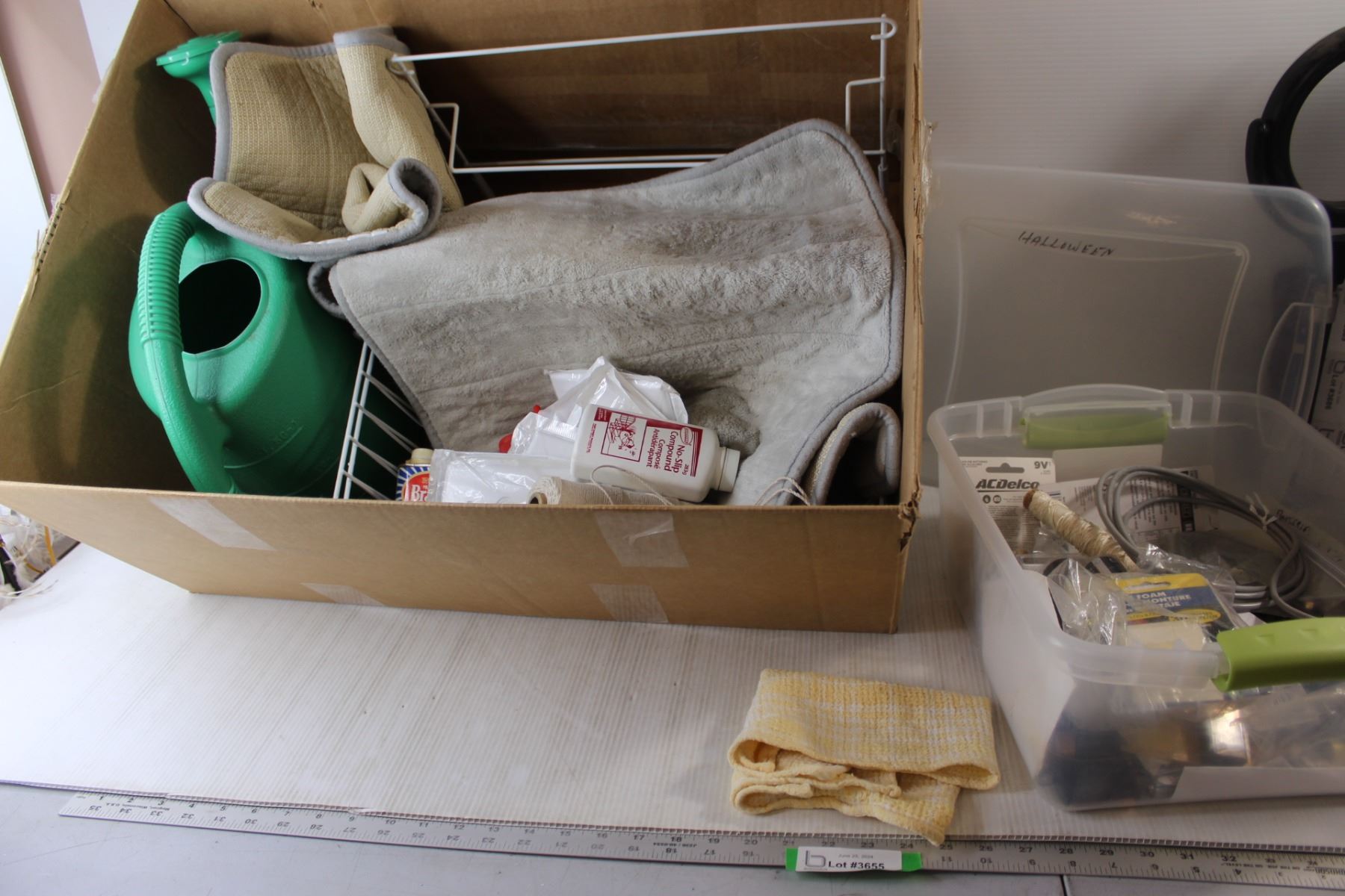 Watering Can, Assorted Batteries, (2) Bath Mats, Misc.