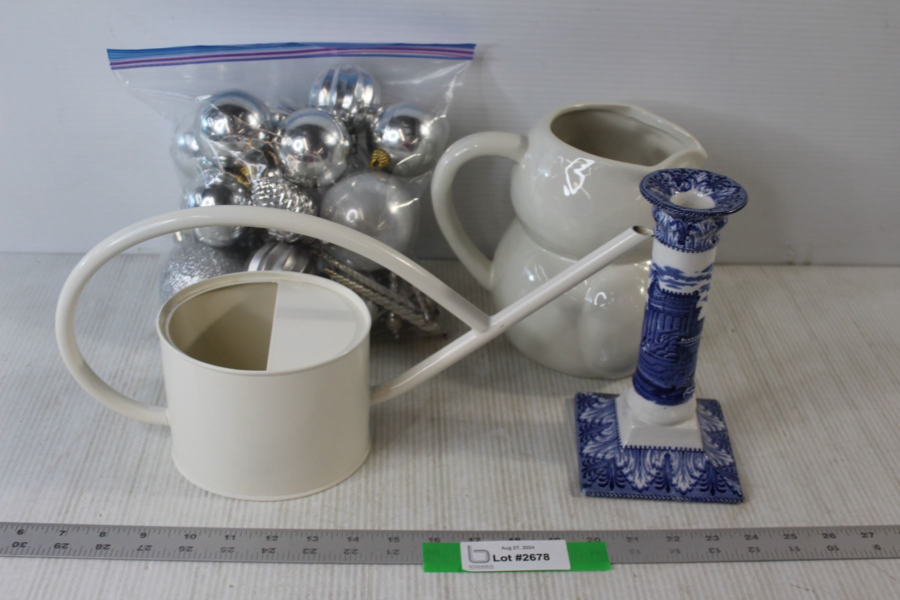 Watering Can, Pitcher With Owl Design, Assorted Christmas Holiday Ornaments, Candlestick Holder