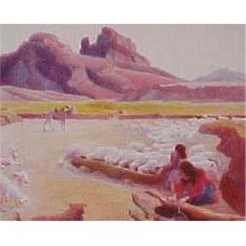 Color Lithograph of Sheep being watered. Titled Watering Sheep by Conrad Buff. Image size 7 7/8 inches high by 10 inches wide. Edition of 100. Artist signed lower right.