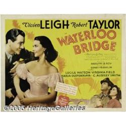 <B>Waterloo Bridge (MGM, 1940)</B></I> Half Sheet (22" X 28"). Vivien Leigh's favorite of her own films, "Waterloo Bridge" is a softer remake of a fairly hard-edged 1930 Broadway play and 1931 James Whale film. In the intervening ten years, the Hollywood Production Code took effect. Therefore, the character of Myra, the unabashed streetwalker, becomes a ballerina forced by circumstances to take up the profession that no one talks about. Luminous images of the gorgeous Leigh and dashing Taylor grace this brightly colored half sheet. Pinholes, edge wear and tears, wrinkles, light edge soiling, a few small stains and a horizontal fold along the upper border. Rolled, Fine-.