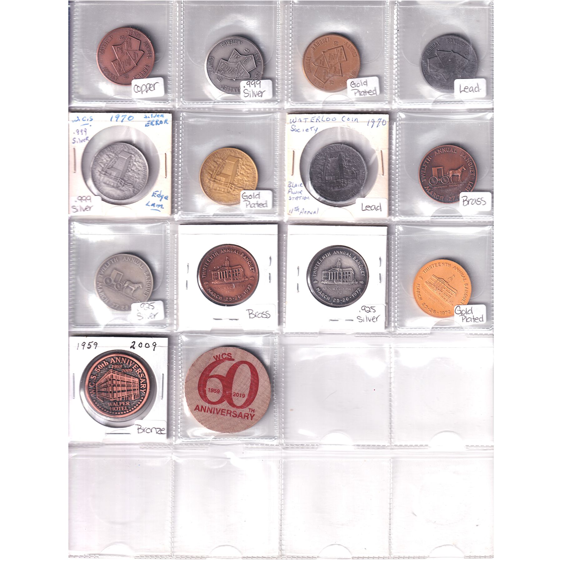 Waterloo Coin Society 1969-2009. 1969 Copper, .999 Silver (14.25g), Gold Plated Brass & Lead; 1970 ERROR- Edge Lamination .999 Silver (13.13g), Gold Plated Brass & Lead; 1971 Brass, .925 Silver (17.29g); 1972 Brass, .925 Silver & Gold Plated Copper; 2009 Bronze; 2019 Wood. 14pcs.