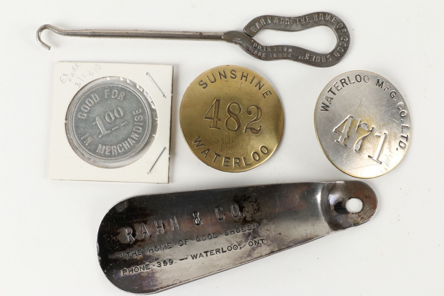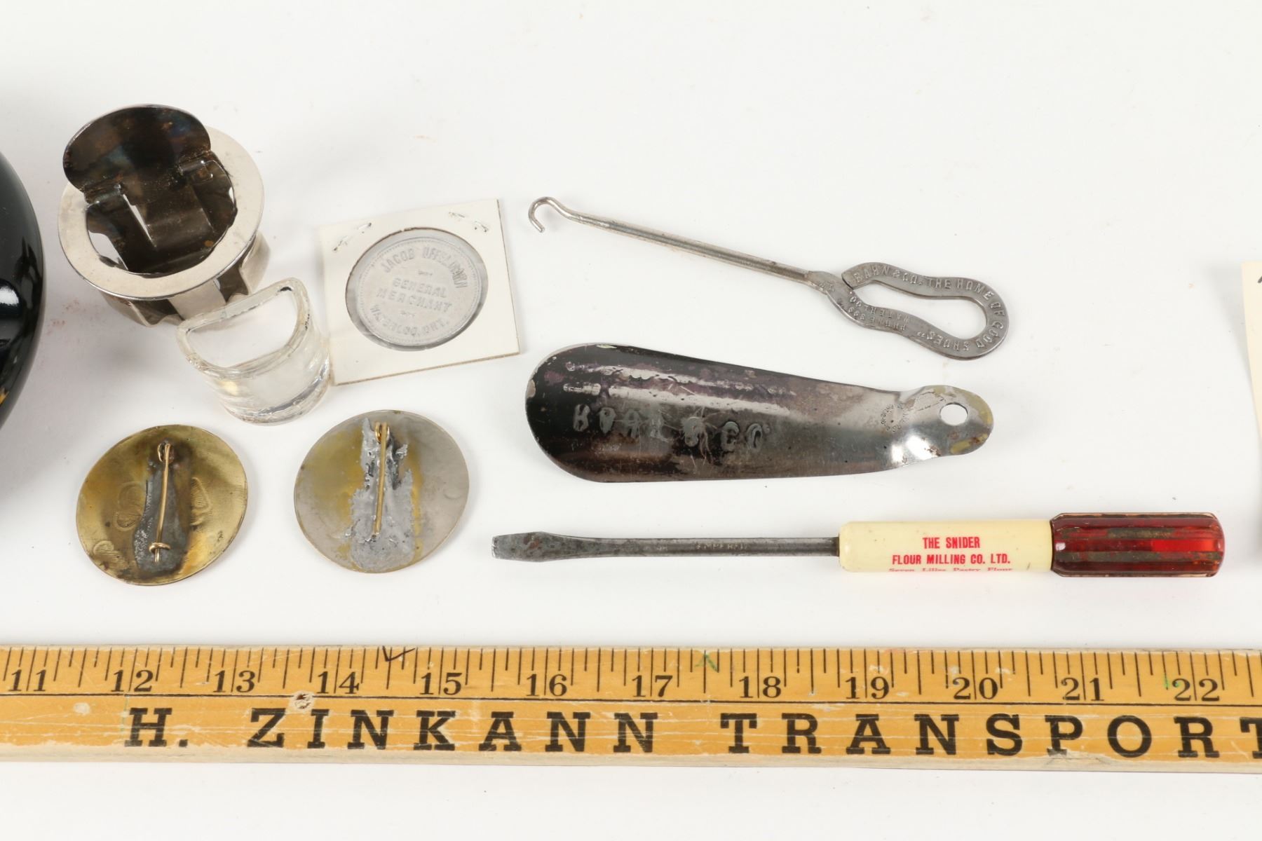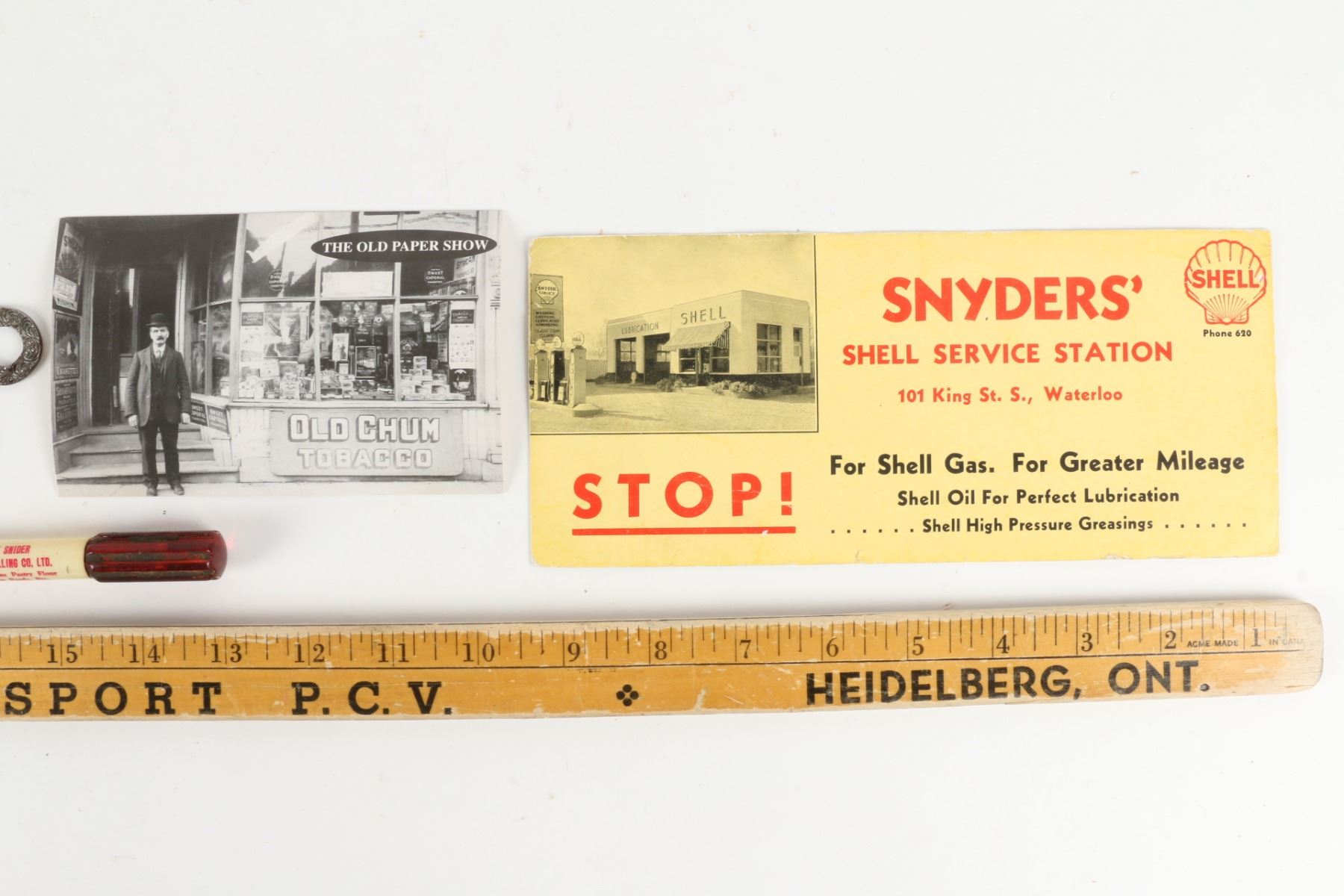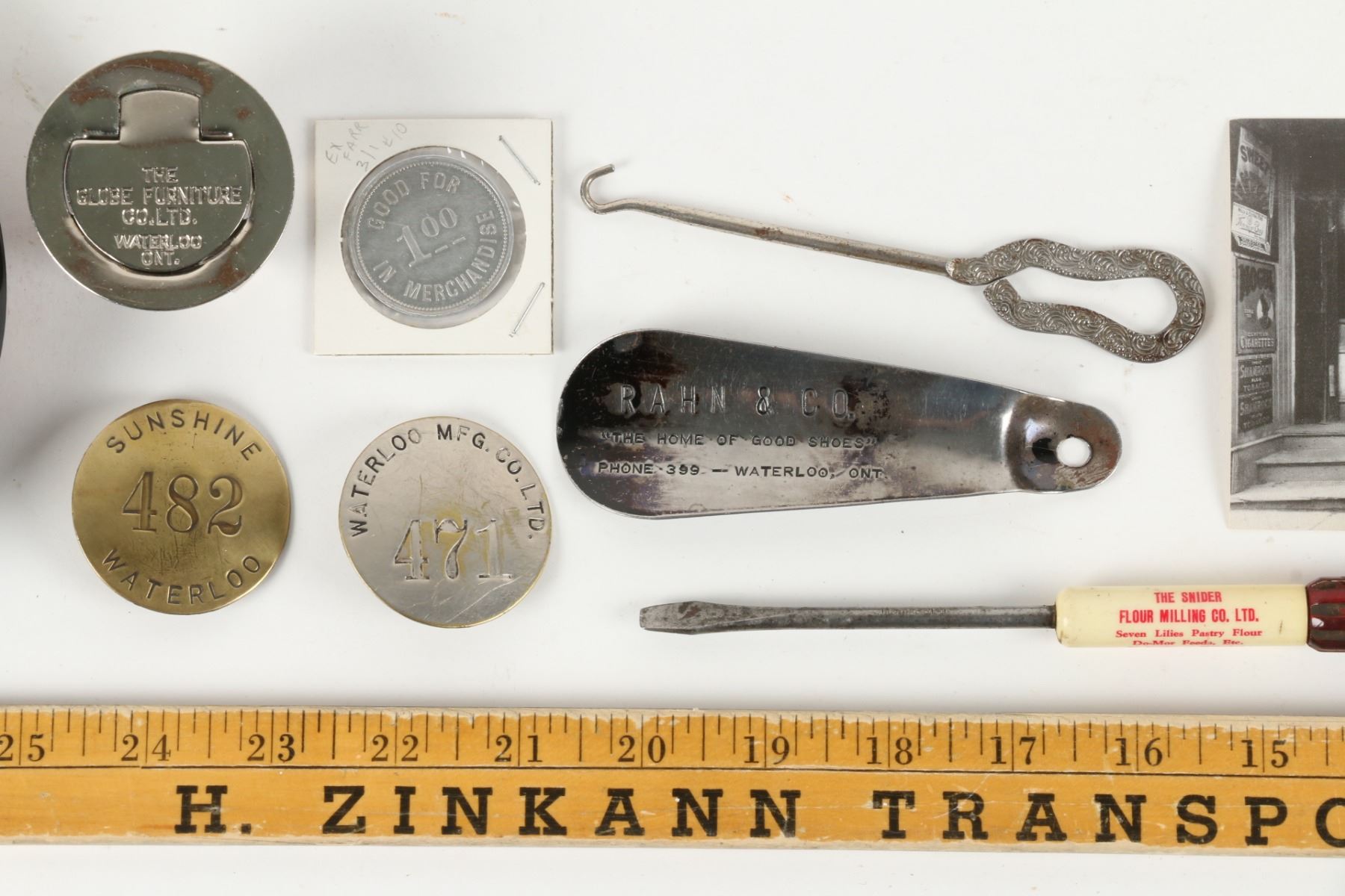 Rahn & Co Shoes, Globe Furniture, Snider Flour Mill, Sunshine Co., Waterloo Manufacturing Co., Snyder‘s Shell. Jacob Uffelmann trade token & Zinkann Heidelberg yardstick. Postcard is a reproduction. $100-150.