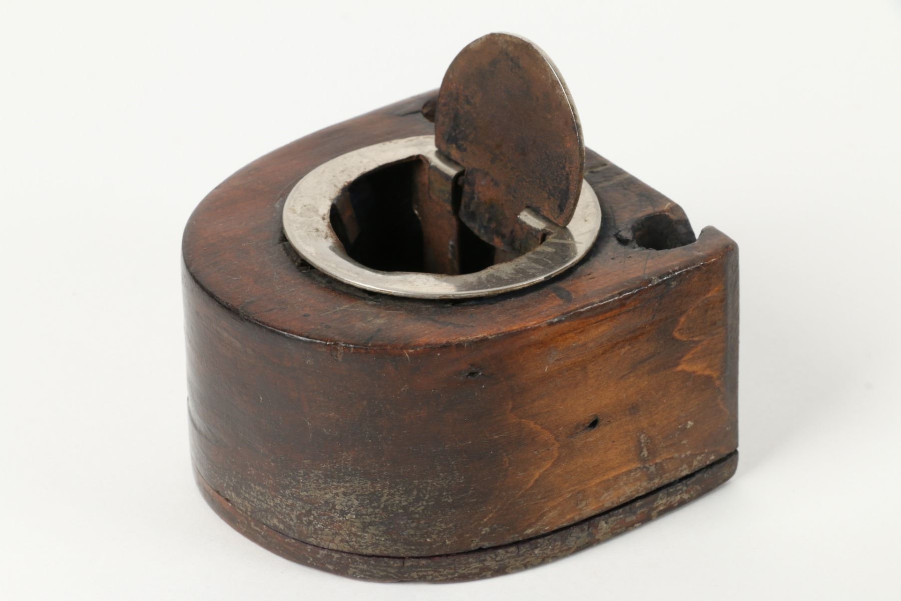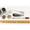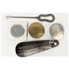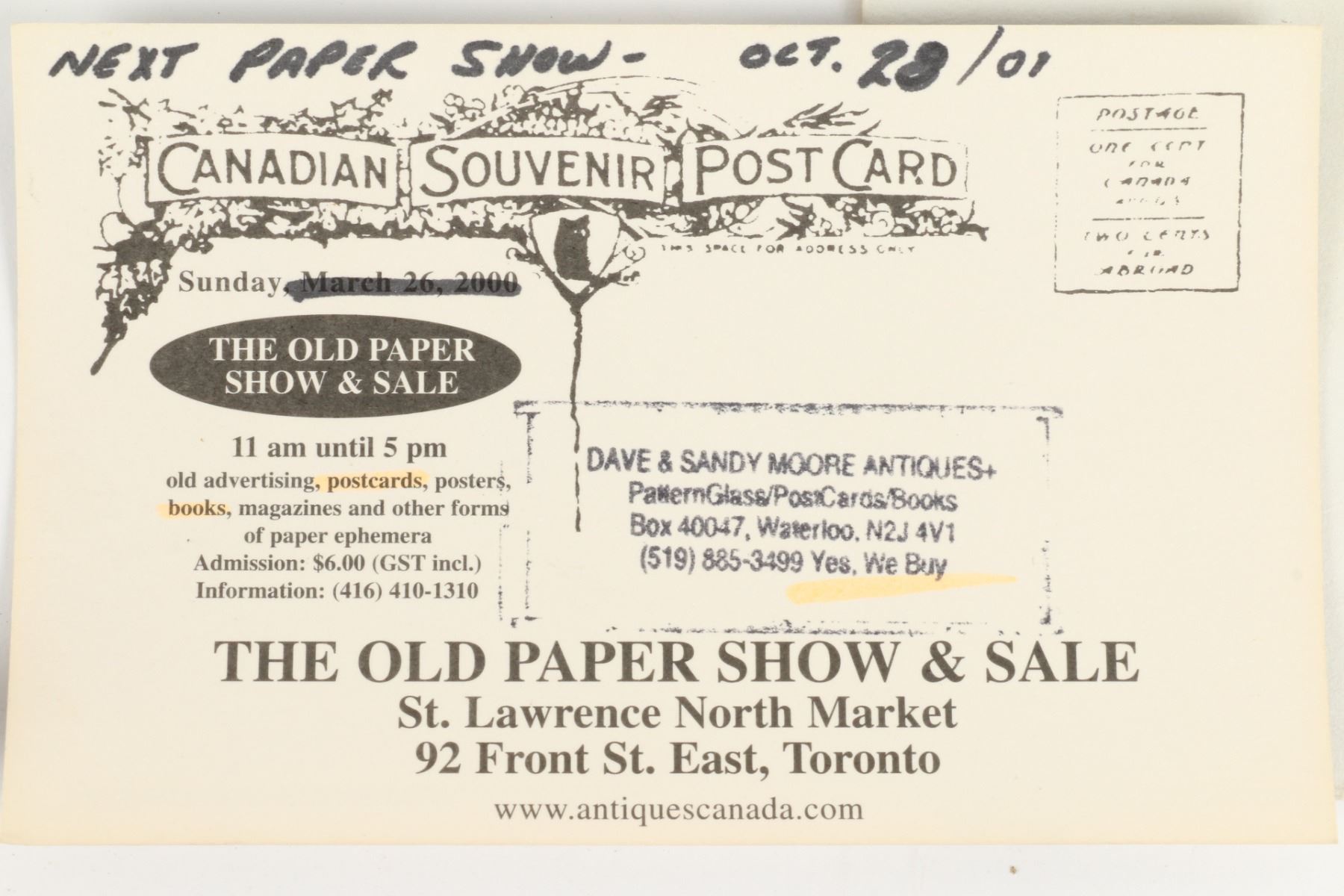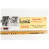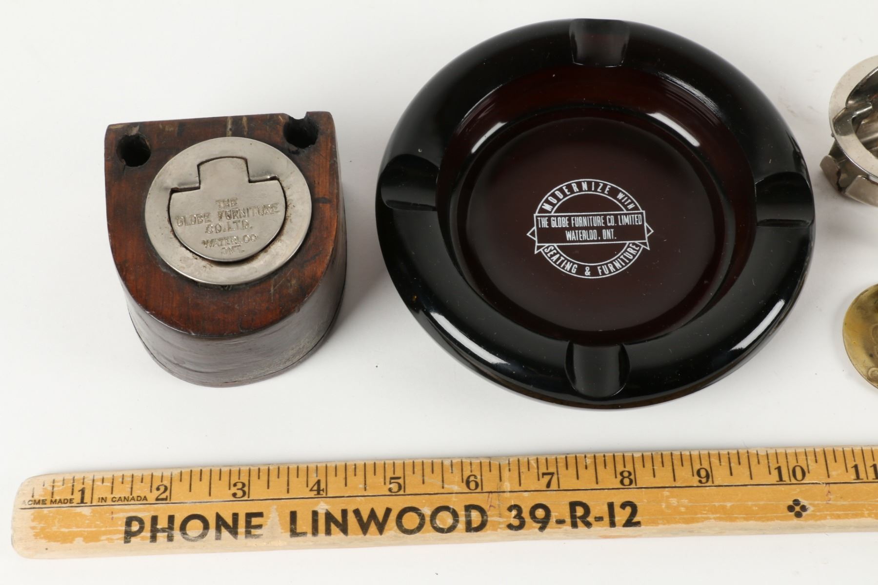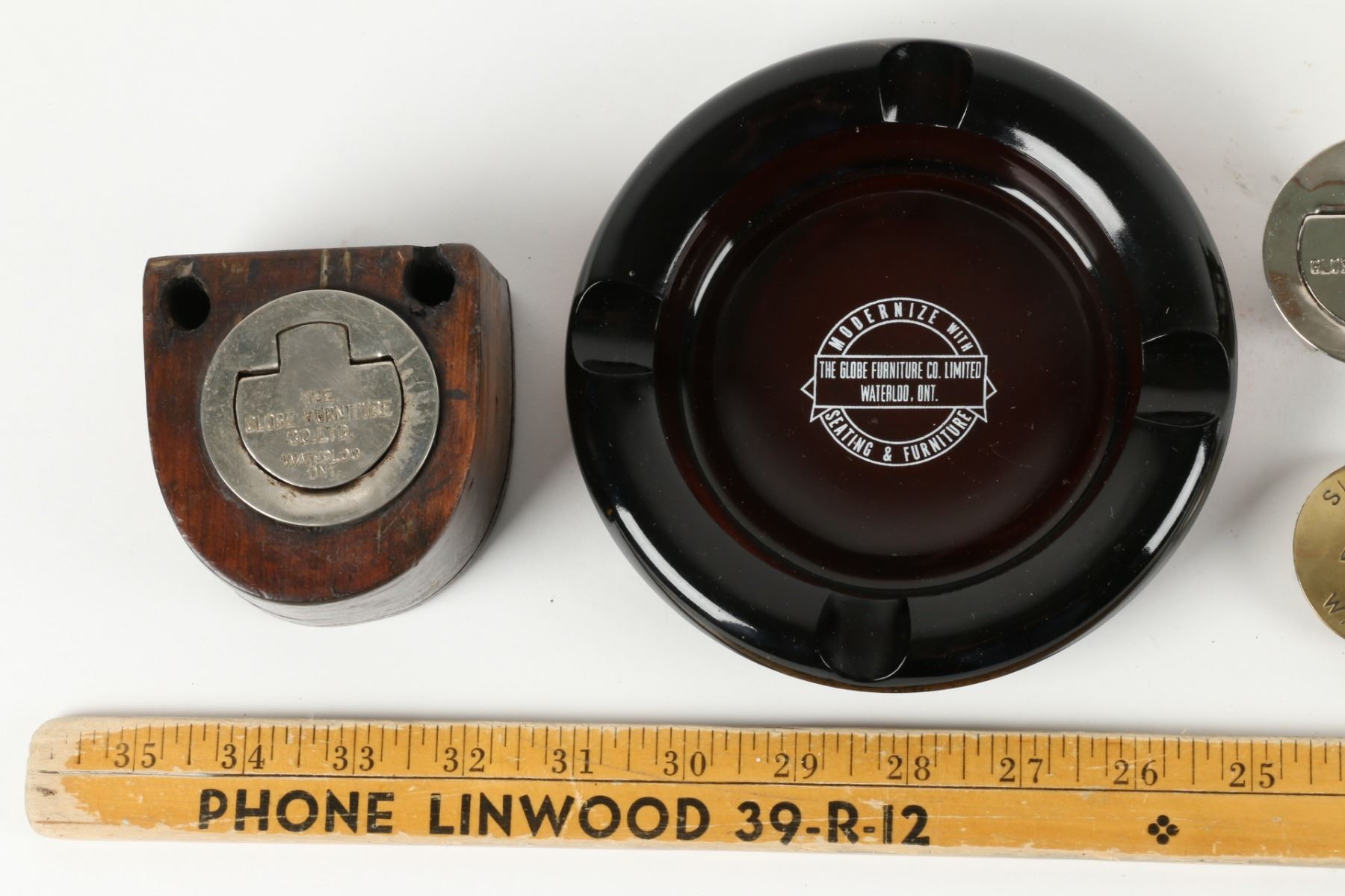 Rahn & Co Shoes, Globe Furniture, Snider Flour Mill, Sunshine Co., Waterloo Manufacturing Co., Snyder‘s Shell. Jacob Uffelmann trade token & Zinkann Heidelberg yardstick. Postcard is a reproduction. $100-150.
