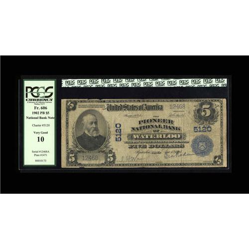 <B>Waterloo, IA</B></I> - $5 1902 Plain Back Fr. 606 <B>The Pioneer NB</B></I> Ch. # 5120<BR>This <B>PCGS Very Good 10</B></I> bears the second and more elusive of the two titles under which this Black Hawk County bank issued large size.