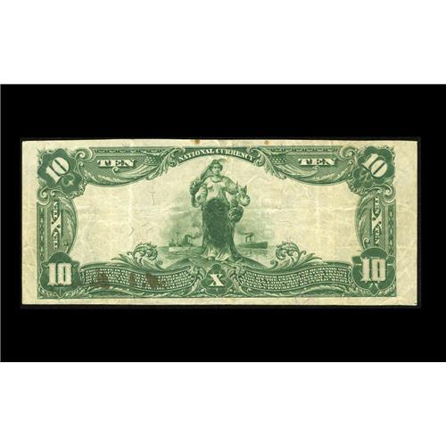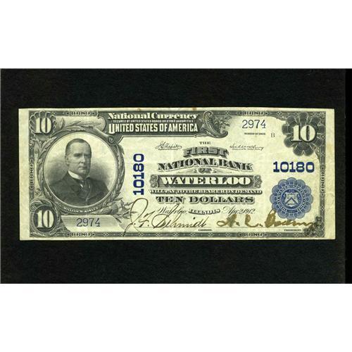 <B>Waterloo, IL</B></I> - $10 1902 Plain Back Fr. 628 <B>The First NB</B></I> Ch. # 10180<BR>Legend has it that an Irishman helped bestow the name onto two competing communities that were separated by a creek in 1818. This <B>Very Fine</B></I> example happens to be only the third $10 Plain Back in the census. The signature of the president is a bit blurred, and two minor oil spots are noted at top center.